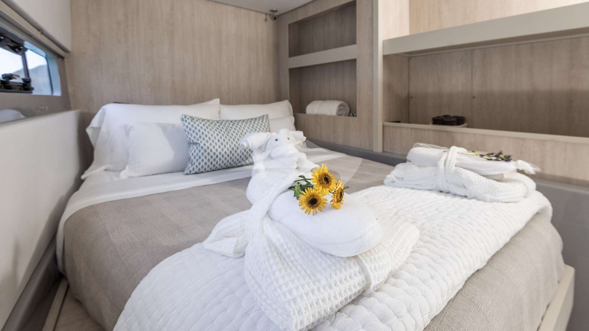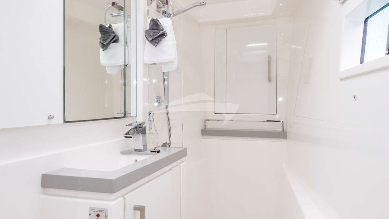 EMYSA offers two spacious queen cabins, and a luxurious master suite complete with its own private coffee station. Every detail speaks to comfort and sophistication: panoramic views through the salon, a breezy flybridge lounge perfect for champagne sunsets, and a foredeck that invites both sun-soaked afternoons and starlit evenings.