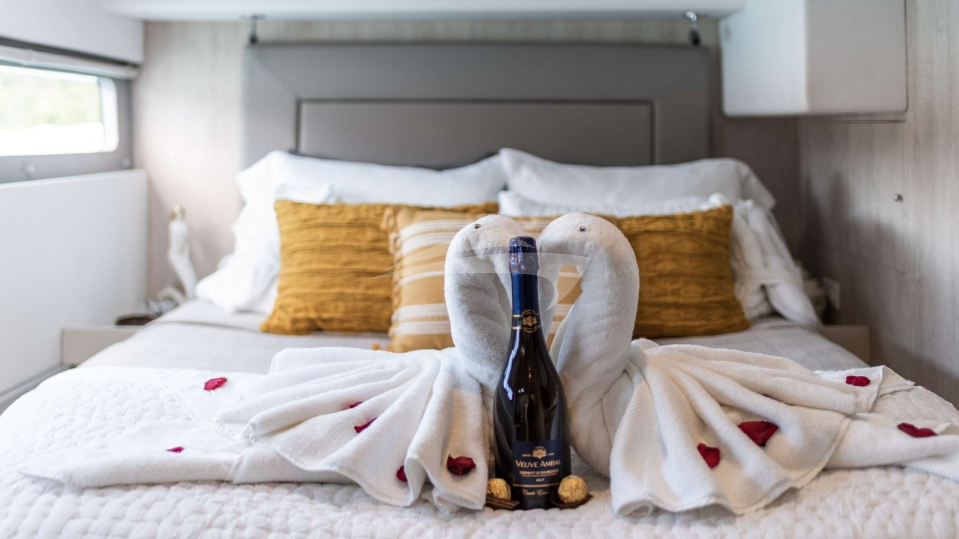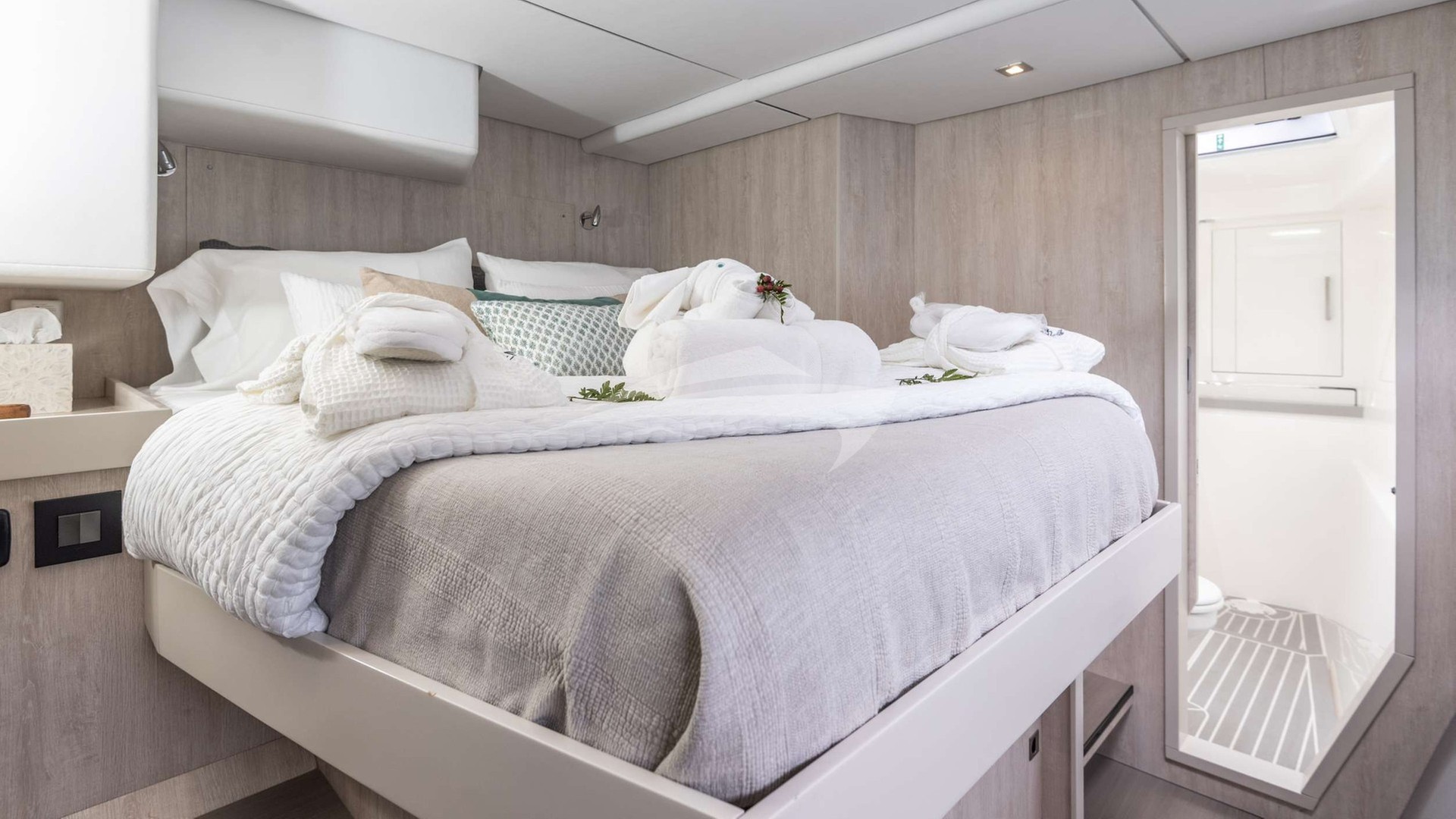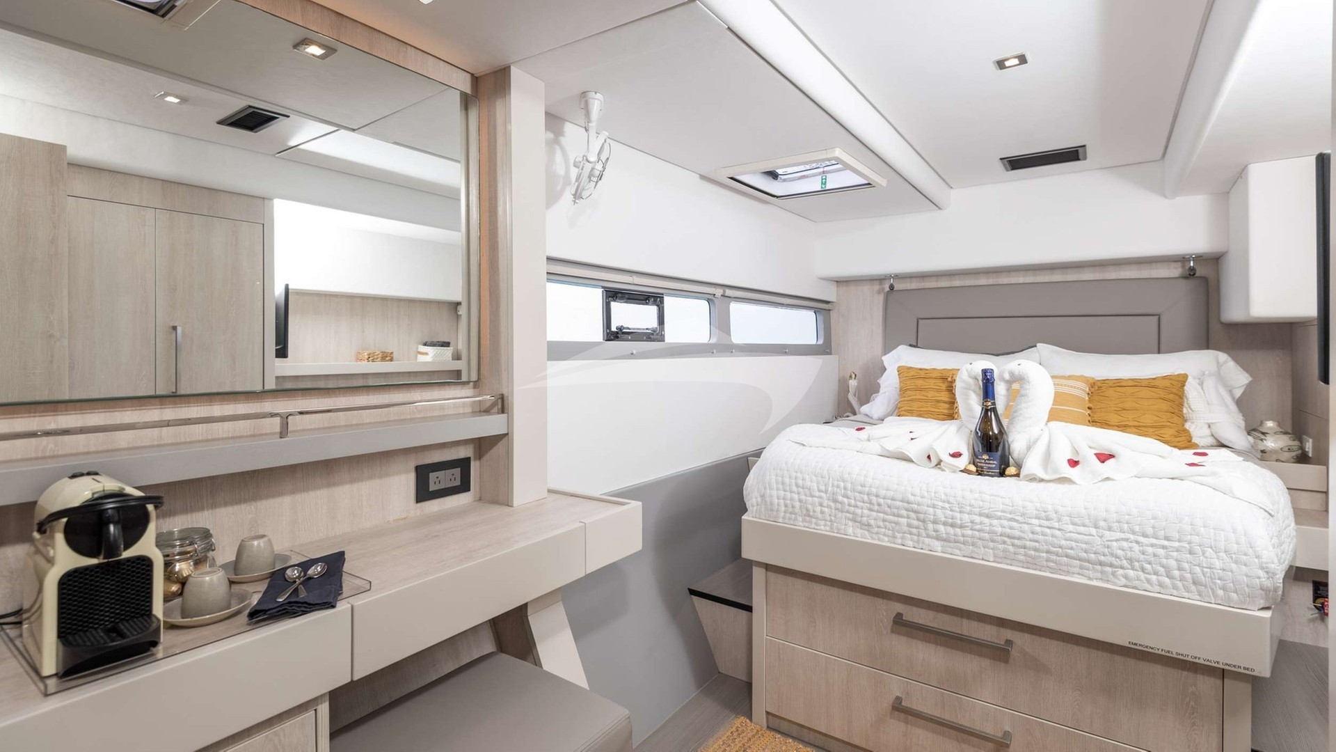 The Master Suite — A private sanctuary complete with a queen berth, spacious en-suite, air conditioning and its own coffee and espresso station for mornings on your terms. refined linens and curated details create