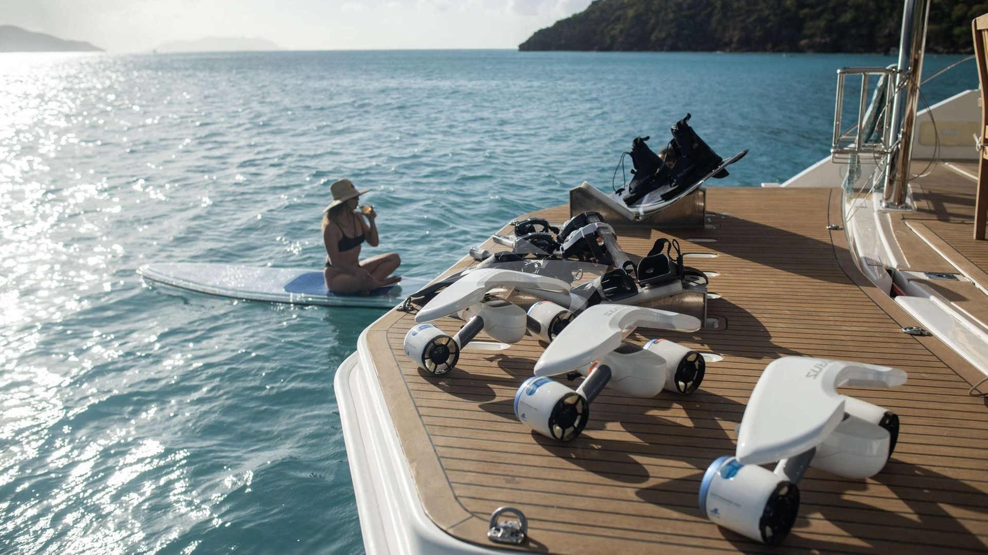 Adventure flows as easily as relaxation. Guests can explore with snorkeling gear, underwater scooters, clear kayaks, paddleboards, wakeboards, and fishing gear — or unwind on an 18-ft floating dock with pool noodles drifting in turquoise seas. NEW THIS SEASON RATES INCLUDE SCUAB DIVING