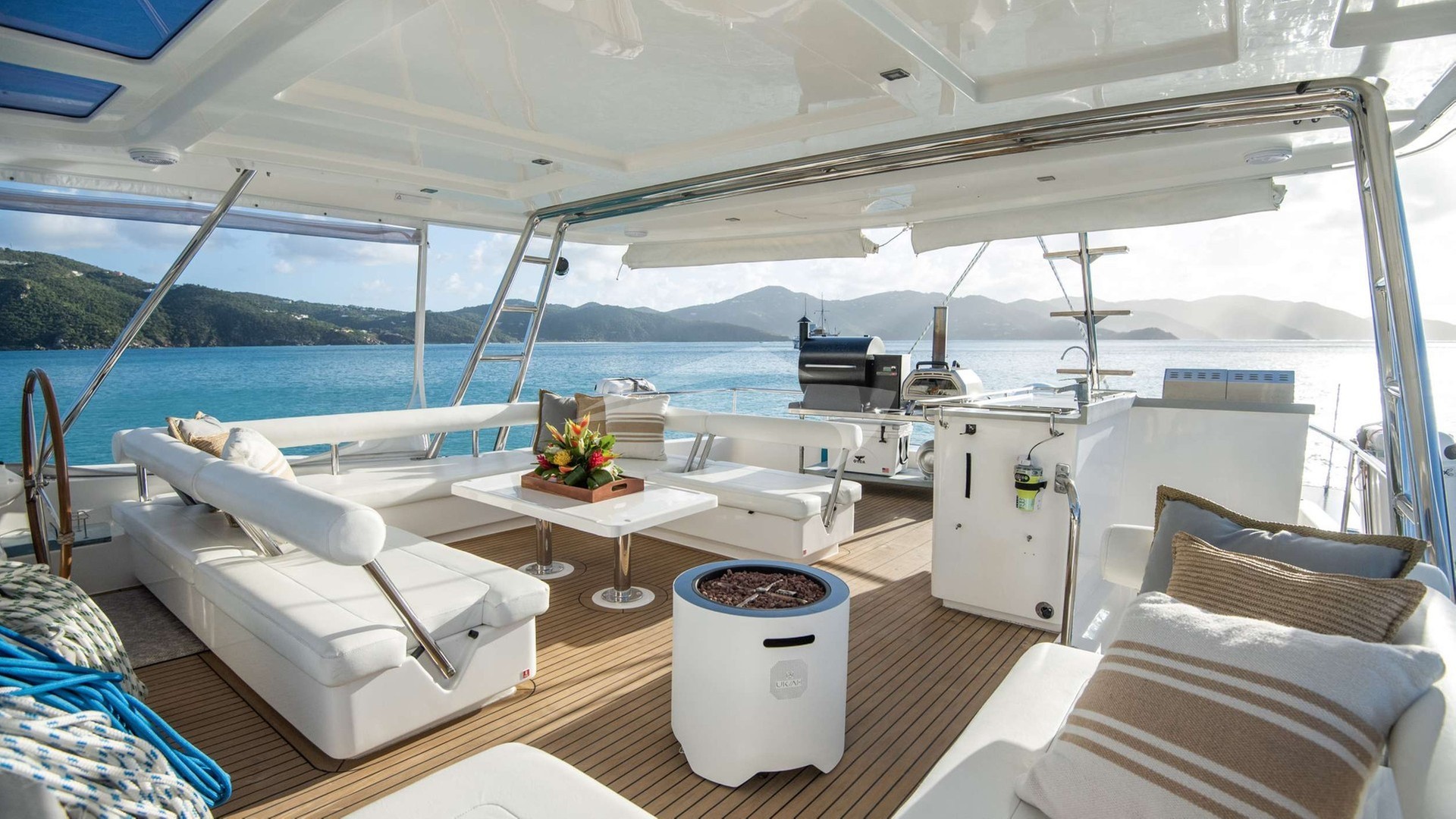 Beyond her striking design, EMYSA is defined by her exceptional amenities. She offers Starlink connectivity, solar panels, air conditioning, water and ice makers, a curated bar stocked to guest preferences, and eco-friendly toiletries. Her culinary pleasures are legendary: from a fully customizable menu to a specialty pizza oven, Traeger grill, and even a daiquiri machine for tropical indulgence.