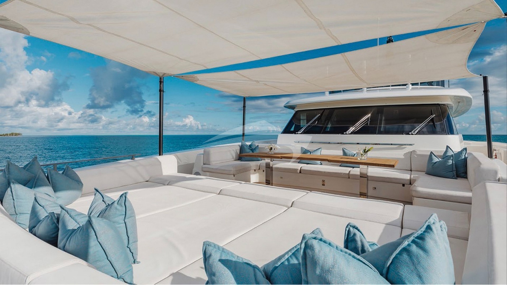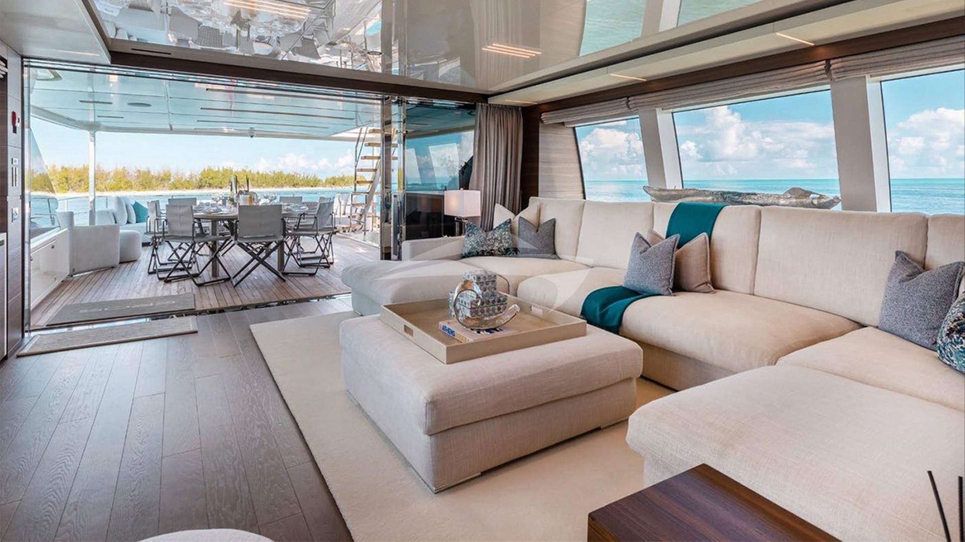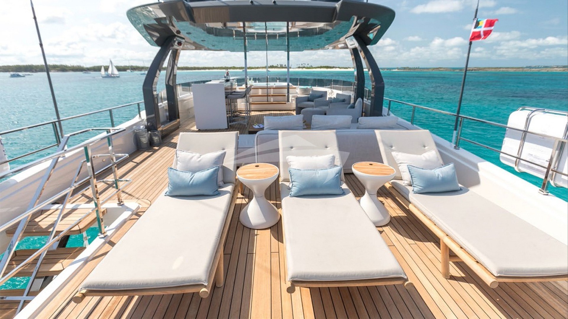 EROS's decks are a true highlight, offering multiple areas for dining, sunbathing, and relaxation. The sun deck features a hot tub with panoramic views, a full-service wet bar, and a retractable awning for flexible shade options. The beach club and swim platform provide the perfect setting for water activities or seaside lounging.