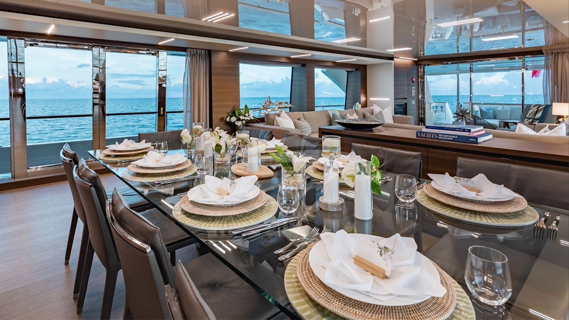 The yacht accommodates up to 10 guests in 5 lavishly appointed suites, including a full-beam master stateroom on the main deck with an office and lounge. The interior showcases exquisite woodwork and finishes, with large windows flooding the spaces with natural light. The main salon offers comfortable sofas and marble tables, while the formal dining room seats 10 guests for gourmet meals.