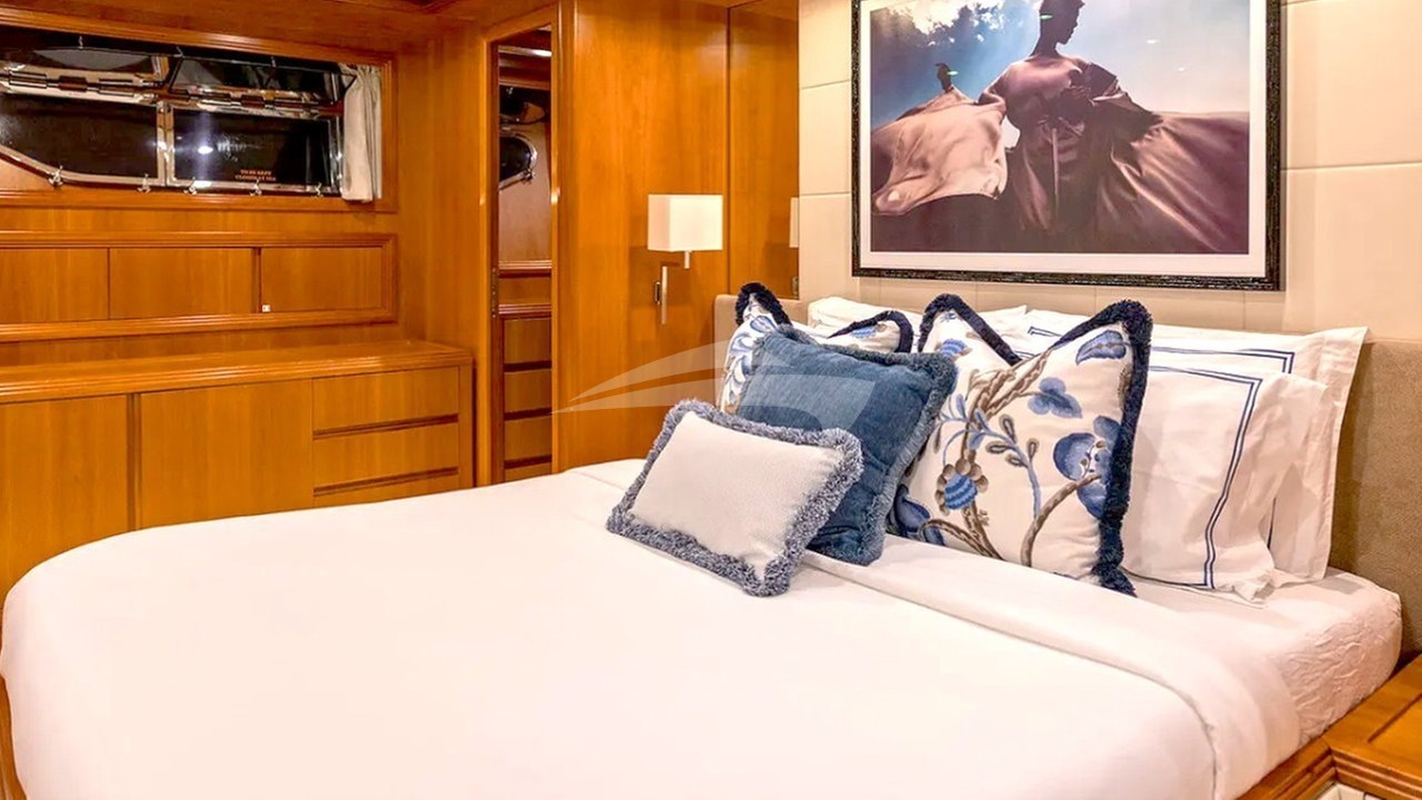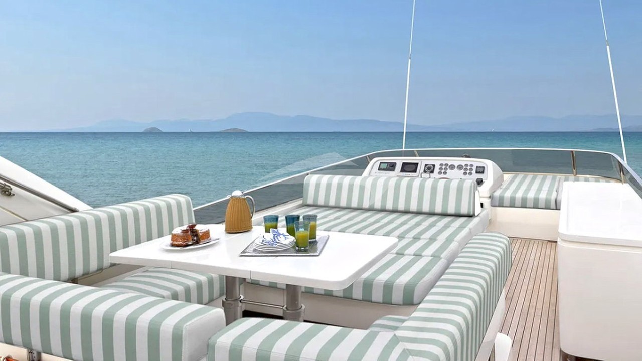 Warm woods and fine marbles together with beautiful furnishings create an elegant and comfortable ambiance. The panoramic windows are full of light with a stunning view of the sea. Her main deck wraps around leading to the spacious foredeck and intimate seating and sunning space. The upper sundeck is well-appointed, featuring a further alfresco dining table, ample seating and shade.