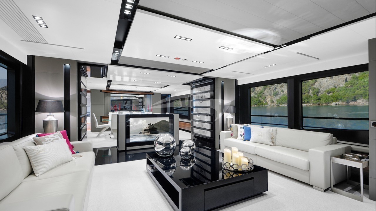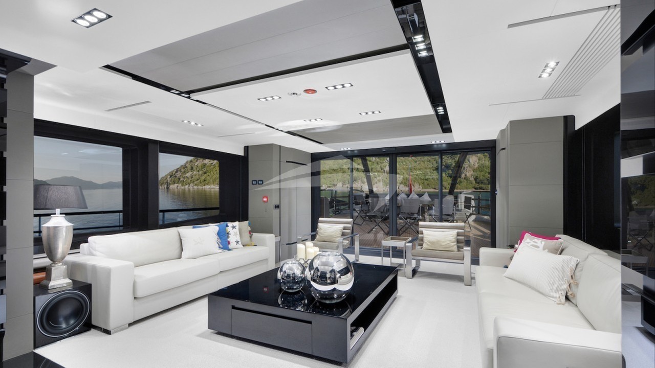 The yacht boasts a modern chic design, 3 dining areas, 2 large external decks and a spacious fly-bridge with jacuzzi, surrounded by sun pads where guests are able to soak up the sun, dance or relax with sundowners. There is an expansive main saloon with huge windows optimising natural light and offering spectacular views of the ocean. Up to 10 guests are accommodated in a full-beam owner's stateroom on the main deck and 4 deluxe staterooms on the lower deck.