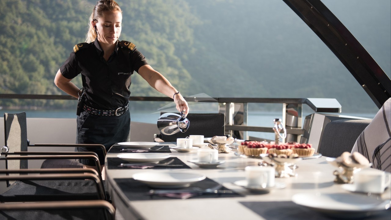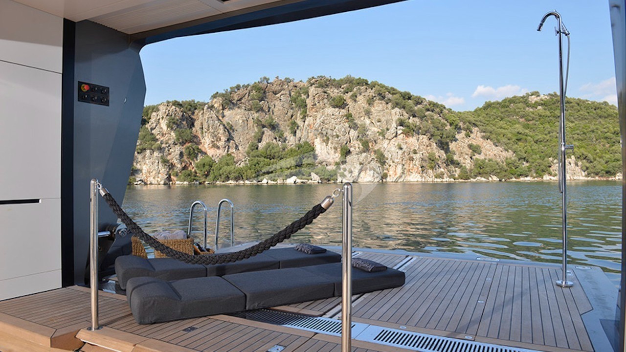 FX carries a large selection of water sport toys accessible from an extended swim platform, with stainless steel railings fitted for extra safety. The yacht carries a compliment of seven crew, all highly experienced, ensuring that guests have a unique and unforgettable experience whilst on board FX.