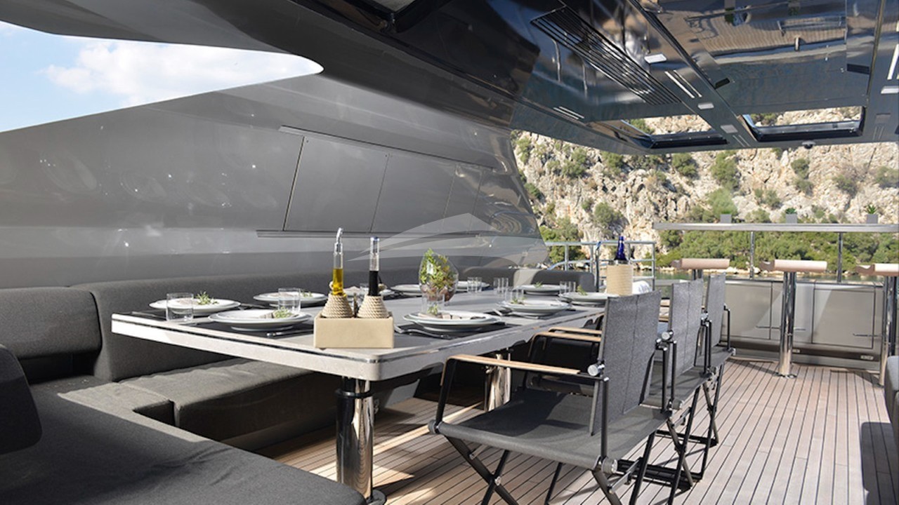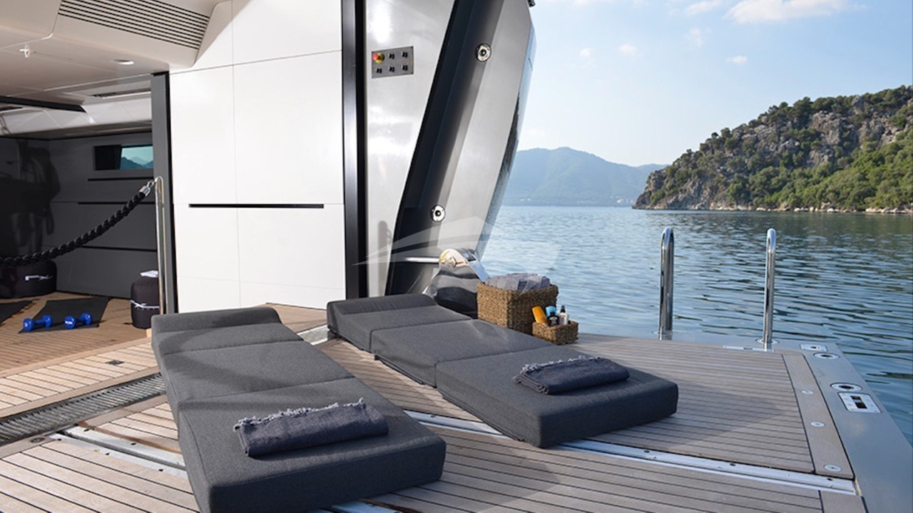 FX's exterior spaces are equally impressive, featuring three distinct dining areas and two expansive external decks. The crowning glory is undoubtedly the spacious flybridge, complete with a Jacuzzi surrounded by inviting sun pads – the perfect spot for soaking up the Mediterranean sun or enjoying cocktails at sunset.