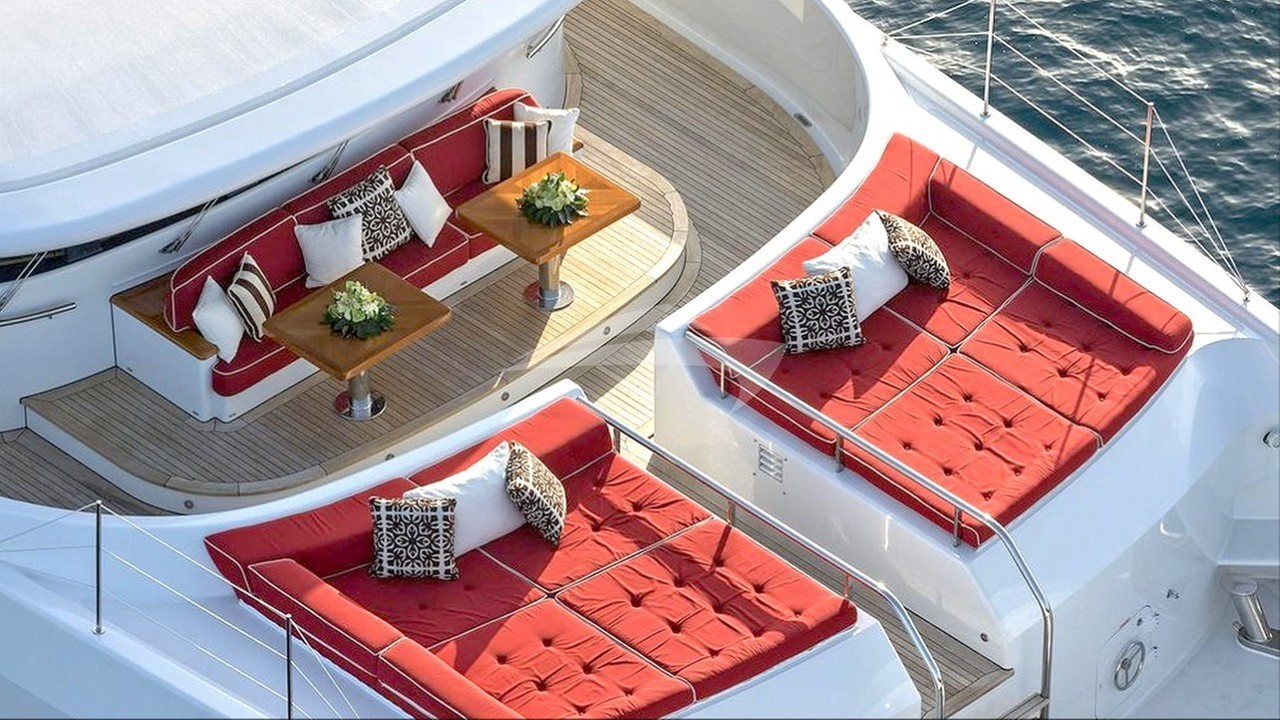 The fore deck offers an alternative sunbathing area, with two grey double sunpads, plus an observation settee. There is also more alfresco dining on the upper deck aft.