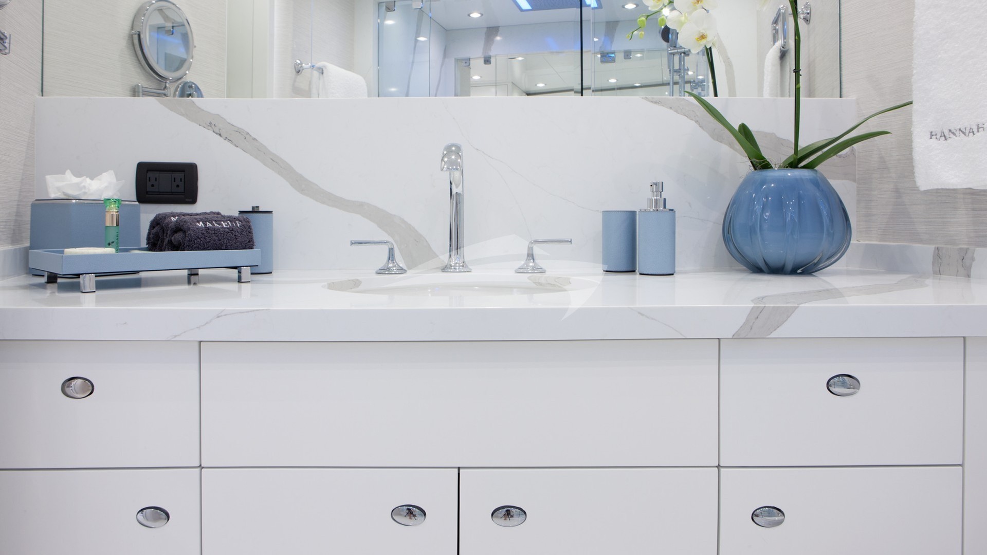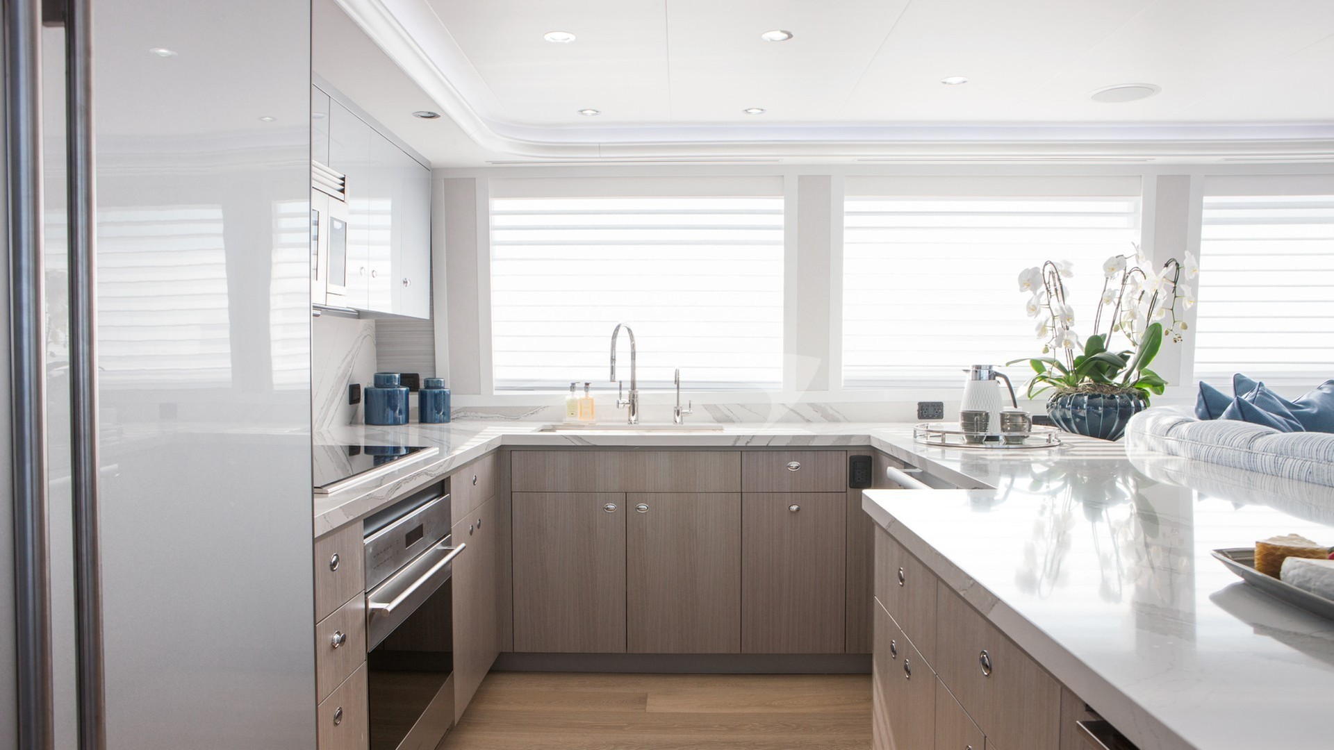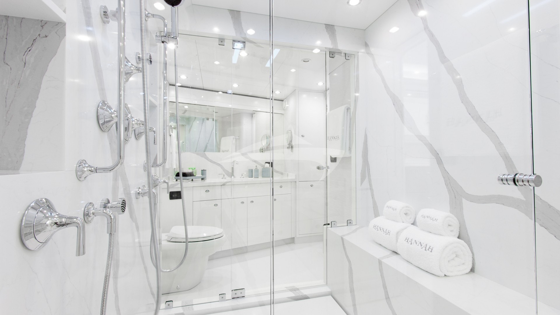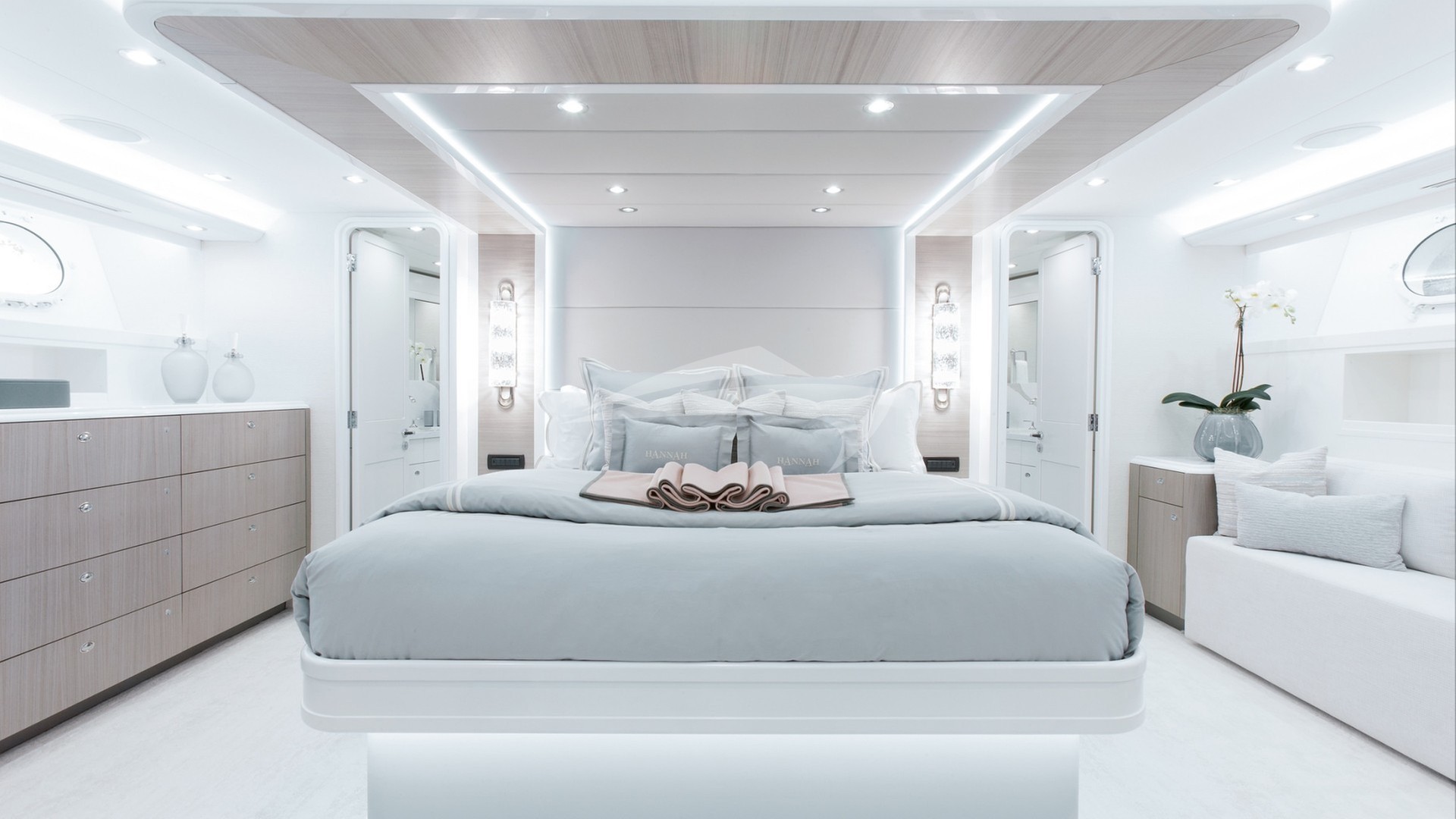 HANNAH had a complete transformation during her extensive nine-month refit completed in December 2020 by world-class designer Destry Darr. She is the most highly customized and modern 112 Westport available for charter on today's market. The idea was to create a high-end contemporary style but with comfortable, charter-friendly appeal. When you enter the main salon the wire brushed oak engineered wood flooring, cool tones of satin pearlescent and grays, plenty of texture and open modern spaces immediately convey a contemporary coastal feel. The hallmark 112 Westport country kitchen forward was upgraded with all-new appliances, Cambria quartz countertops, new television installed and additional cabinetry to starboard. With thorough attention-to-detail, with a project done right - each area of the yacht has been addressed bringing the entire yacht up to 2021 standards.