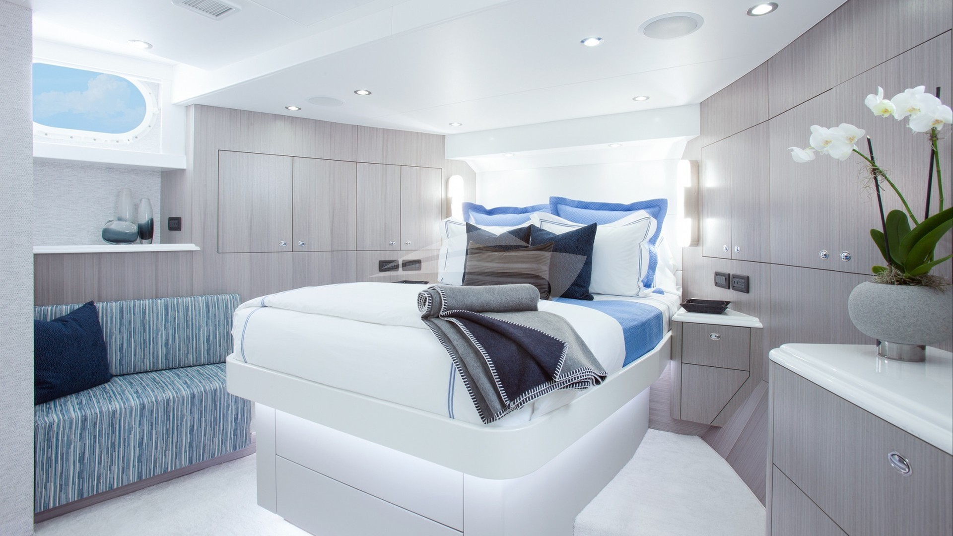 Guest suite port with twin beds plus a pullman berth (twin beds slide together to create a king). Wardrobe Locker.En suite with shower.32" Samsung Flat Screen Television, Smart tablet to control TV and Music
