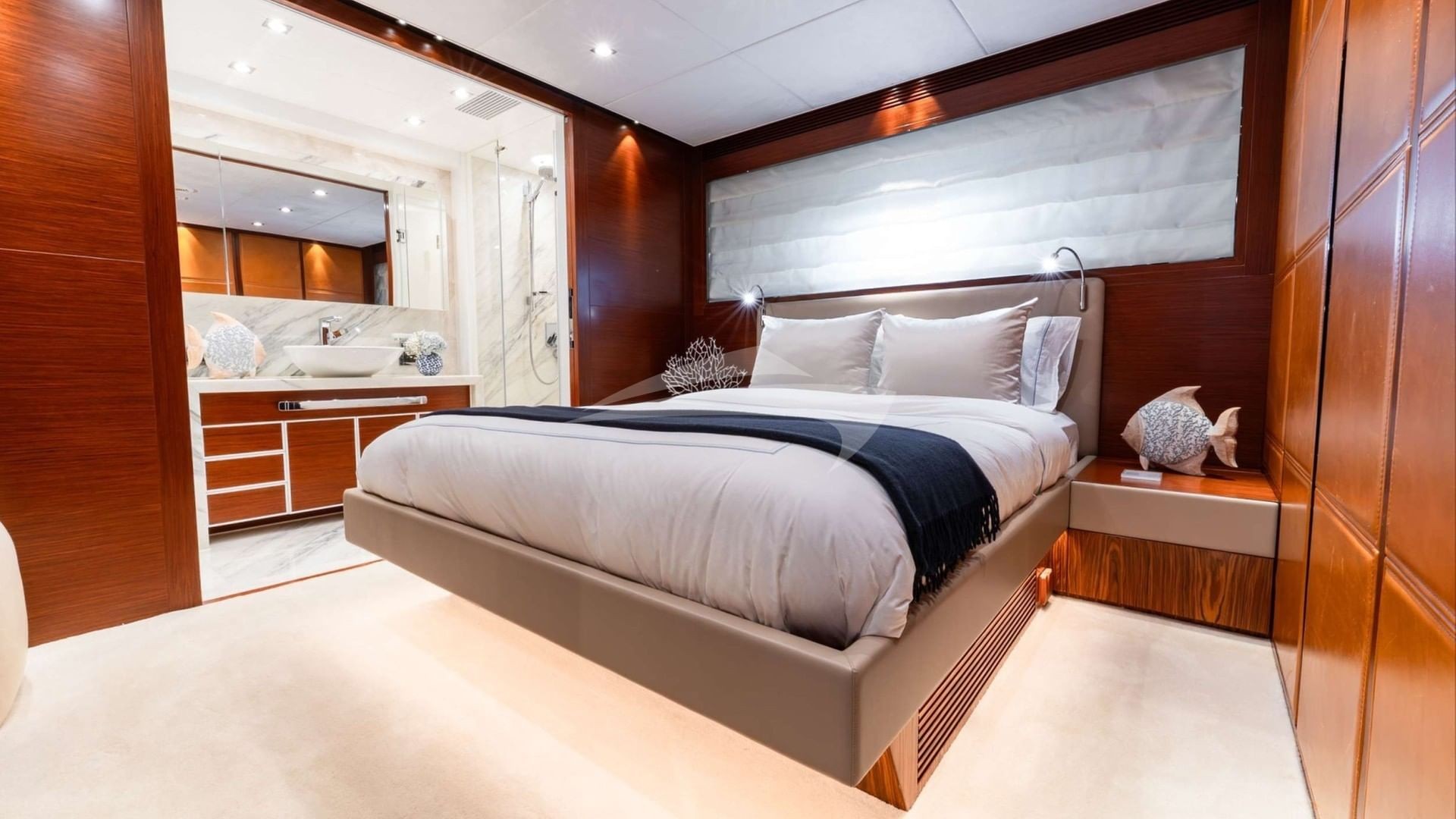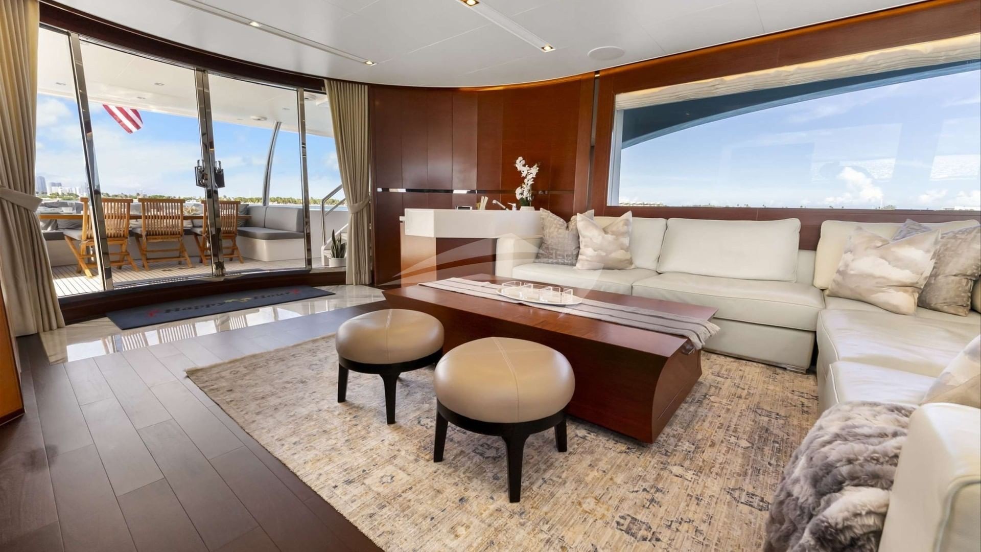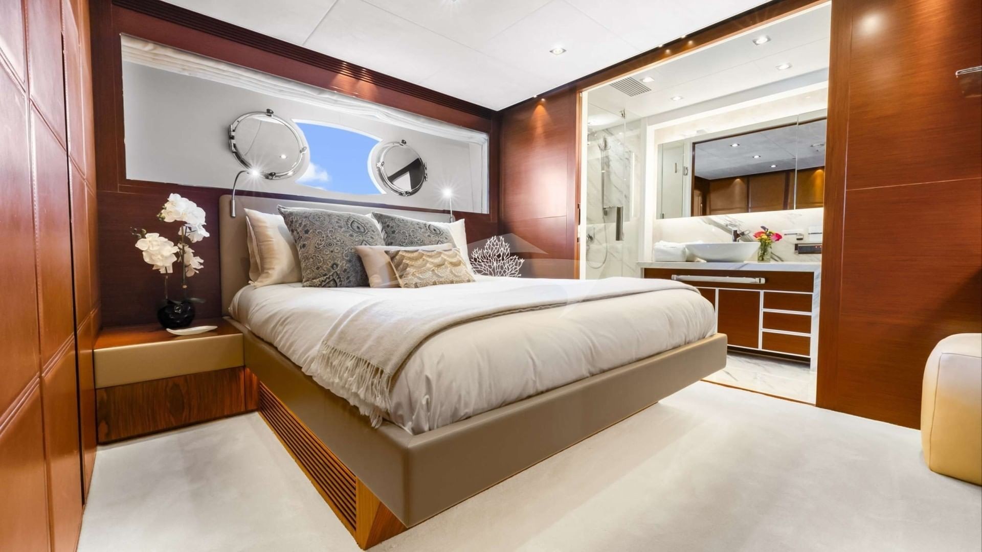Above deck, HAPPY HOUR truly lives up to her name. The expansive flybridge is the ultimate social hub, featuring a jacuzzi, full bar, alfresco dining, and plush lounging areas—the perfect setting to sip cocktails, share stories, and watch the sunset during your very own “happy hour.” Forward, the bow lounge provides an intimate space to unwind with a drink in hand, surrounded by ocean views.