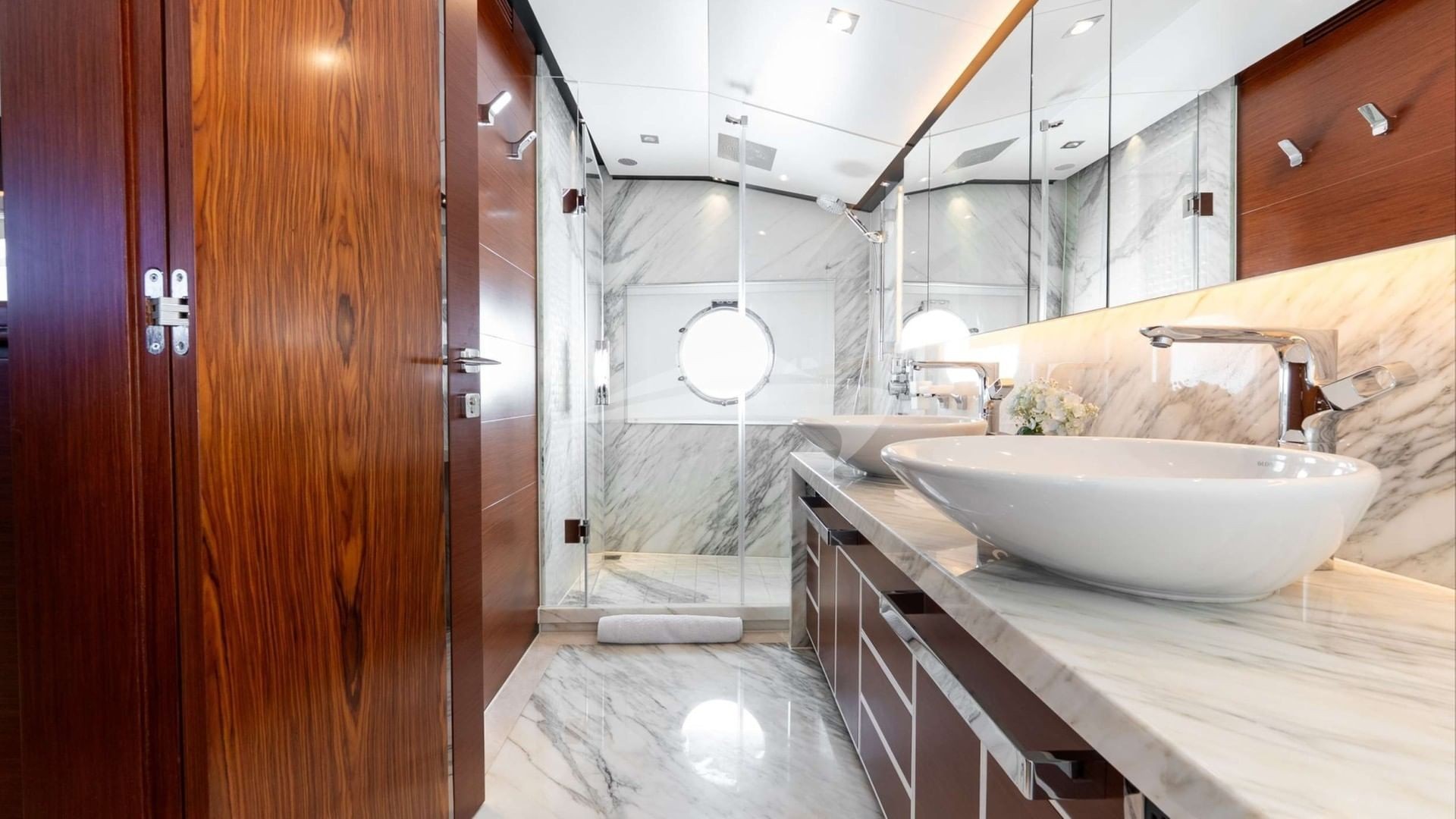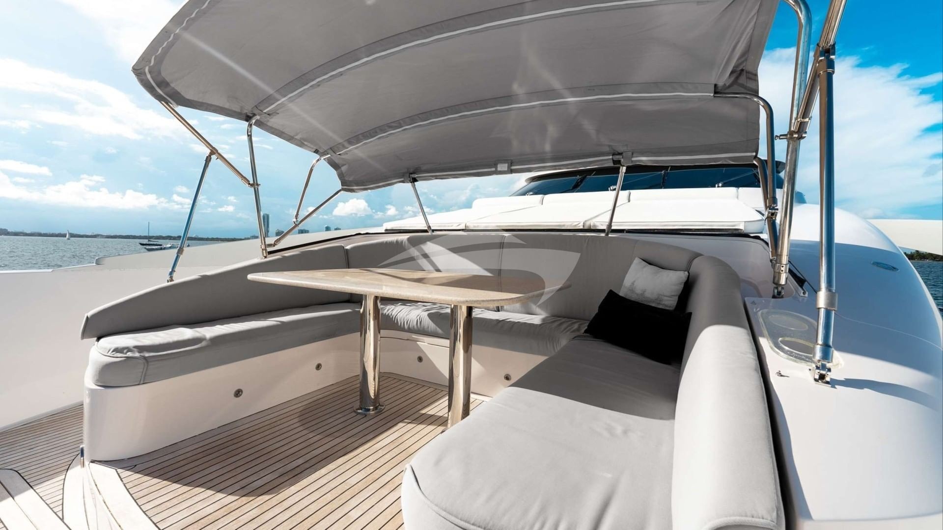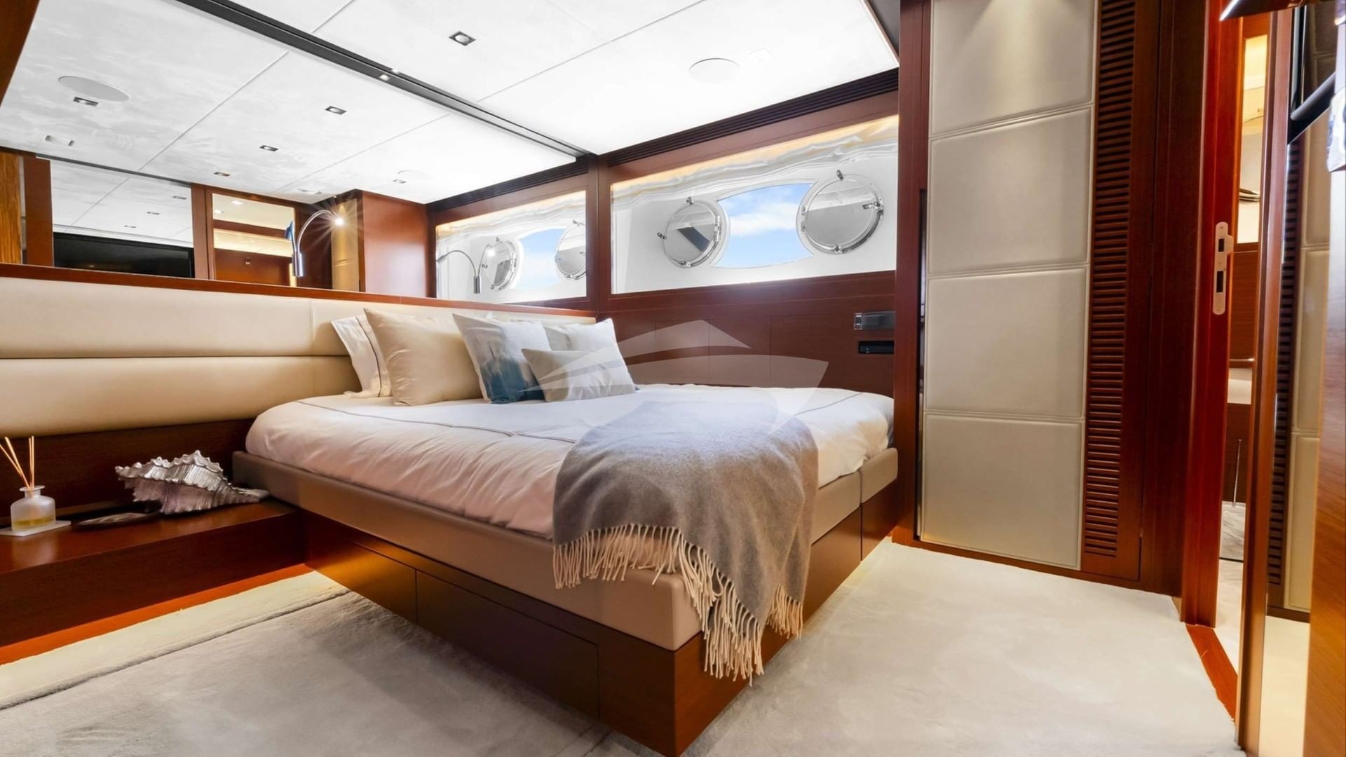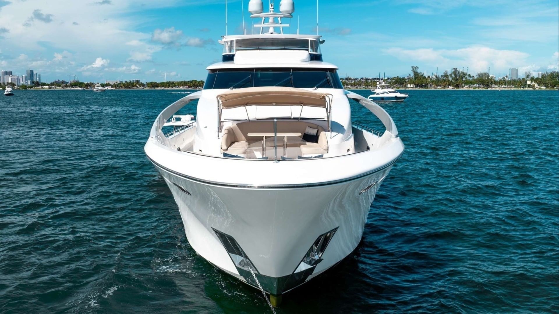 Above deck, HAPPY HOUR truly lives up to her name. The expansive flybridge is the ultimate social hub, featuring a jacuzzi, full bar, alfresco dining, and plush lounging areas—the perfect setting to sip cocktails, share stories, and watch the sunset during your very own “happy hour.” Forward, the bow lounge provides an intimate space to unwind with a drink in hand, surrounded by ocean views.