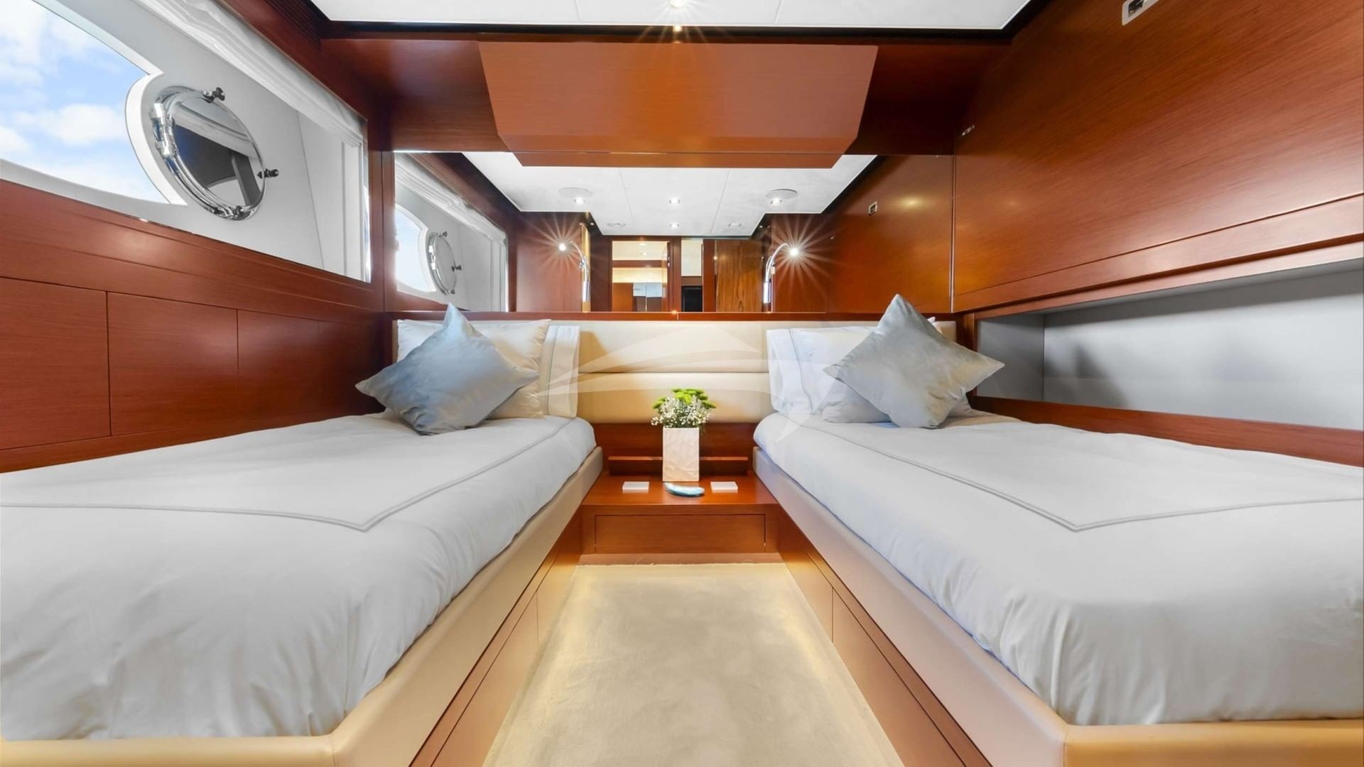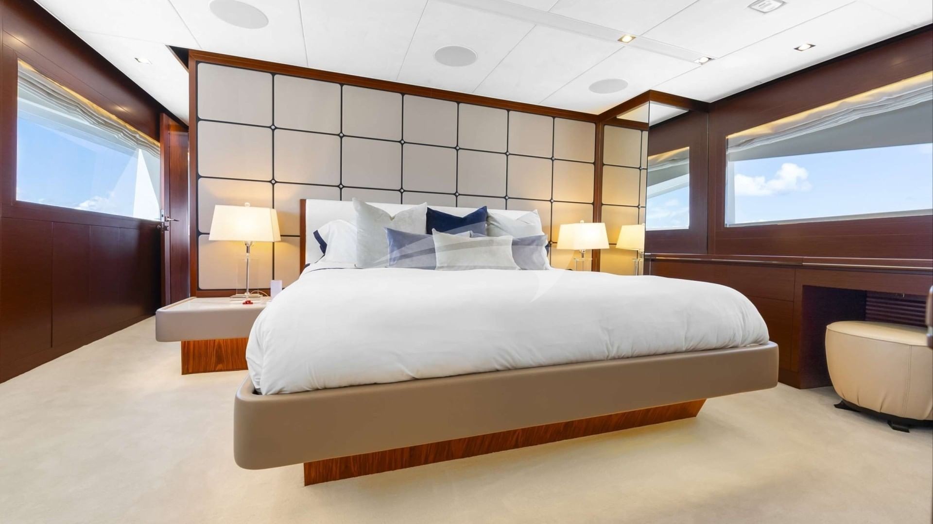 Accommodating up to 10 guests in 5 beautifully appointed staterooms, HAPPY HOUR boasts a full-beam master suite on the main deck offering exceptional space and privacy, complete with a king-sized bed, ample storage, and a luxurious en-suite bath. Below deck, guests will find two elegant queen staterooms, each with its own en-suite, as well as a convertible cabin that can be arranged with either two twin beds or a queen bed. A separate cabin with twin beds and a Pullman provides added flexibility, while another convertible stateroom can also be configured as two twins or a queen, each with its own en-suite bath—ensuring every guest enjoys a private retreat.