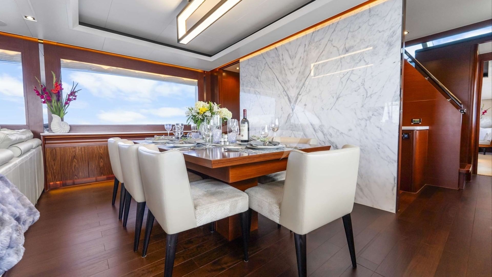 Inside, the spacious main salon offers a sophisticated atmosphere with a formal dining area and comfortable seating, ideal for entertaining or relaxing after a day on the water.