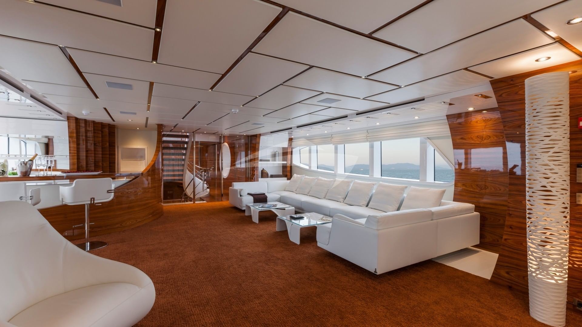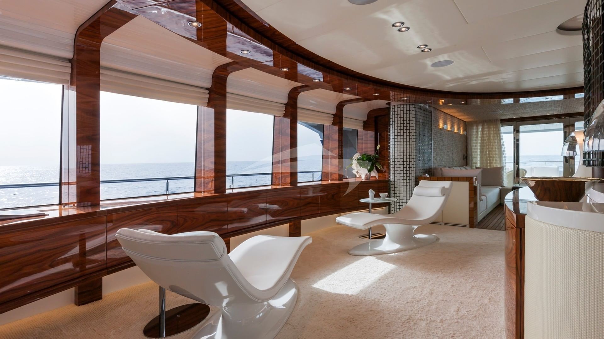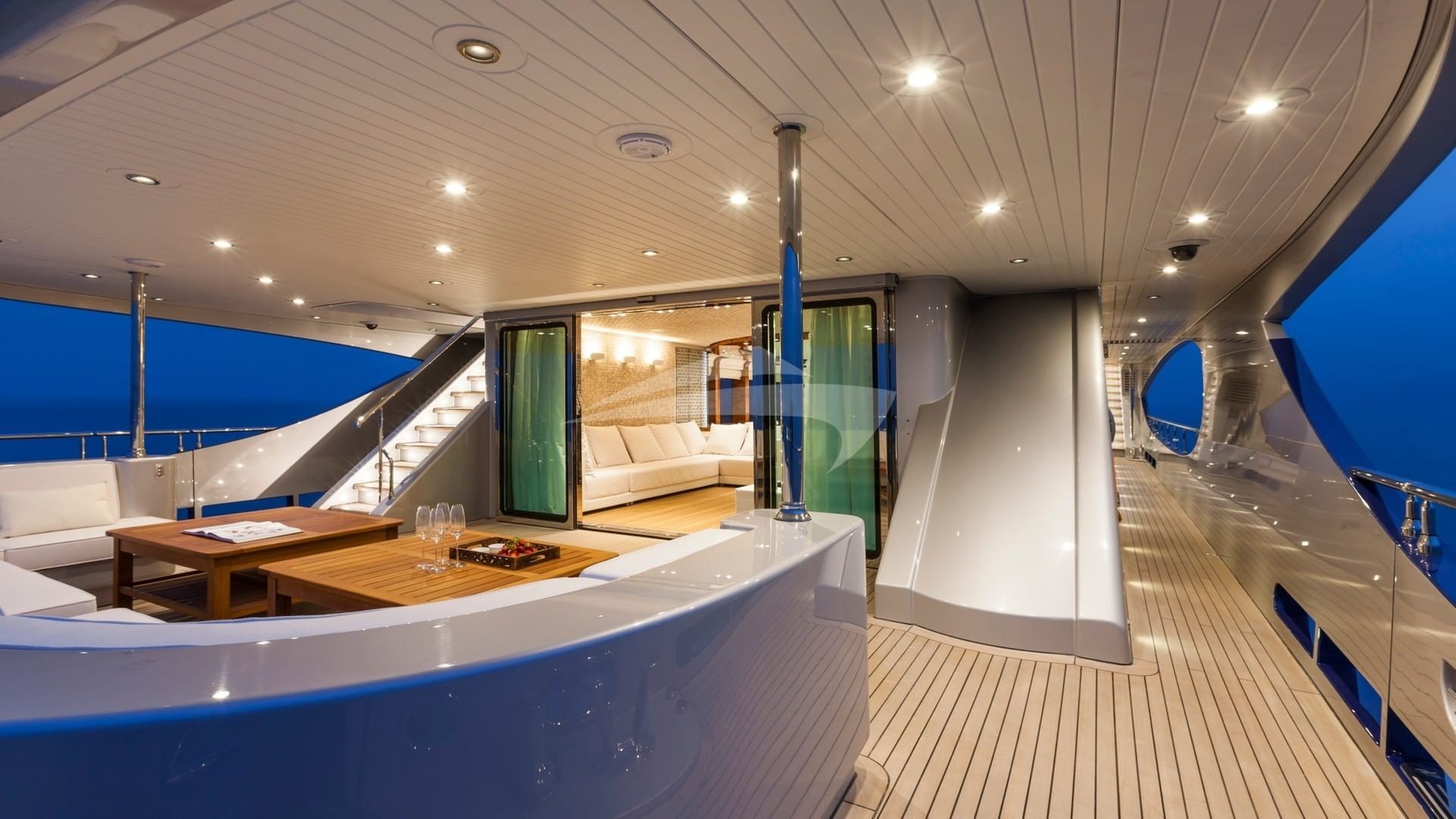Her signature open Atrium design provides 45 feet of unbroken natural lighting, from the very top of the Sundeck all the way down to the Lower Deck. The main deck’s Master Suite uses every inch of this yachts’ 30 foot beam, and includes a CEO’s office and a private fitness area. A graceful wraparound entry way leads to an inviting Jacuzzi and an arcing full-width head. Lounge away in the huge upper sun deck, or the indoor sky lounge, or simply hang out on either of the two covered aft deck areas. This yacht will bring excitement and relaxation to a whole new level. Be one of the first to experience this new yacht as she has just entered the yacht charter fleet and will be lightly chartered by her new owner. This yacht is not available for charter while in US Waters.