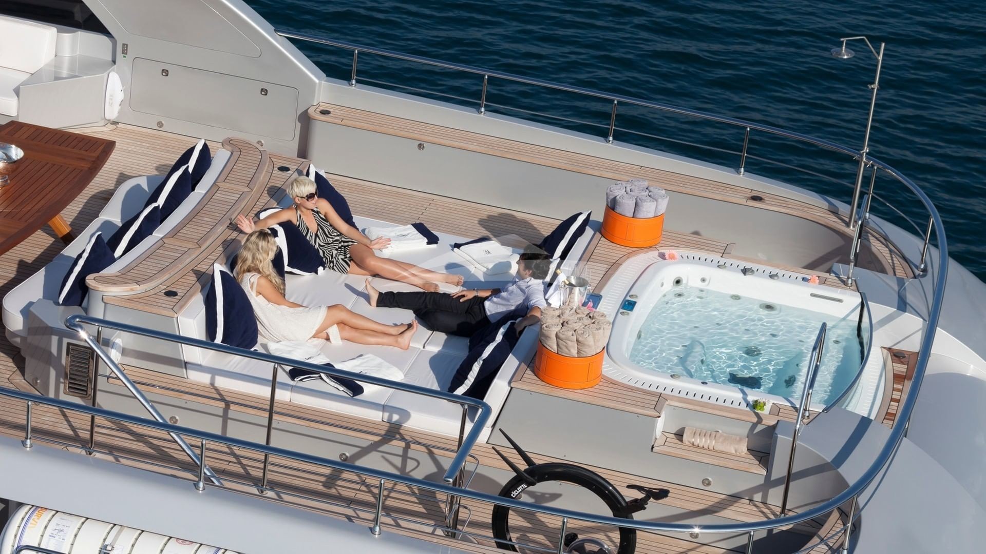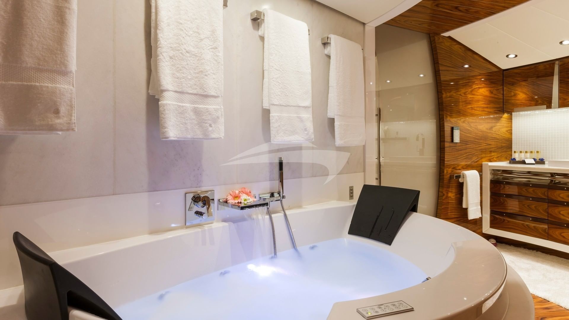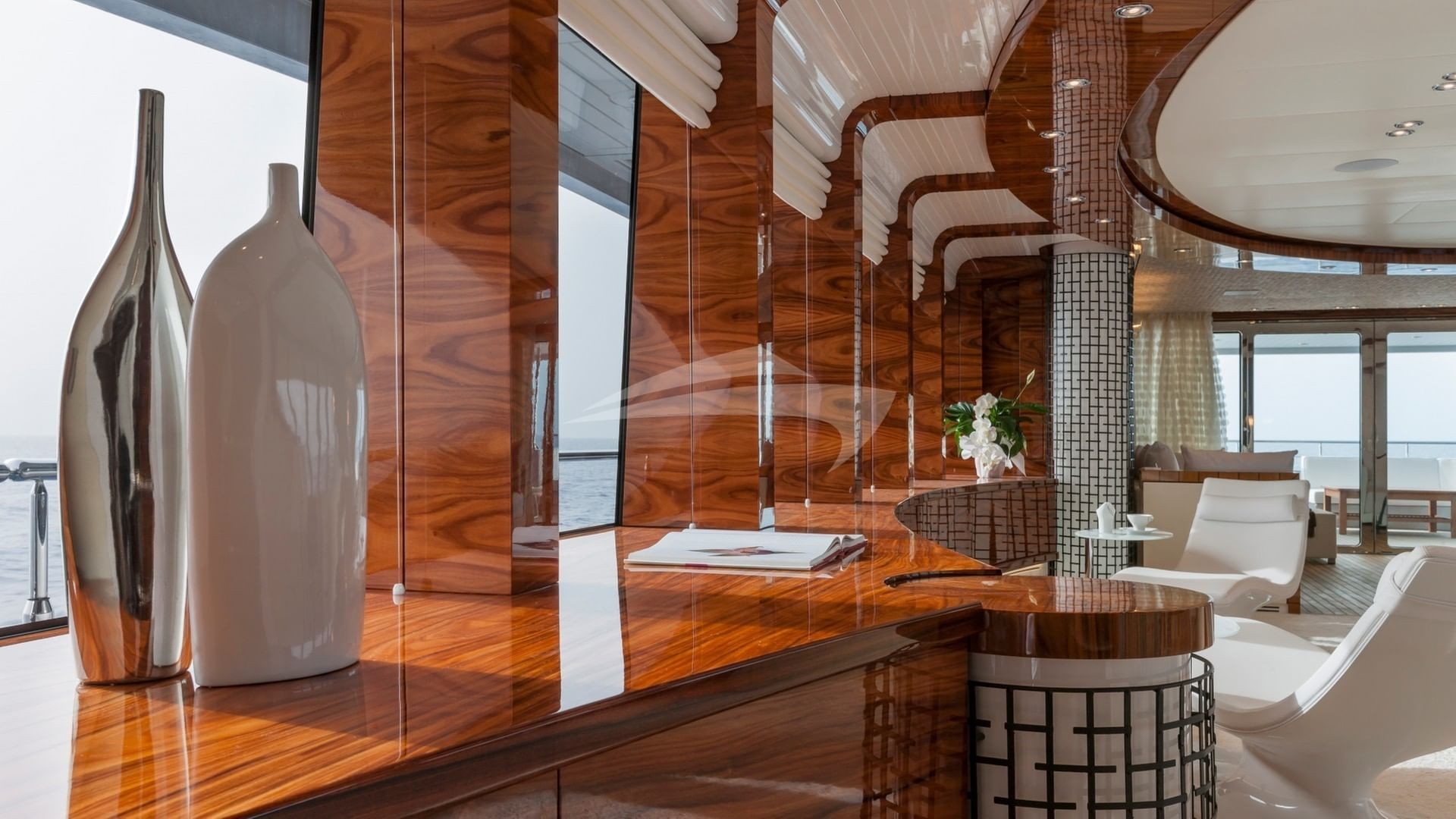 Her signature open Atrium design provides 45 feet of unbroken natural lighting, from the very top of the Sundeck all the way down to the Lower Deck. The main deck’s Master Suite uses every inch of this yachts’ 30 foot beam, and includes a CEO’s office and a private fitness area. A graceful wraparound entry way leads to an inviting Jacuzzi and an arcing full-width head. Lounge away in the huge upper sun deck, or the indoor sky lounge, or simply hang out on either of the two covered aft deck areas. This yacht will bring excitement and relaxation to a whole new level. Be one of the first to experience this new yacht as she has just entered the yacht charter fleet and will be lightly chartered by her new owner. This yacht is not available for charter while in US Waters.