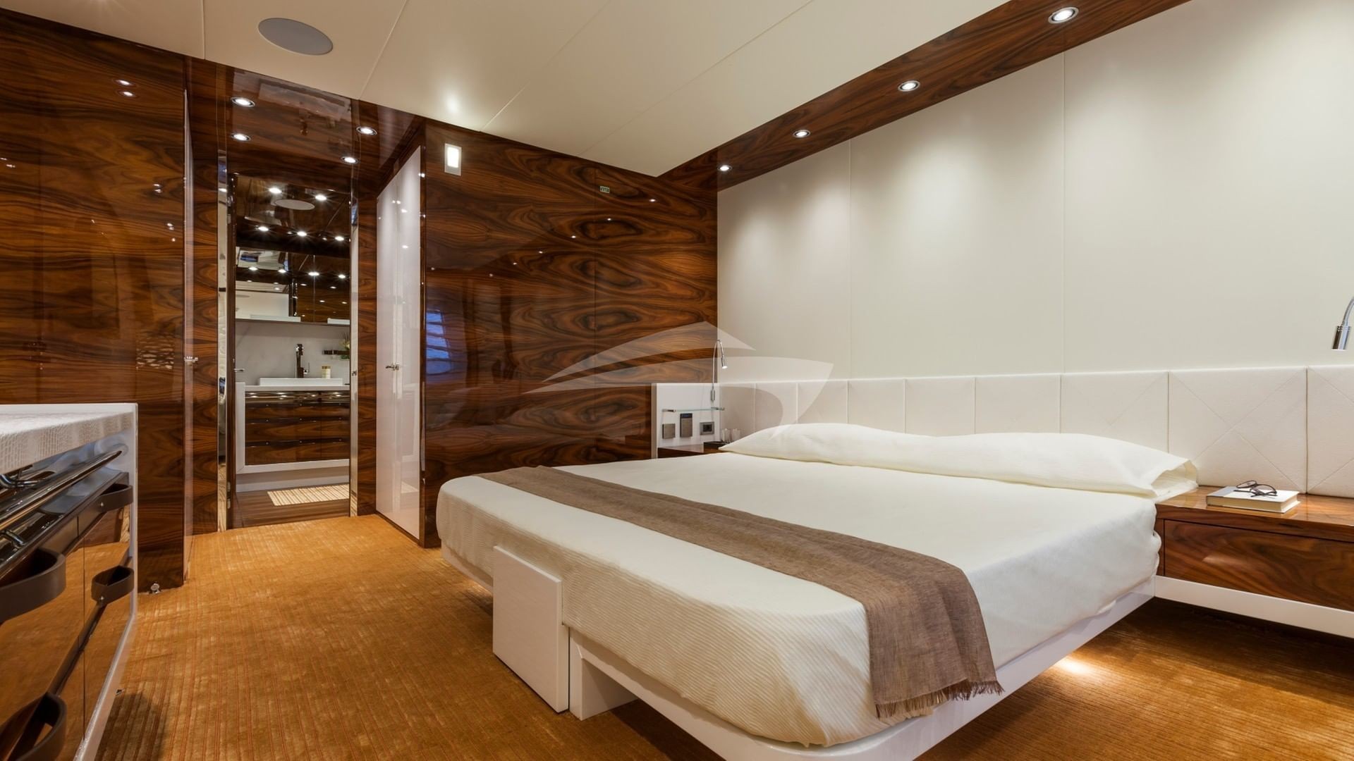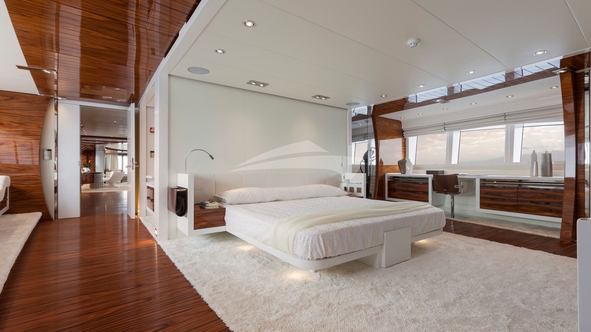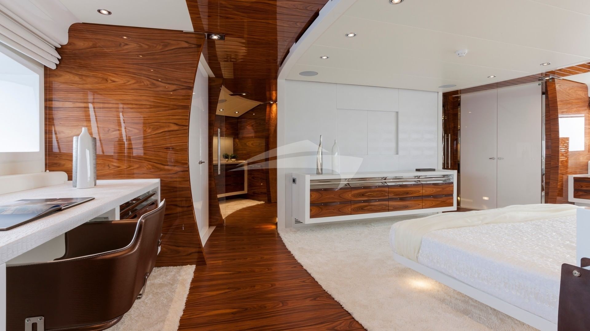 This is a 5 stateroom plus an on-deck master offering up to 12 passengers a design that is totally unique with easy access to the foredeck from the boat deck on the port side and the main deck on the starboard side, creating a massive full beam, on-deck master stateroom. In addition to 6 owner and guest staterooms, the yacht has comfortable accommodations for her award winning Captain and crew. The yacht is designed for the crew to go about their duties in relative obscurity. The main tender is hidden away in the garage as are the wave runners and other toys. The crew also has an additional tender to service the yacht that is tucked away on the forward areas of the yacht.