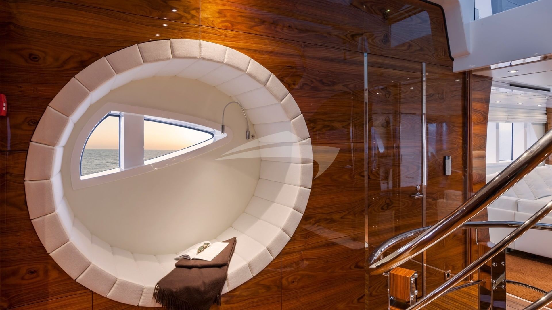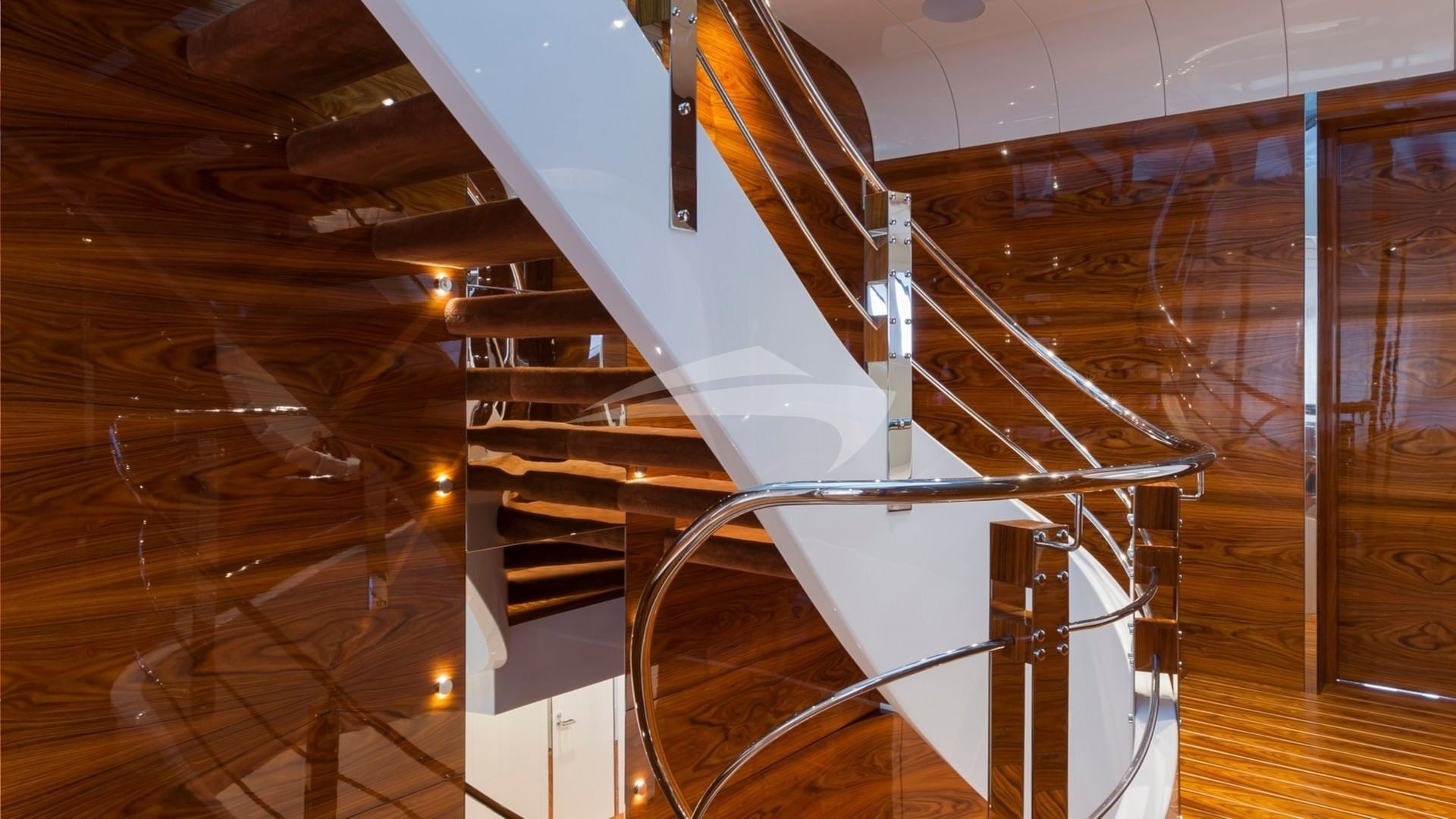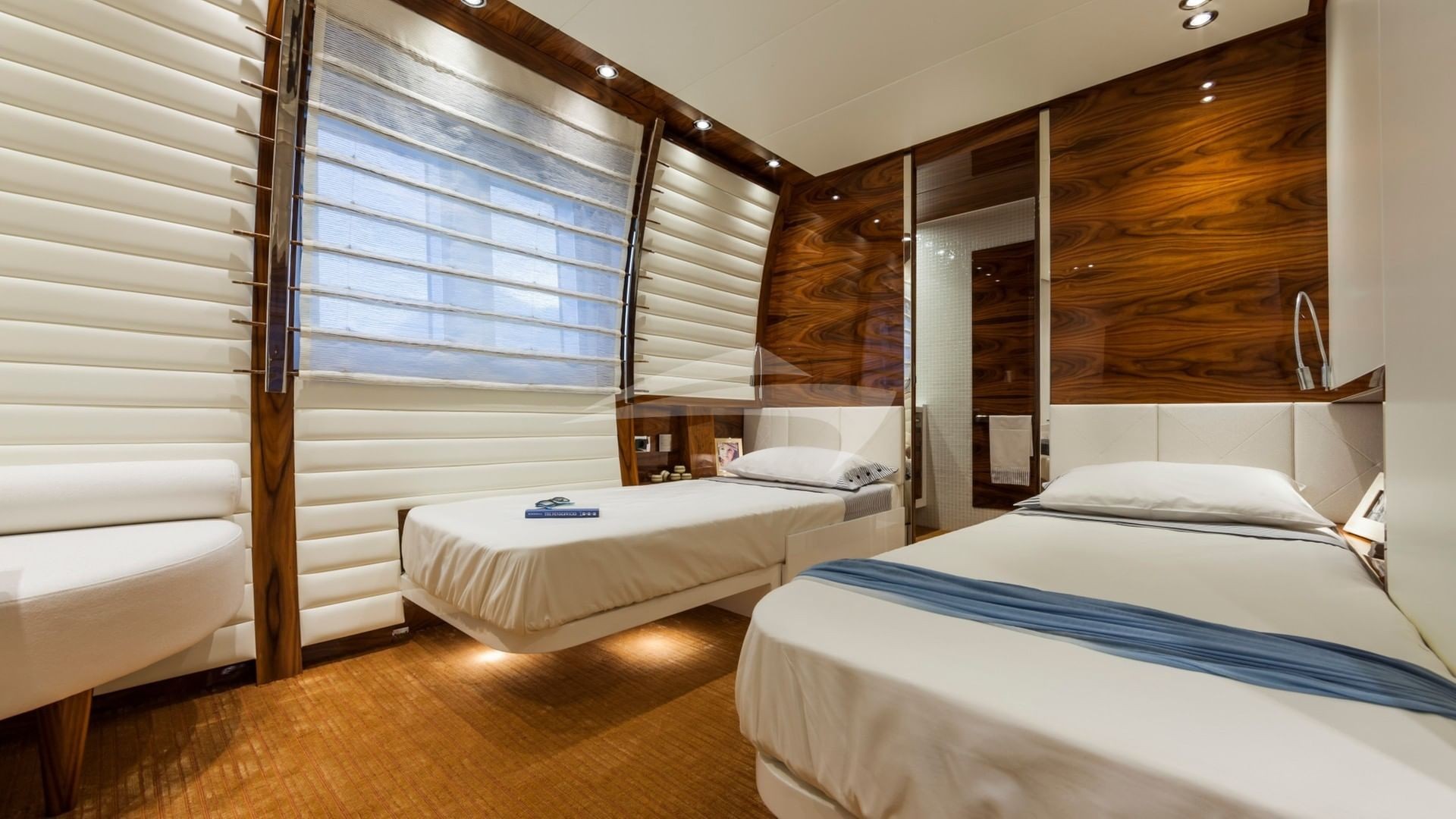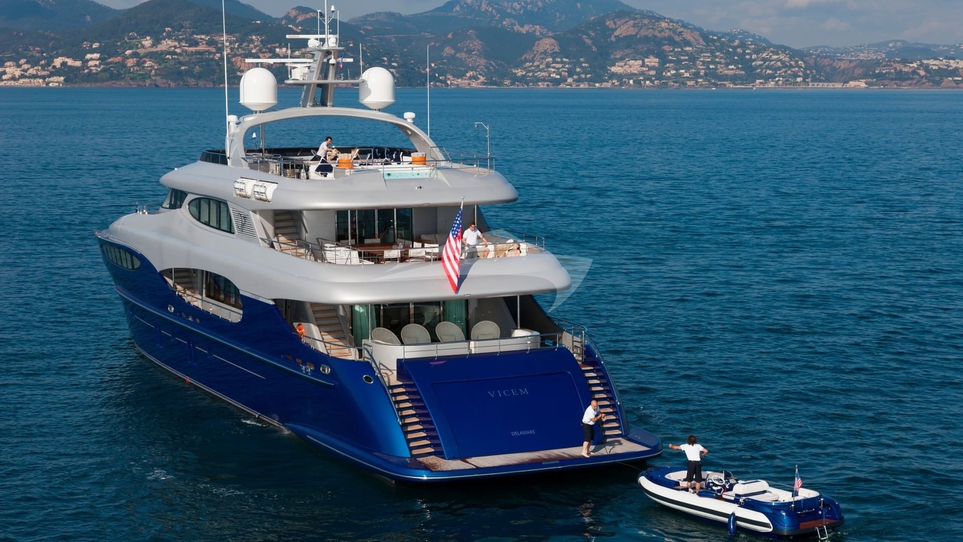 This is a 5 stateroom plus an on-deck master offering up to 12 passengers a design that is totally unique with easy access to the foredeck from the boat deck on the port side and the main deck on the starboard side, creating a massive full beam, on-deck master stateroom. In addition to 6 owner and guest staterooms, the yacht has comfortable accommodations for her award winning Captain and crew. The yacht is designed for the crew to go about their duties in relative obscurity. The main tender is hidden away in the garage as are the wave runners and other toys. The crew also has an additional tender to service the yacht that is tucked away on the forward areas of the yacht.