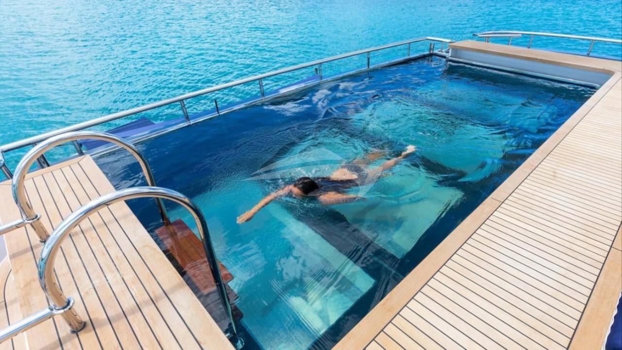 B2's extensive array of amenities sets her apart from other charter yachts. Guests can indulge in the outdoor Jacuzzi, take a refreshing dip in the swimming pool, or unwind on the generous sun pads and loungers. The beach club provides direct access to the sea, while the outdoor shower offers a convenient rinse after water activities.