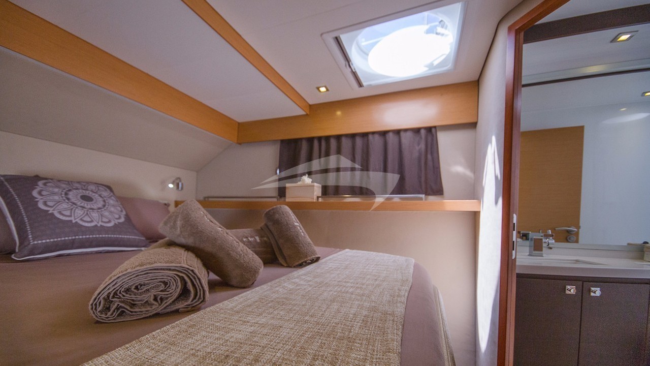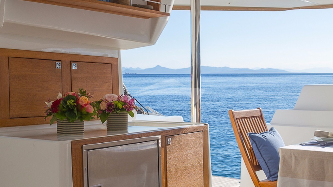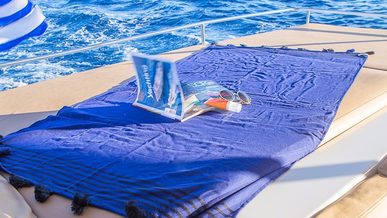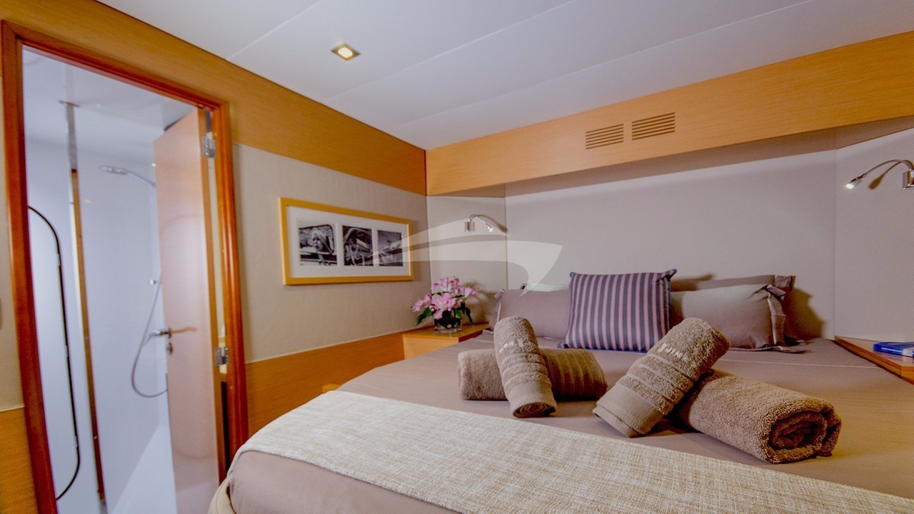 The fore deck is the absolute ideal area for sun-bathing on comfortable sun mattresses, a trampoline, and the best location, if you see any dolphins swimming alongside the boat. The Fly-bridge is the ultimate favourite place for enjoying a glass of champagne accompanied by a finger-licking hors d'oeuvre, while gazing onto the horizon and harmoniously savouring the dreamlike scenery during a sunset.
