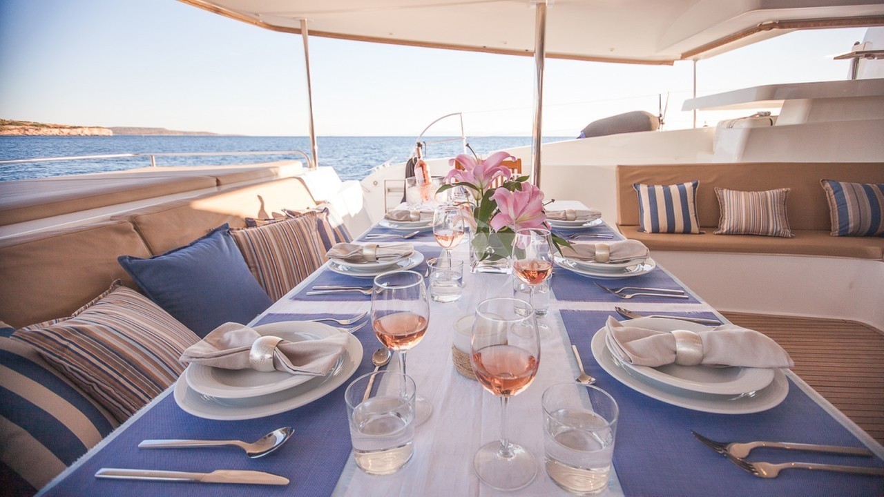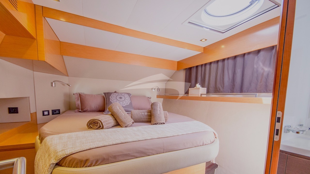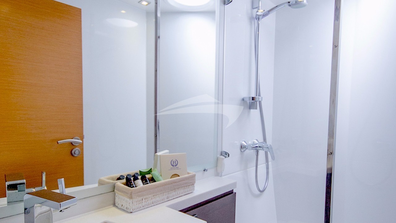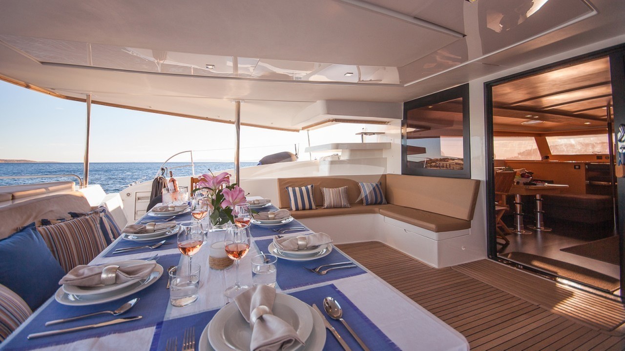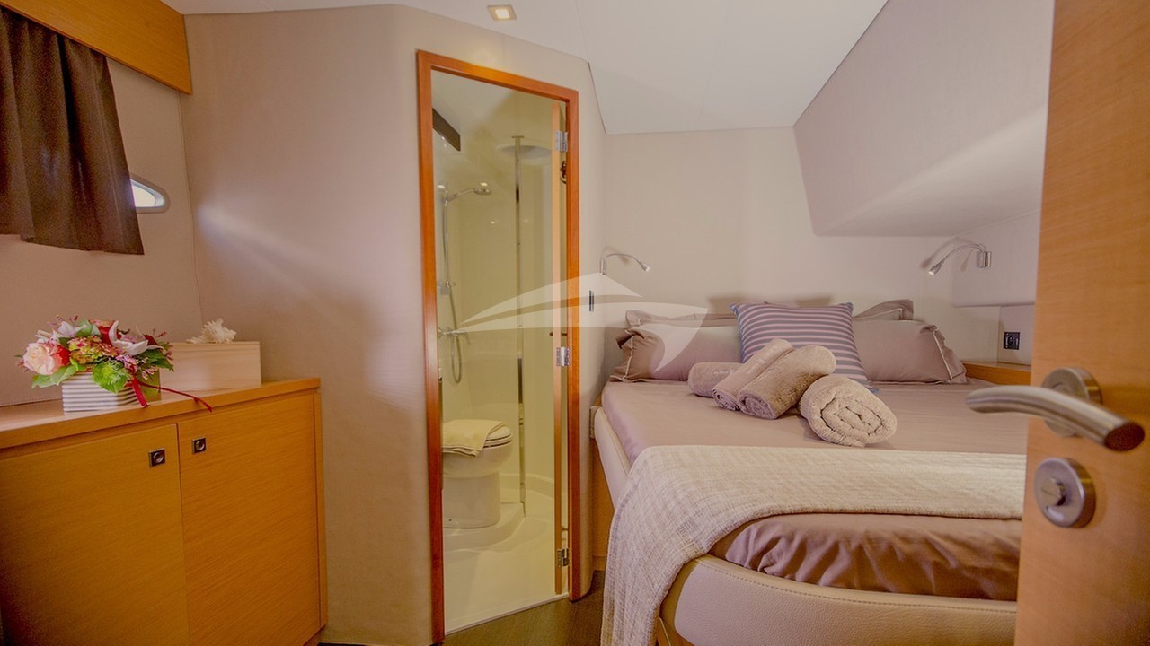 The fore deck is the absolute ideal area for sun-bathing on comfortable sun mattresses, a trampoline, and the best location, if you see any dolphins swimming alongside the boat. The Fly-bridge is the ultimate favourite place for enjoying a glass of champagne accompanied by a finger-licking hors d'oeuvre, while gazing onto the horizon and harmoniously savouring the dreamlike scenery during a sunset.