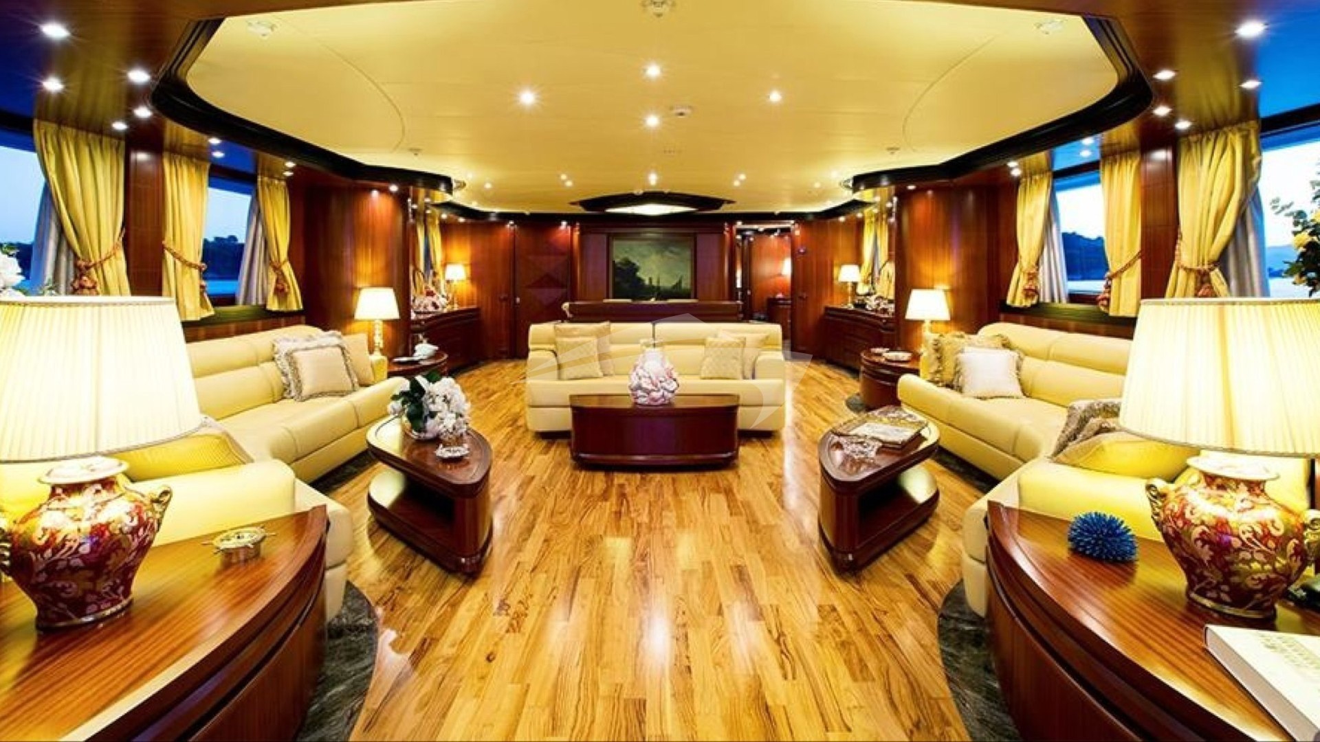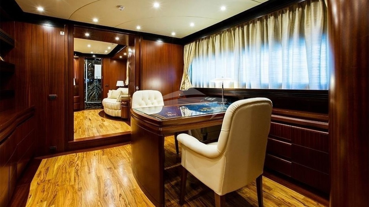 Step inside and discover a world of opulence and relaxation. The yacht's interior is a harmonious blend of sophistication and comfort, featuring five luxuriously appointed suites. The full-beam master suite is a private sanctuary, complete with a spacious walk-through office and a lavish ensuite bathroom. Two double cabins and two twin cabins with Pullman beds, all with ensuite facilities, provide sumptuous accommodations for your guests.