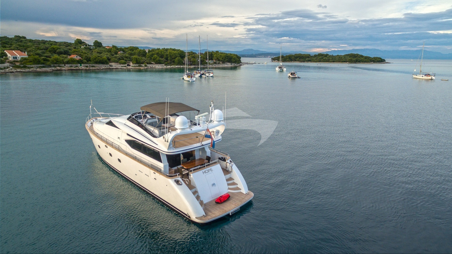 Hope I Yacht Charter is a 70' superyacht built by Maiora in 2008. She sleeps 8 and holds 2 crew and is located in East Mediterranean and East Mediterranean. She can be booked for a private luxury charter at a rate of $22,126 per week. Please check with your Denison Charter Specialist for more info.