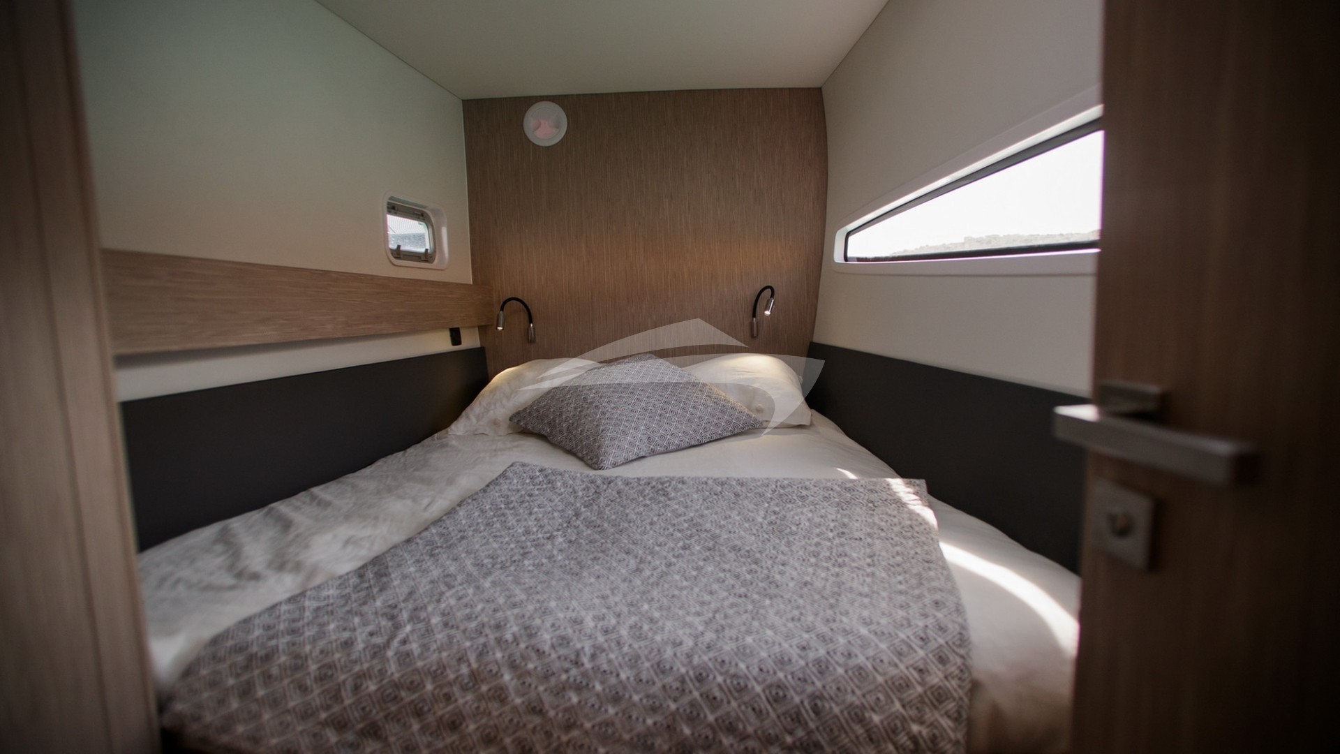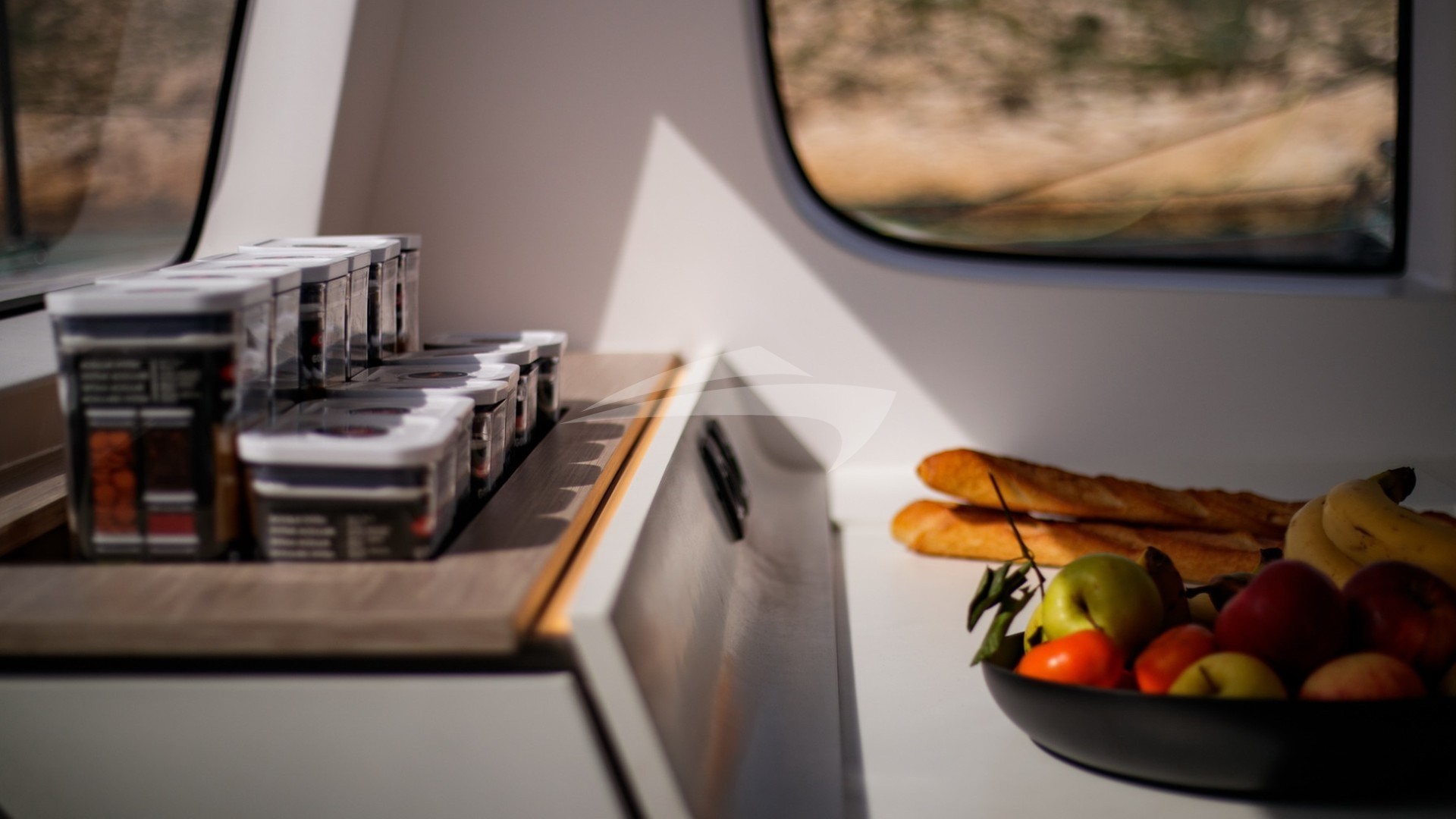 The 55-foot liveaboard catamaran, is easy to manoeuvre, whether short-handed or even solo. It offers living spaces, circulation, light and ventilation that set new standards. Whether you want to enjoy the view of the water and your sails, comfortably installed on the double bench seat, or protected from the elements in the cockpit, you keep perfect control of the boat. The 360° view from the saloon and cockpit allows exceptional visibility of the water and the environment, and greatly contributes to comfort on board.