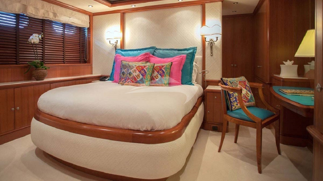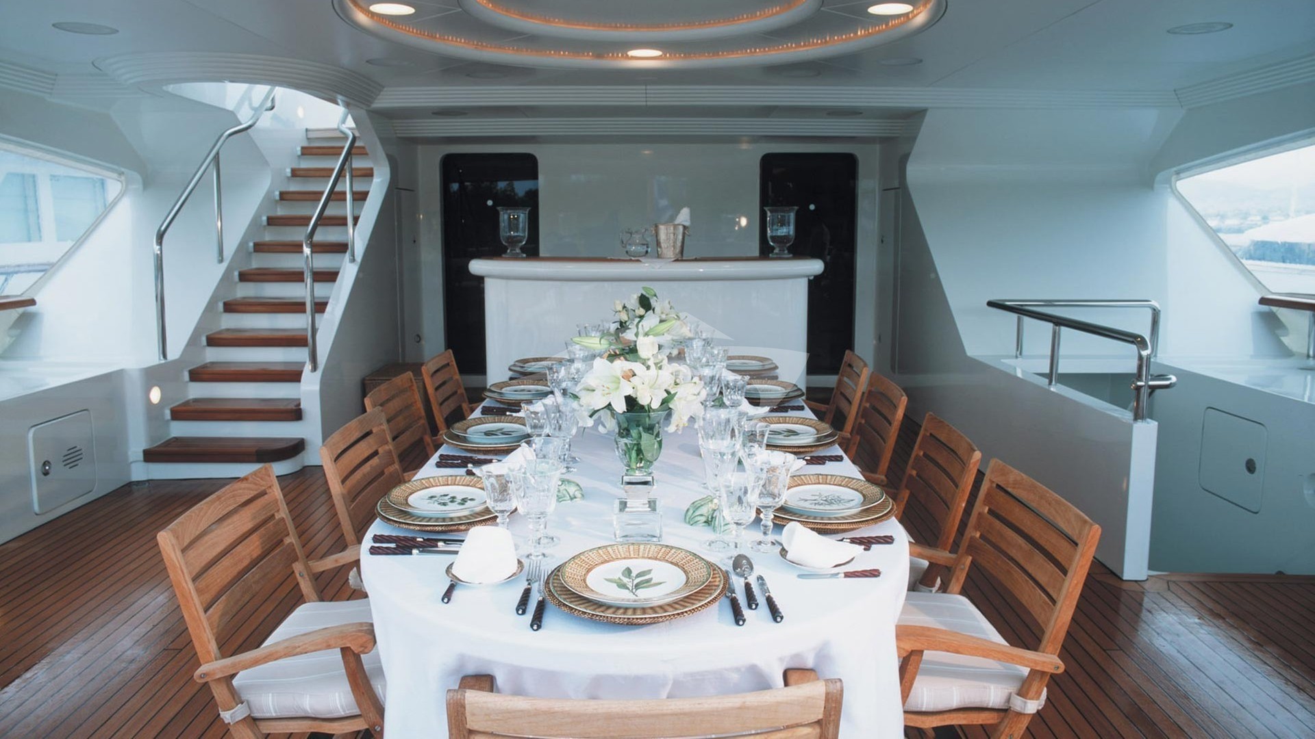JO l's luxurious yet elegant and understated interior is the work of François Zuretti and sleeps up to 12 guests in six impressive cabins, including an owner's suite, two double cabins, two twins and a recently converted sixth cabin on the upper deck. Throughout her interior, a feeling of light and space is utilised with a fresh colour palette of neutral tones combined with cherry wood and natural oak to create warmth. Curved lines and soft lighting showcase a timeless feel, whilst a varied selection of sumptuous fabrics provides the ultimate comfort.