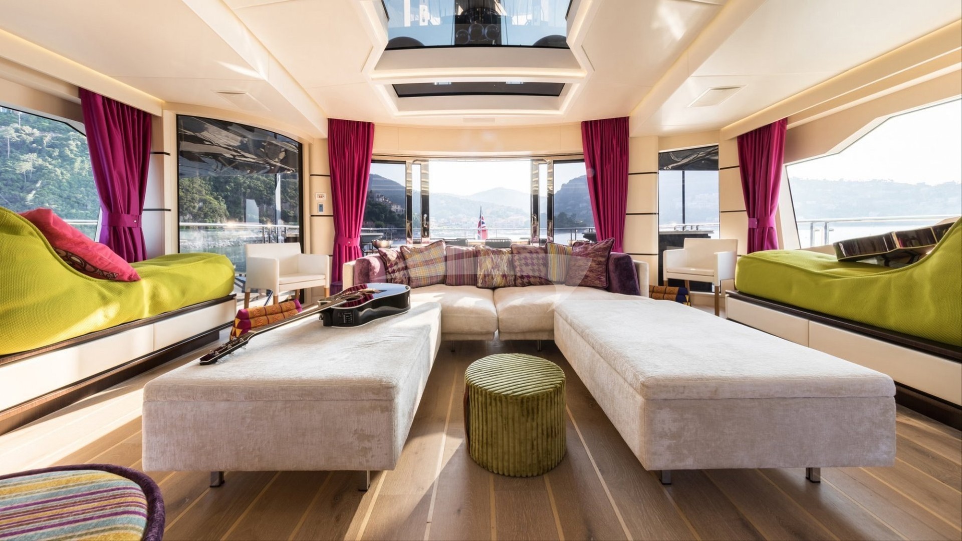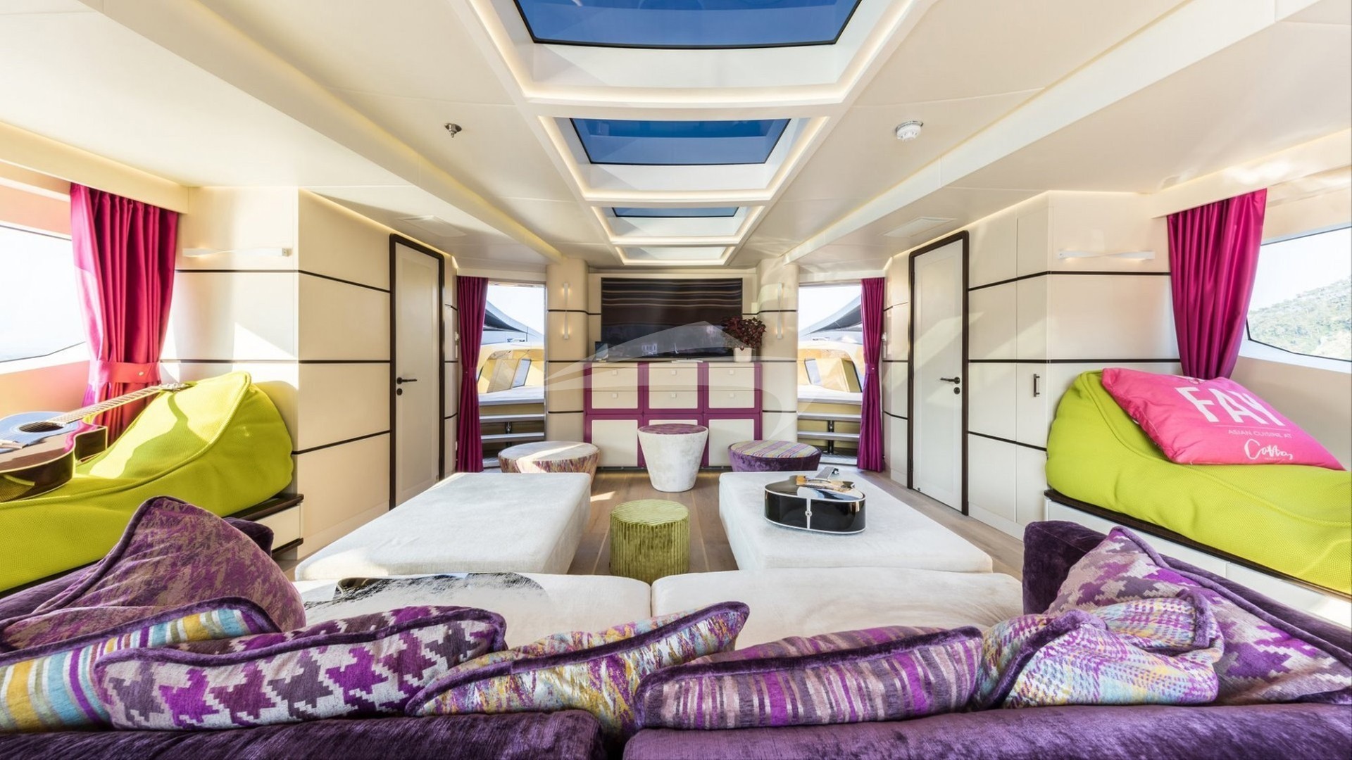 Step inside KHALILAH and be transported to a world of contemporary luxury. The yacht comfortably accommodates up to 11 guests in 5 lavishly appointed suites, including a sumptuous owner's suite and VIP stateroom on the main deck. Floor-to-ceiling windows flood the interiors with natural light, while the use of bright colors and modern design creates a fun, vibrant atmosphere throughout.
