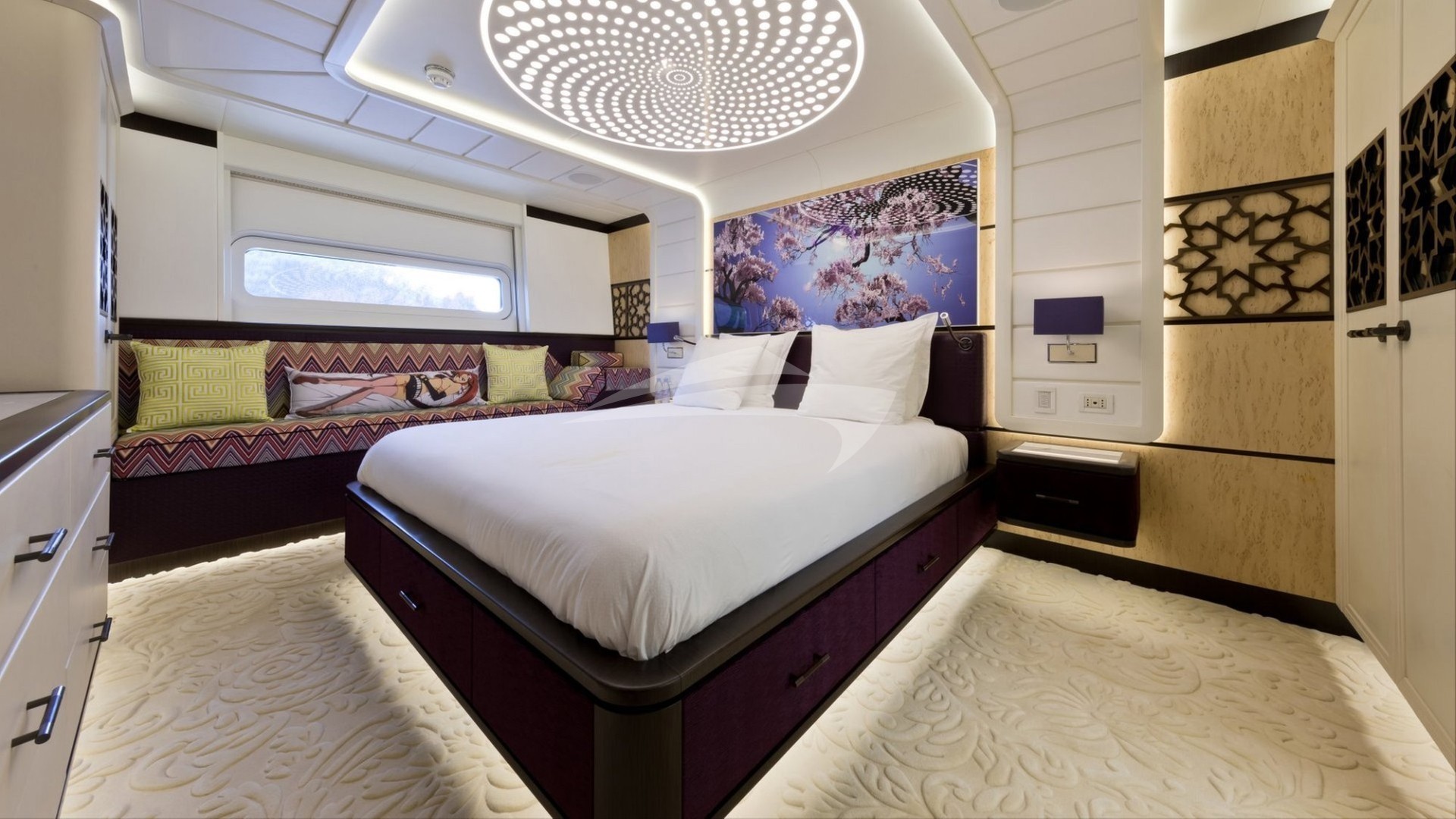 On the lower deck, KHALILAH has two spacious double cabins and one twin cabin with a Pullman bed. They each have a striking contemporary look and feature individual colour schemes and decor.