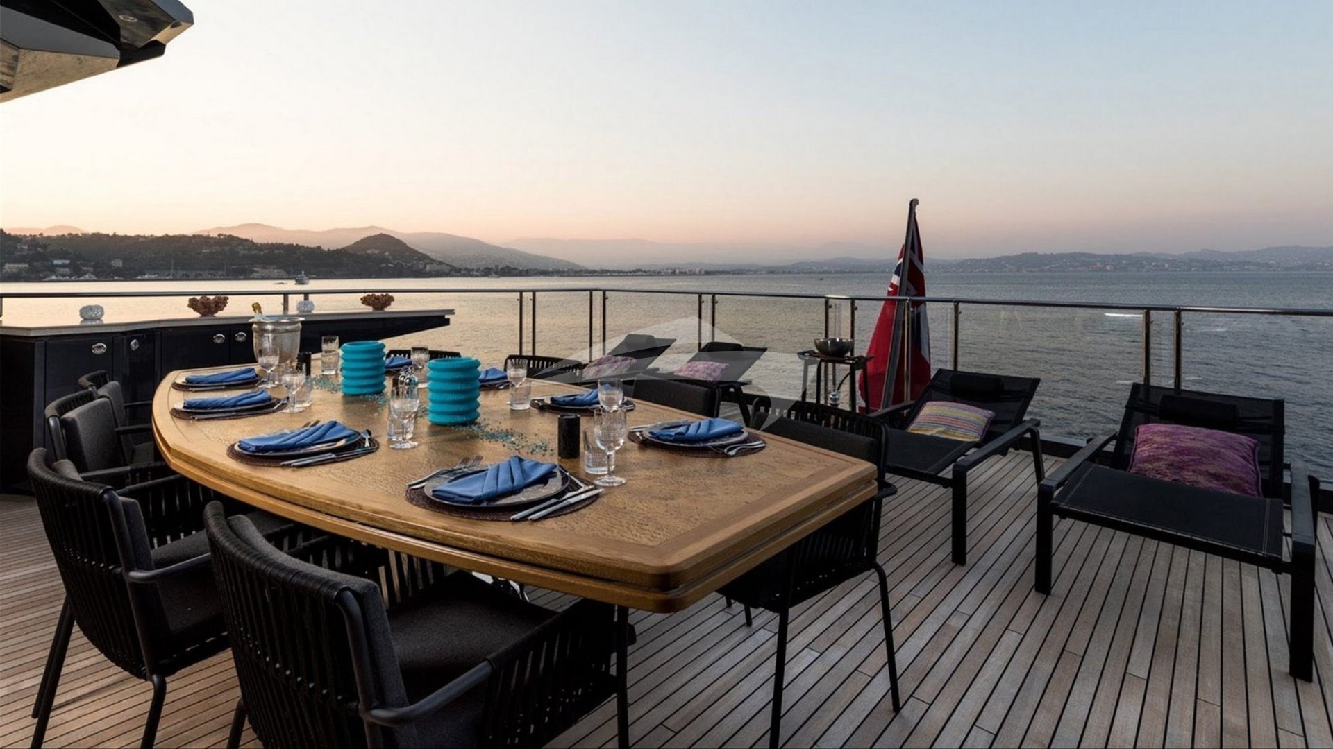 When it’s time to enjoy the sunshine or catch a breeze after the sunset, the sundeck unwinds into an open area dedicated to sunbathing and relaxing in the jacuzzi while enjoying a panoramic view. Want to gather with family and friends? Her large aft-deck boasts an exceptional social area and an abundance of seating options. Her 12-seat circular table is perfect for al fresco dining.