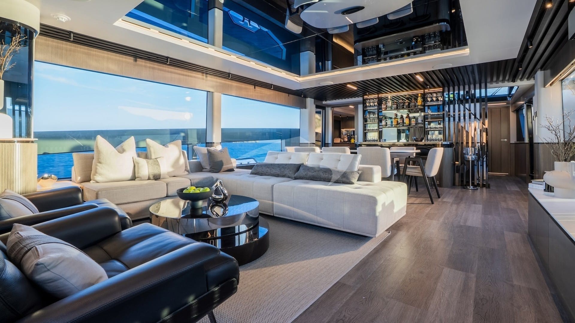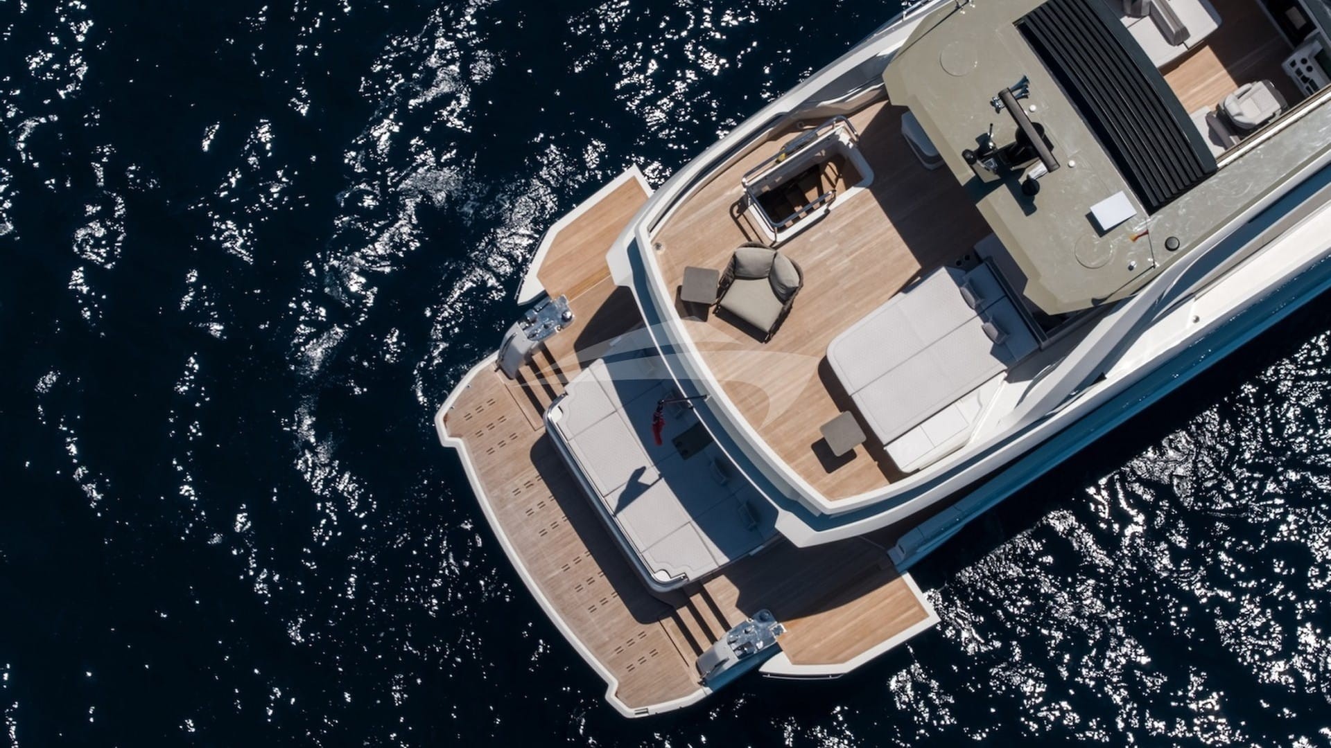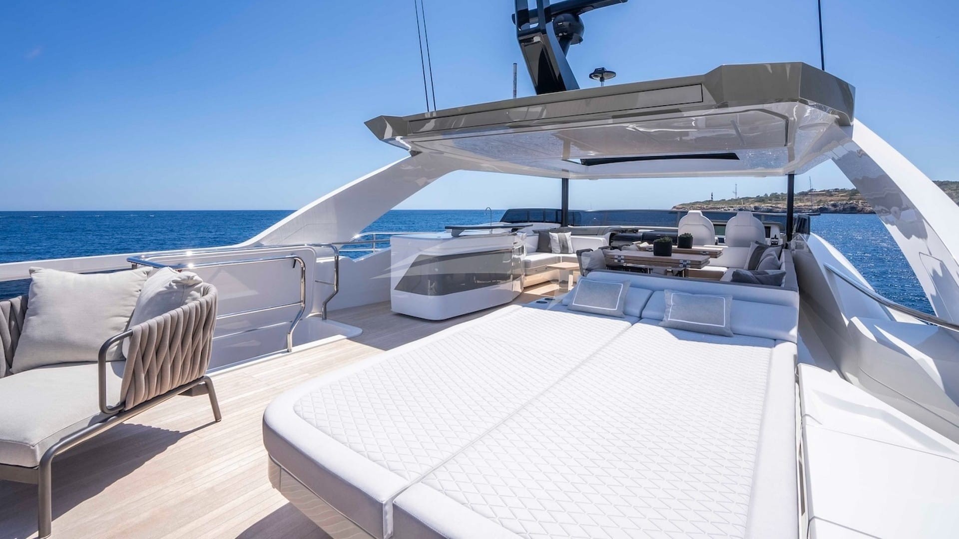 Outside, KNEAD IT offers generously proportioned deck areas shaped by thoughtful design. From her spacious flybridge to the foredeck sun pads and the aft swim platform that brings you directly to the water, every area invites you to unwind and enjoy your surroundings.
