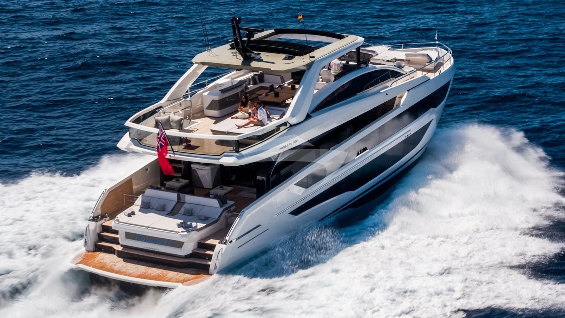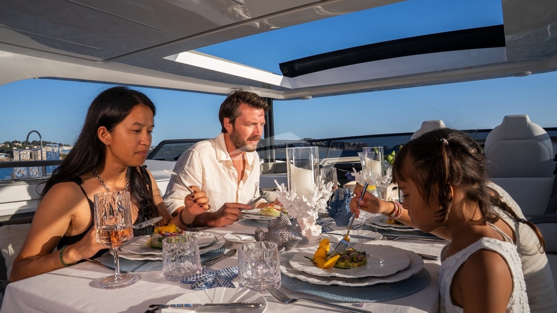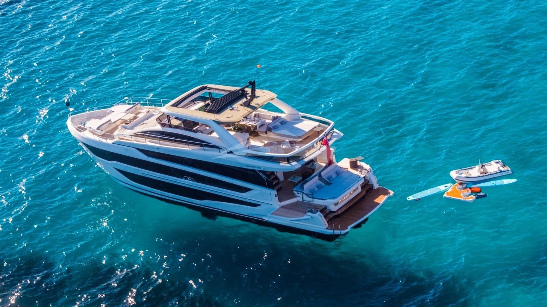 Outside, KNEAD IT offers generously proportioned deck areas shaped by thoughtful design. From her spacious flybridge to the foredeck sun pads and the aft swim platform that brings you directly to the water, every area invites you to unwind and enjoy your surroundings.