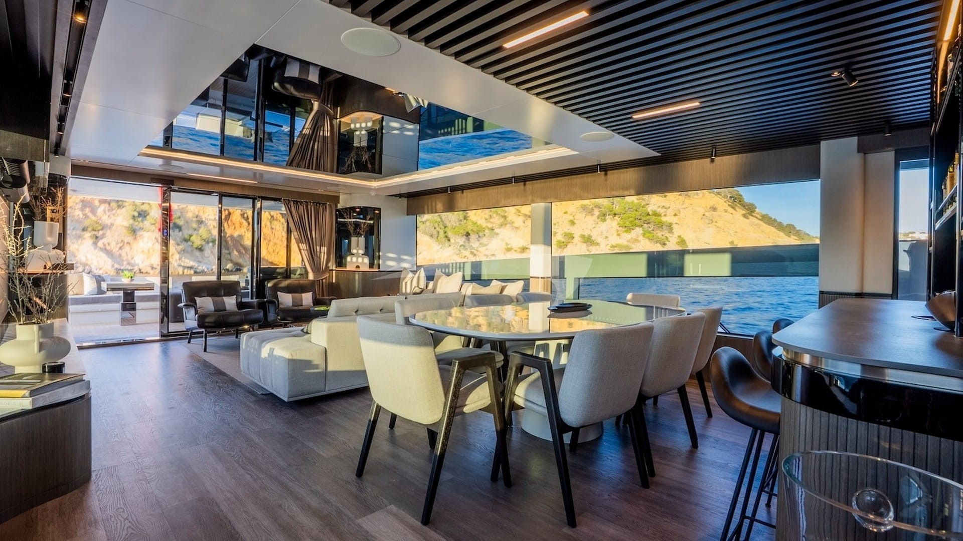 Inside, the atmosphere is calm, considered and contemporary. Kelly Hoppen’s hallmark palette of neutral tones, tactile materials and bespoke furnishings complements the open plan main saloon, enhanced by large windows that frame the sea. The accommodation layout is intelligently designed. A full beam master suite on the main deck provides elevated privacy, while the four guest cabins on the lower deck offer flexible double and twin arrangements suitable for a variety of groups. The experienced crew, who have worked together for over 5 years, ensure seamless service so you can simply relax.