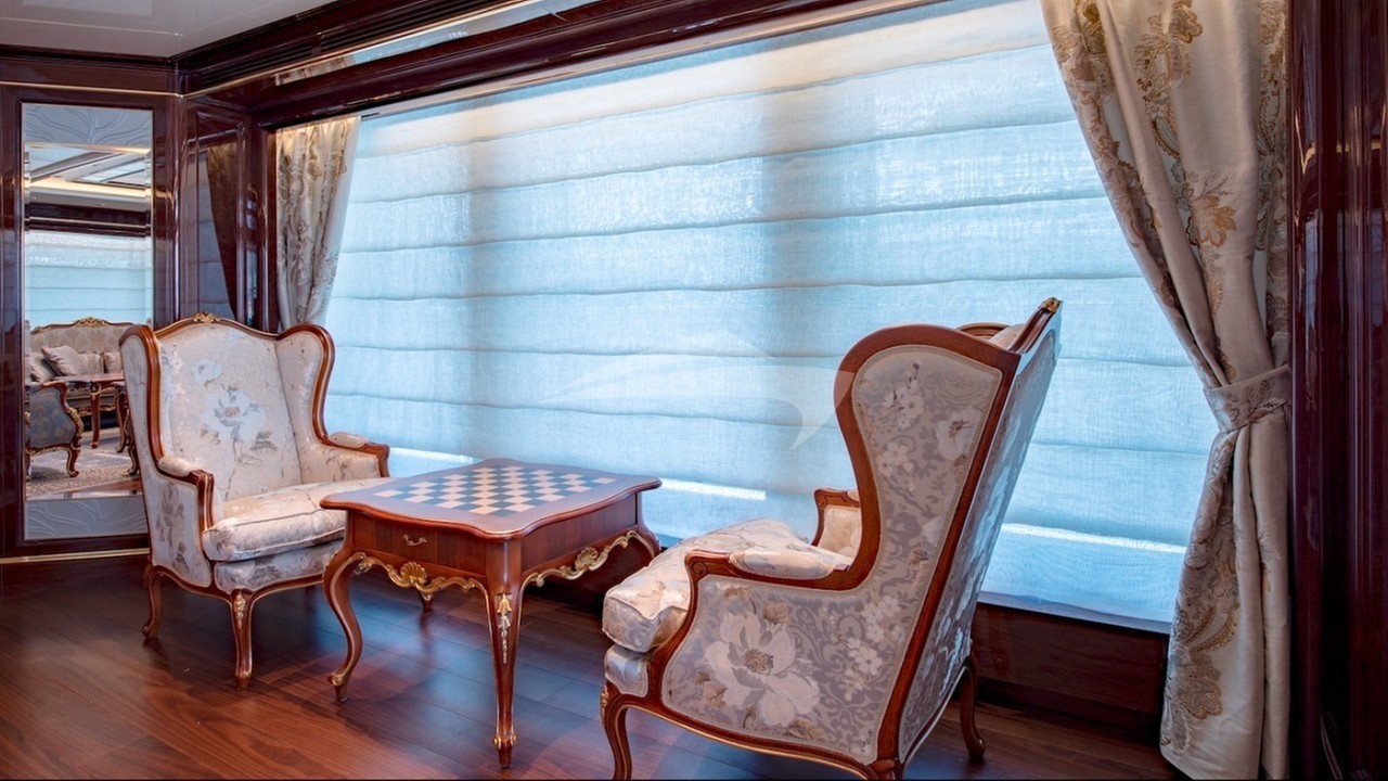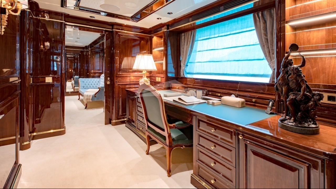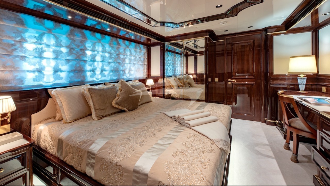 Accommodation aboard LADY LENA is nothing short of exquisite. The full-beam master suite is a private sanctuary, boasting a separate office and an opulent onyx-clad bathroom with his-and-hers vanities, a full bath, and a separate shower room. Three sumptuous VIP cabins and two versatile double cabins with sofa beds and pullmans complete the sleeping arrangements, ensuring comfort and privacy for all guests.