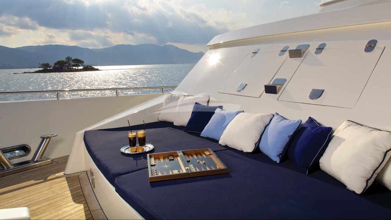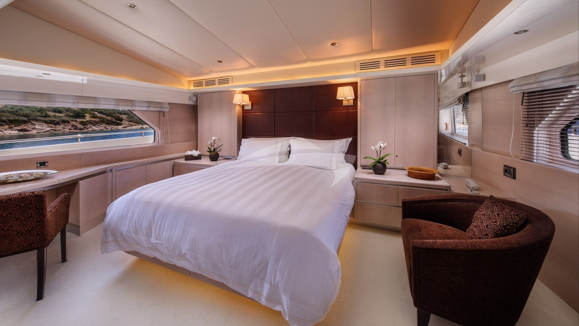 A perfect vessel for sun-worshippers, the exterior spaces on Magix allow her guests to take in the stunning scenery of Greece and its many islands. Those on board can enjoy meals together on the covered aft deck with a dining table for eight, taking in the panoramic views of the surrounding ocean. This space also has built-in comfortable seating, perfect for relaxing, and enjoying a cocktail. Upstairs, the sun deck is a versatile space that can be used throughout the day and into the evening. A jacuzzi, sun loungers, comfortable seating, and a casual dining table make this area an ideal place for al fresco living.