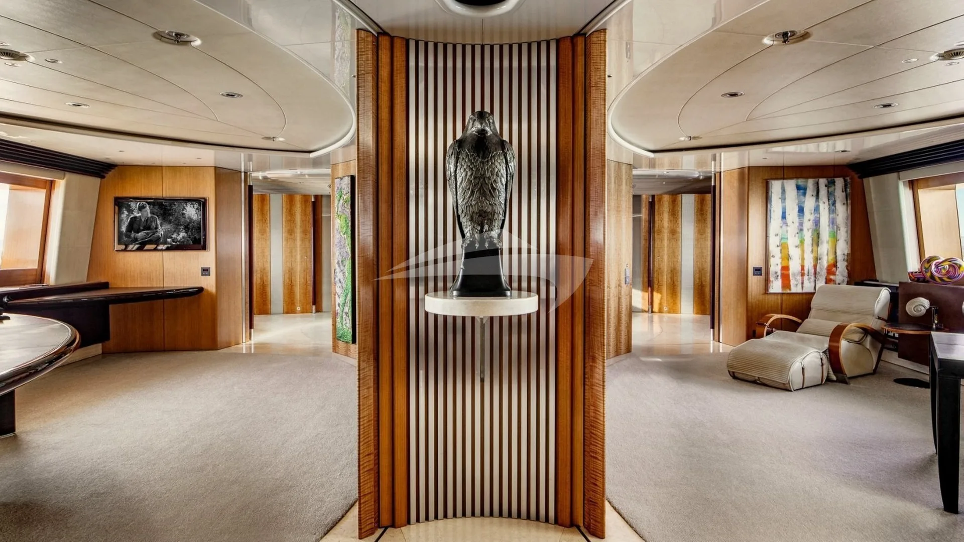 The MALTESE FALCON's most striking feature is her three free-standing carbon fiber masts, a testament to cutting-edge engineering that sets her apart in any harbor. Designed by the award-winning Ken Freivokh, her exterior and interior seamlessly blend industrial Art-Deco aesthetics with modern luxury, creating an ambiance that's both bold and sophisticated.