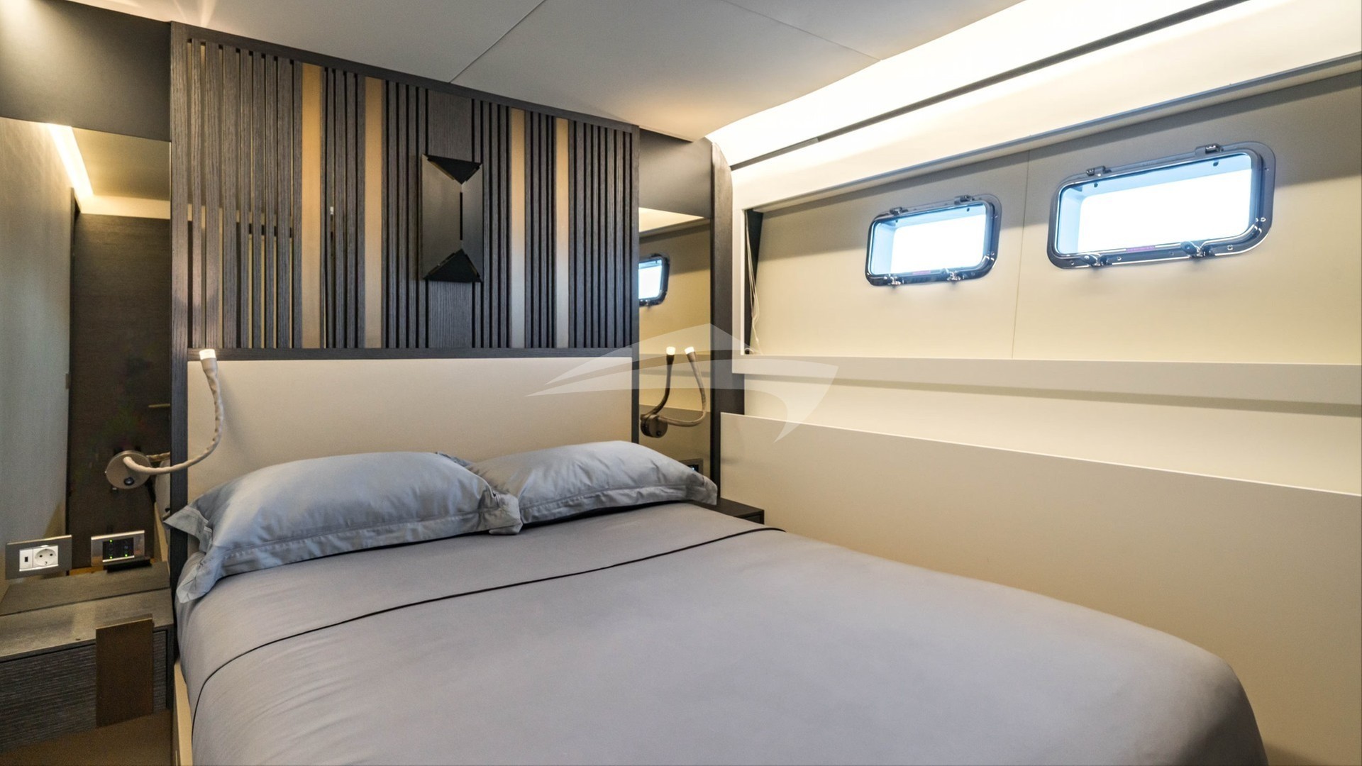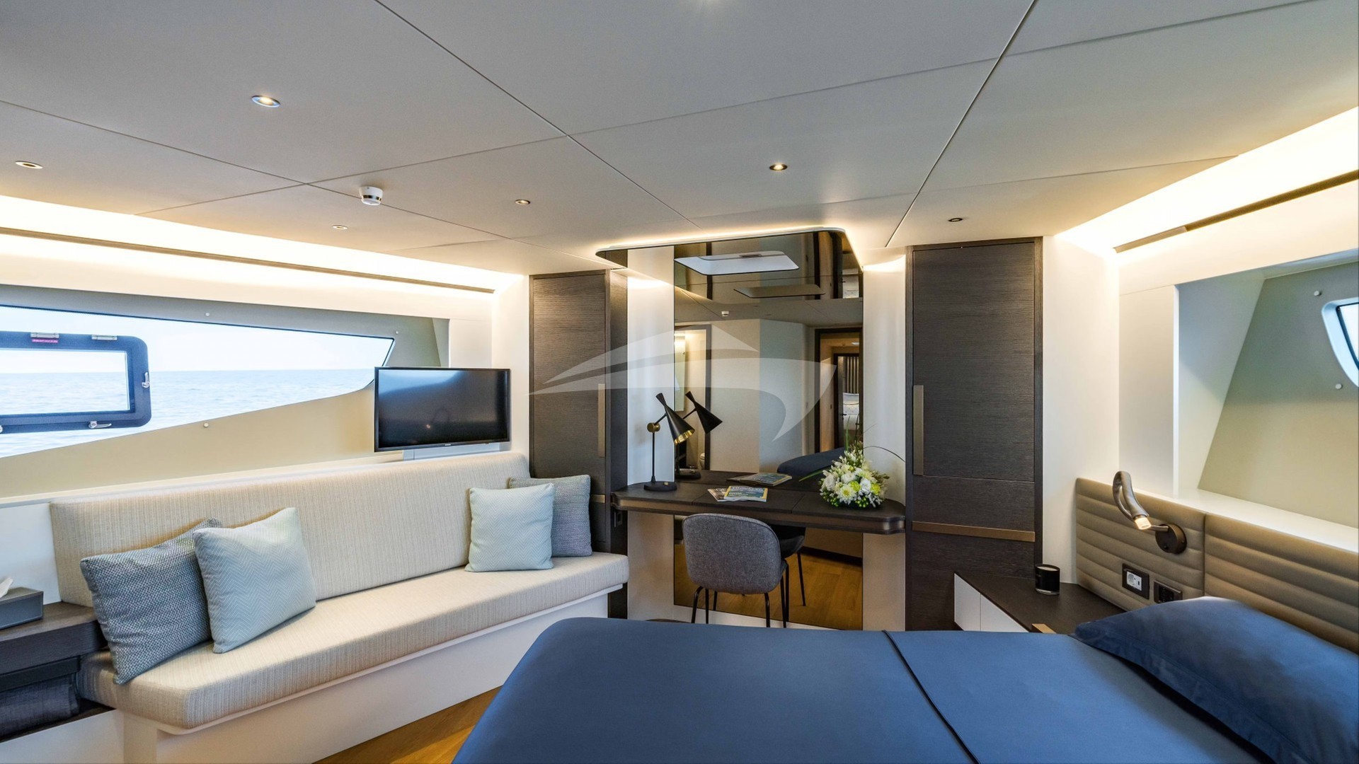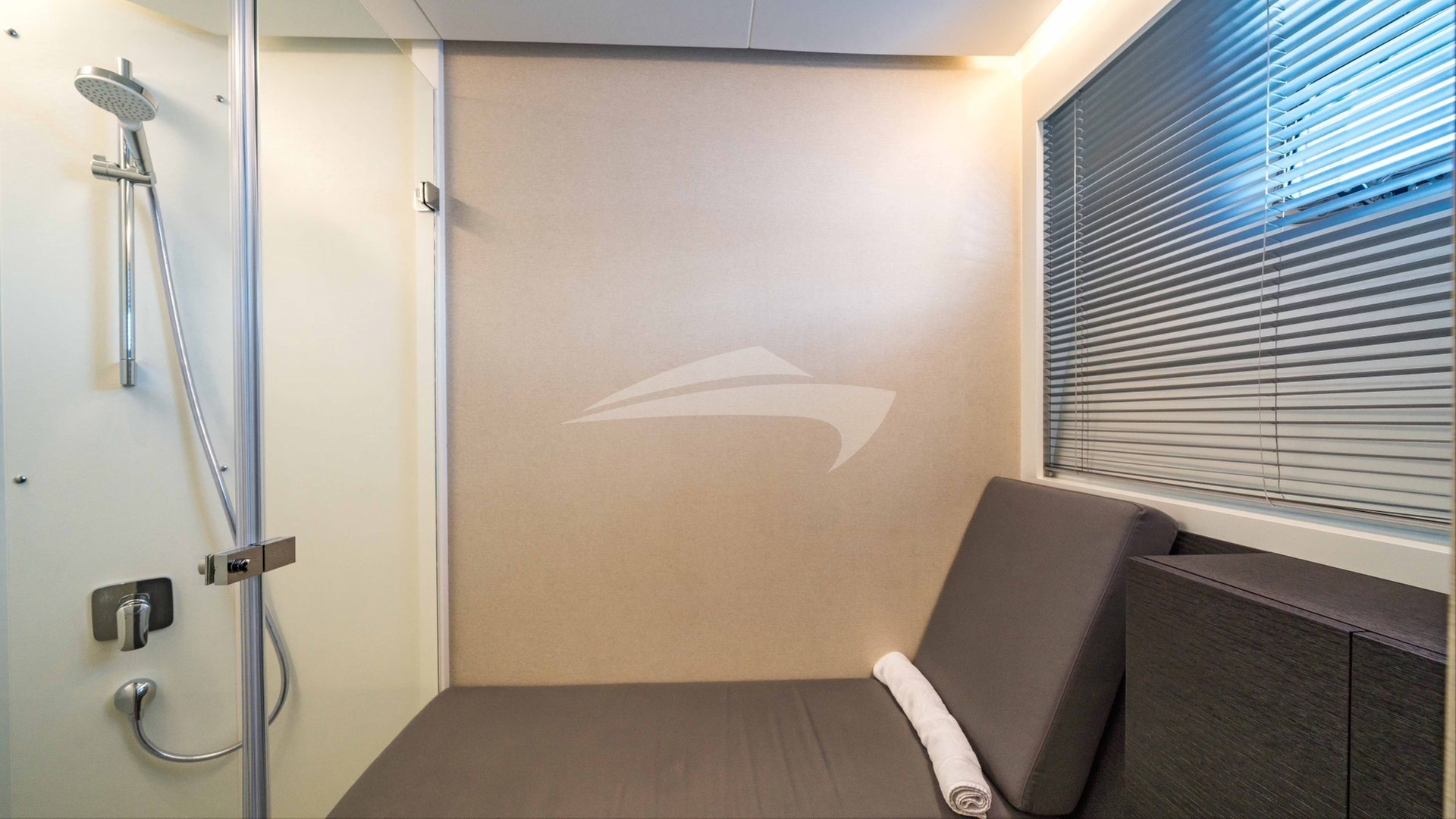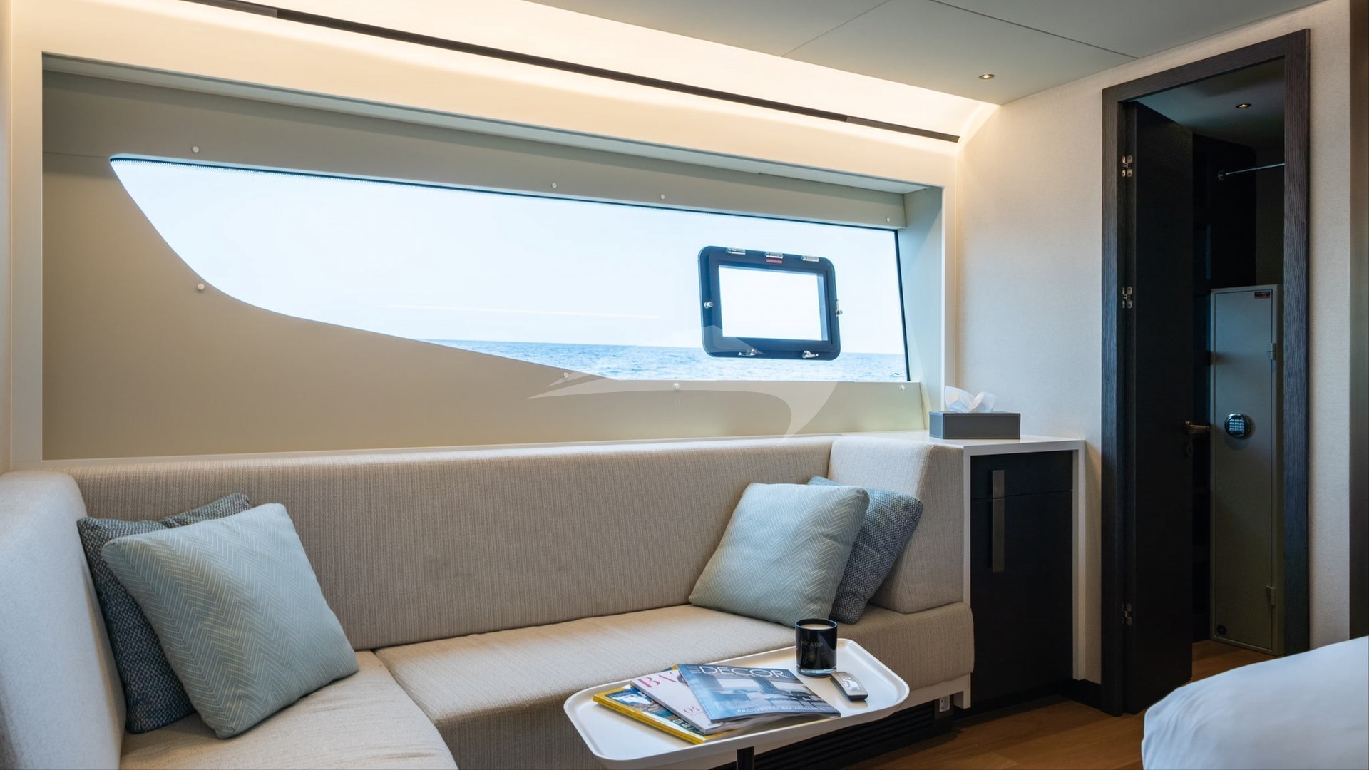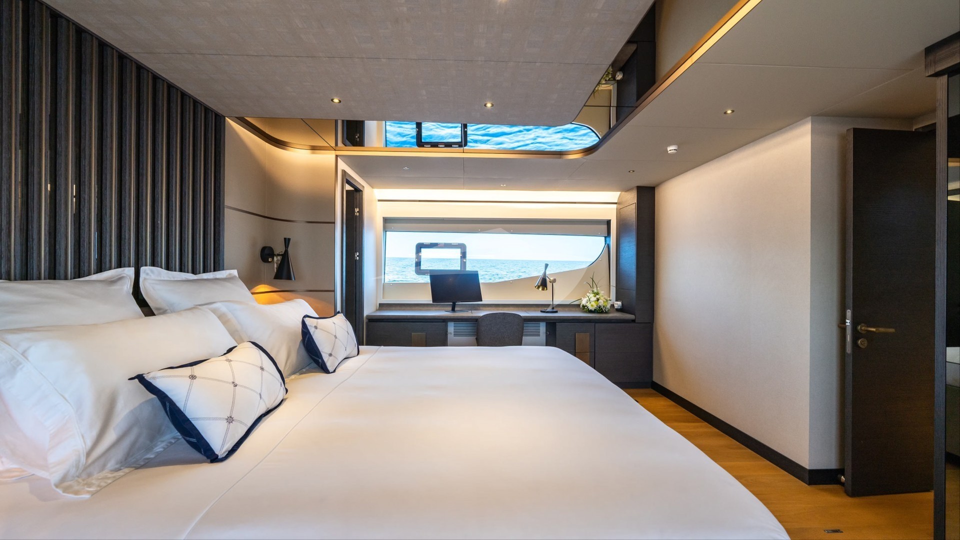 MAORIA can comfortably sleep six guests in three luxurious staterooms, including a full-beam master cabin, a large VIP double cabin, and a double cabin. The full-beam master stateroom is located aft and features a spacious double bed, a walk-in wardrobe with a safe, and a large L-shaped sofa and desk. The VIP double cabin is located forward and boasts a full-beam layout, a double bed, good storage, a sofa, and a desk. The double cabin is located port side and features a double bed and a wardrobe. All staterooms come with their own en-suite shower rooms and plenty of amenities to ensure guests feel right at home.