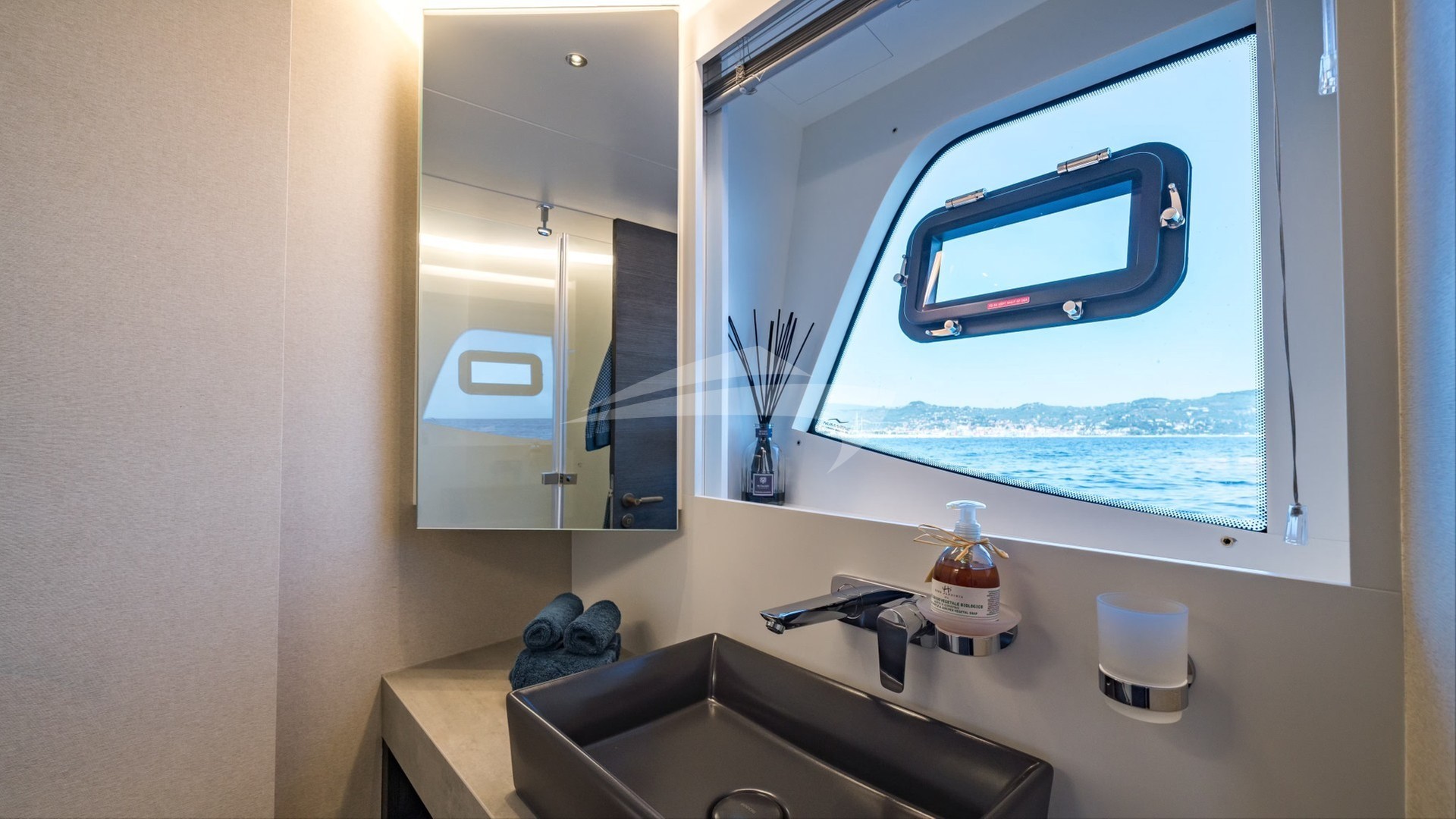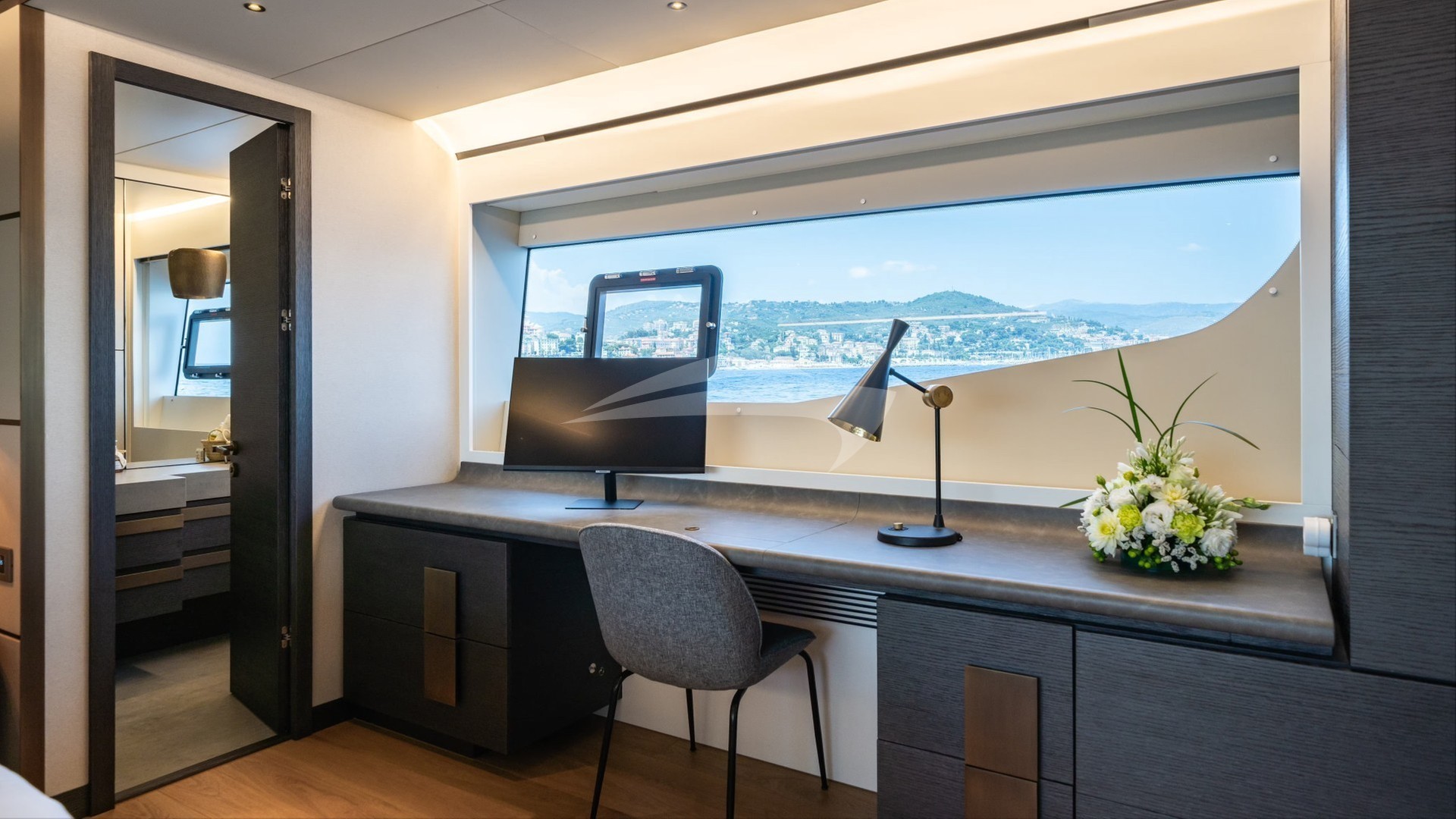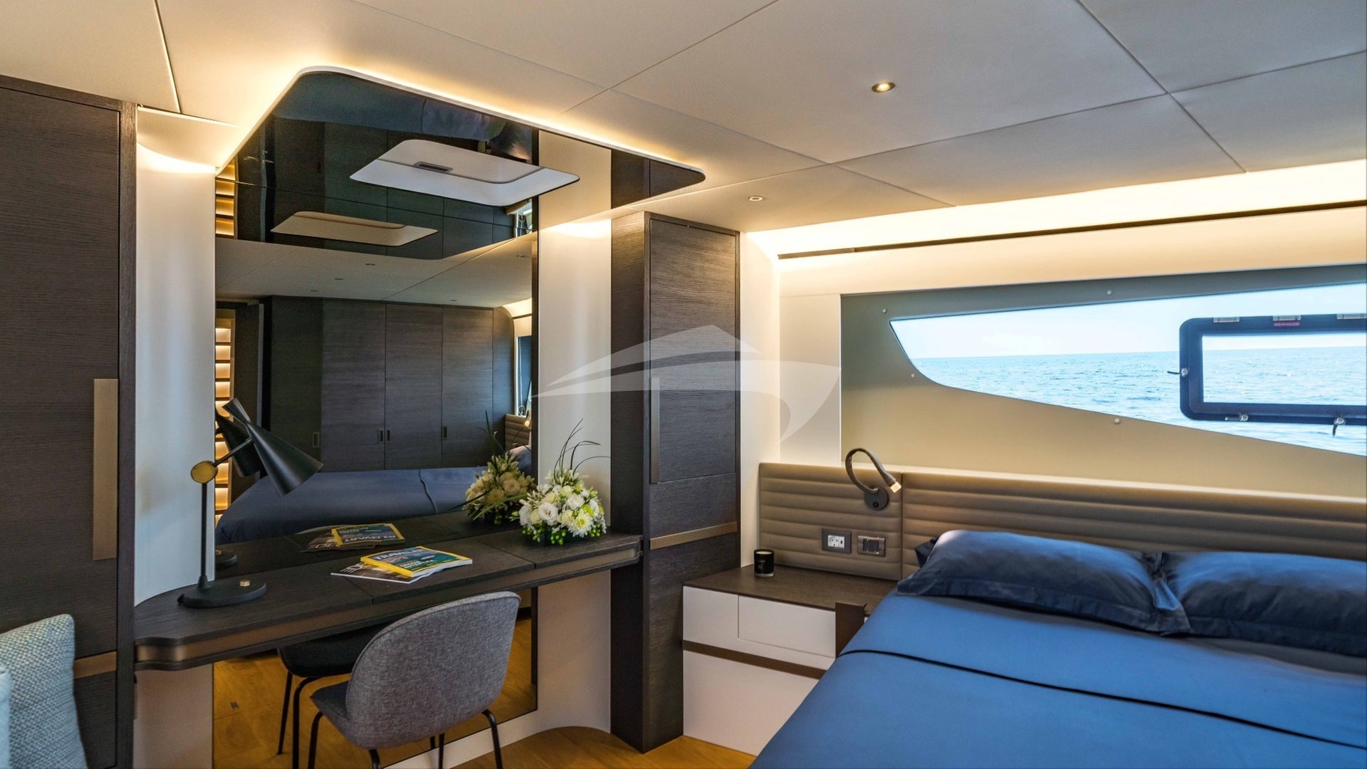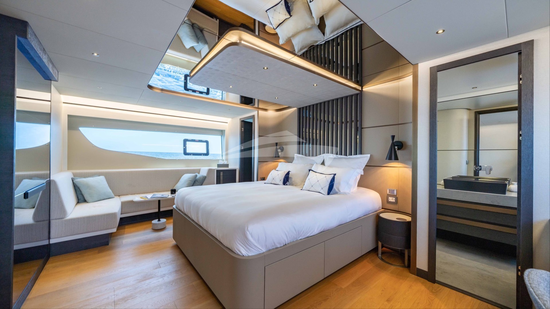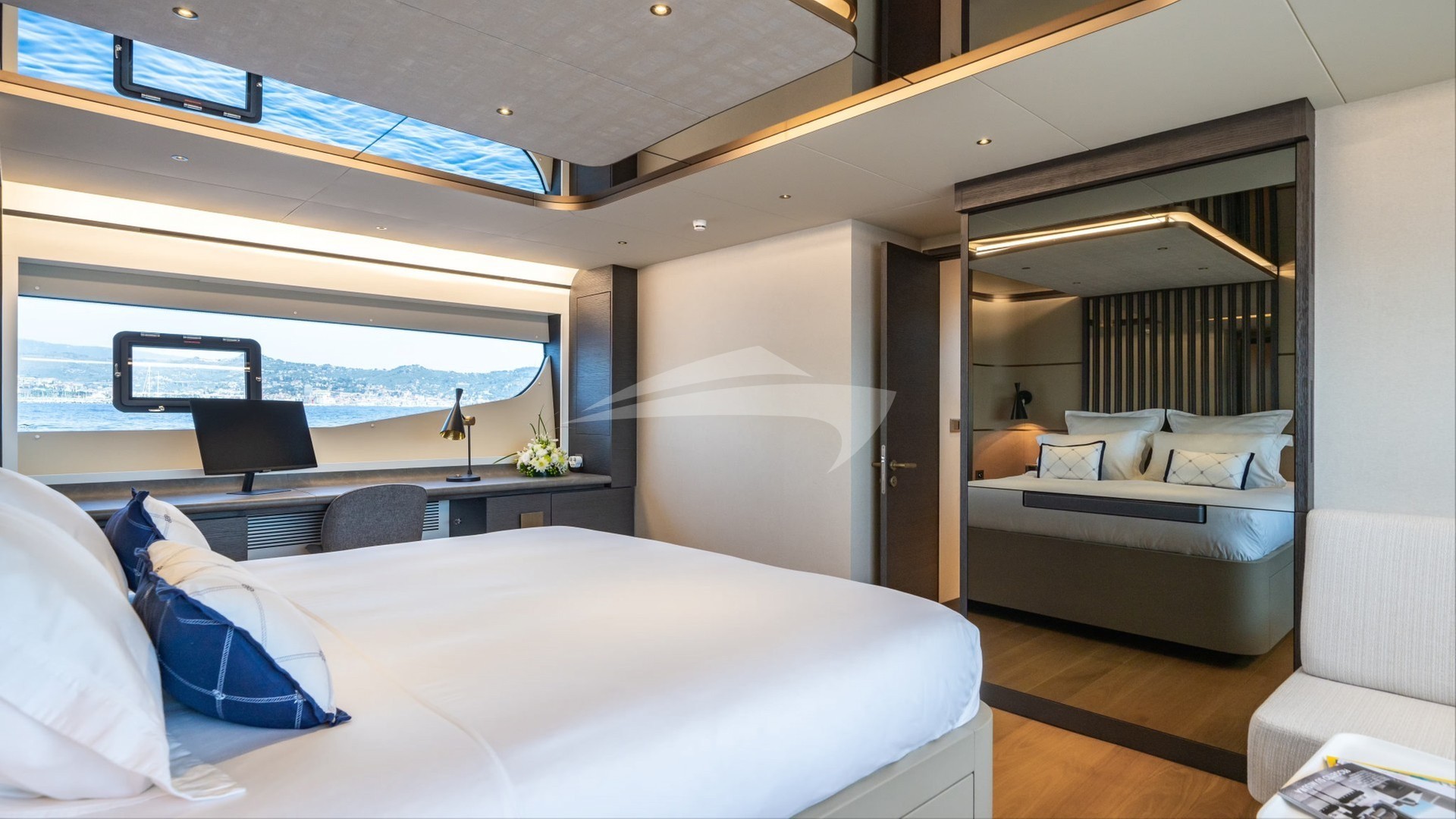 MAORIA can comfortably sleep six guests in three luxurious staterooms, including a full-beam master cabin, a large VIP double cabin, and a double cabin. The full-beam master stateroom is located aft and features a spacious double bed, a walk-in wardrobe with a safe, and a large L-shaped sofa and desk. The VIP double cabin is located forward and boasts a full-beam layout, a double bed, good storage, a sofa, and a desk. The double cabin is located port side and features a double bed and a wardrobe. All staterooms come with their own en-suite shower rooms and plenty of amenities to ensure guests feel right at home.