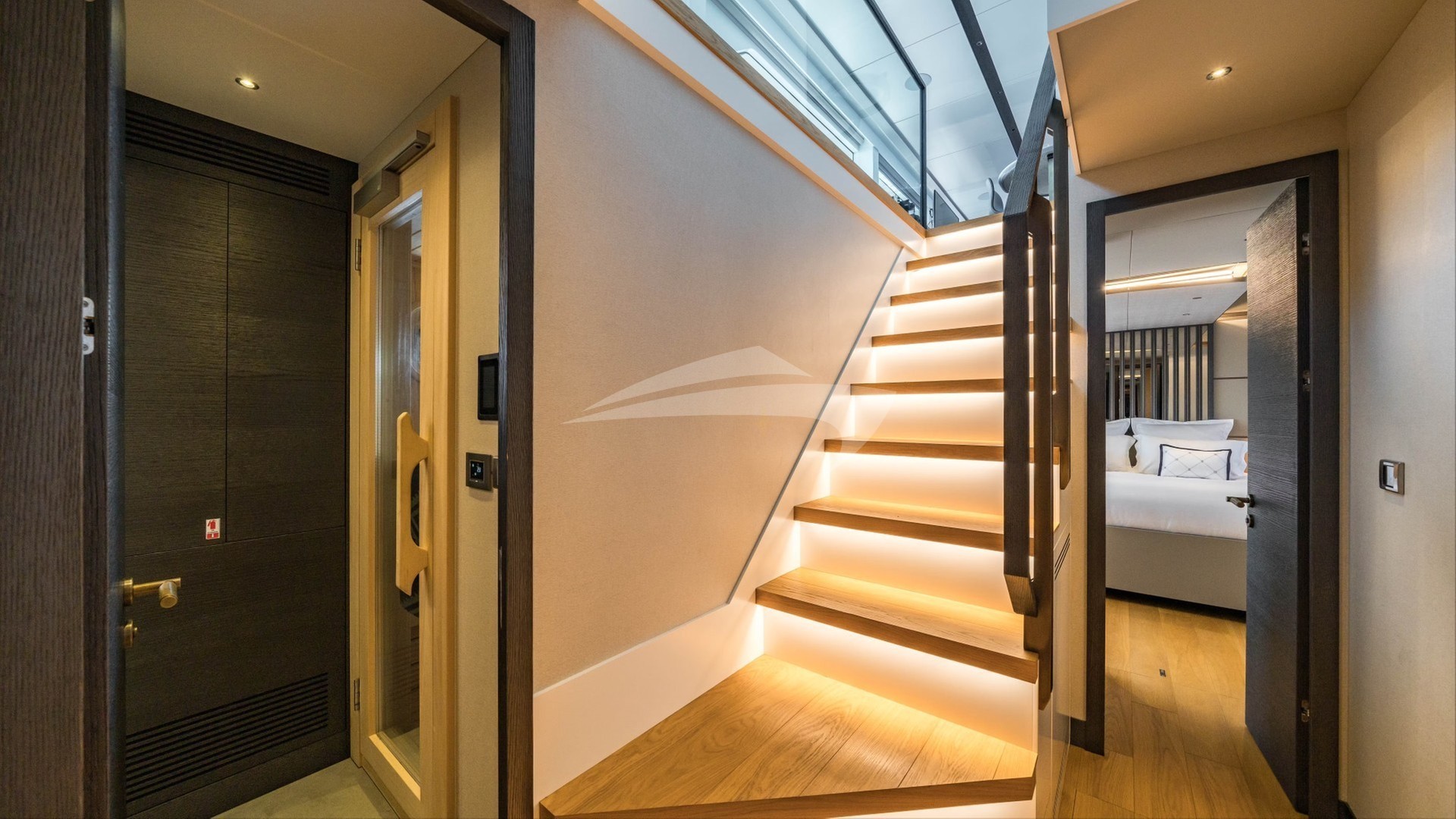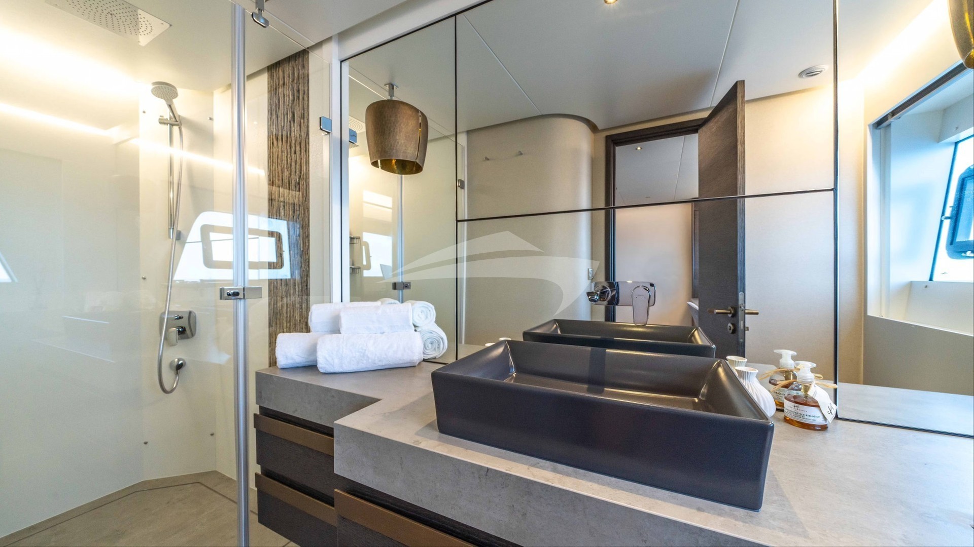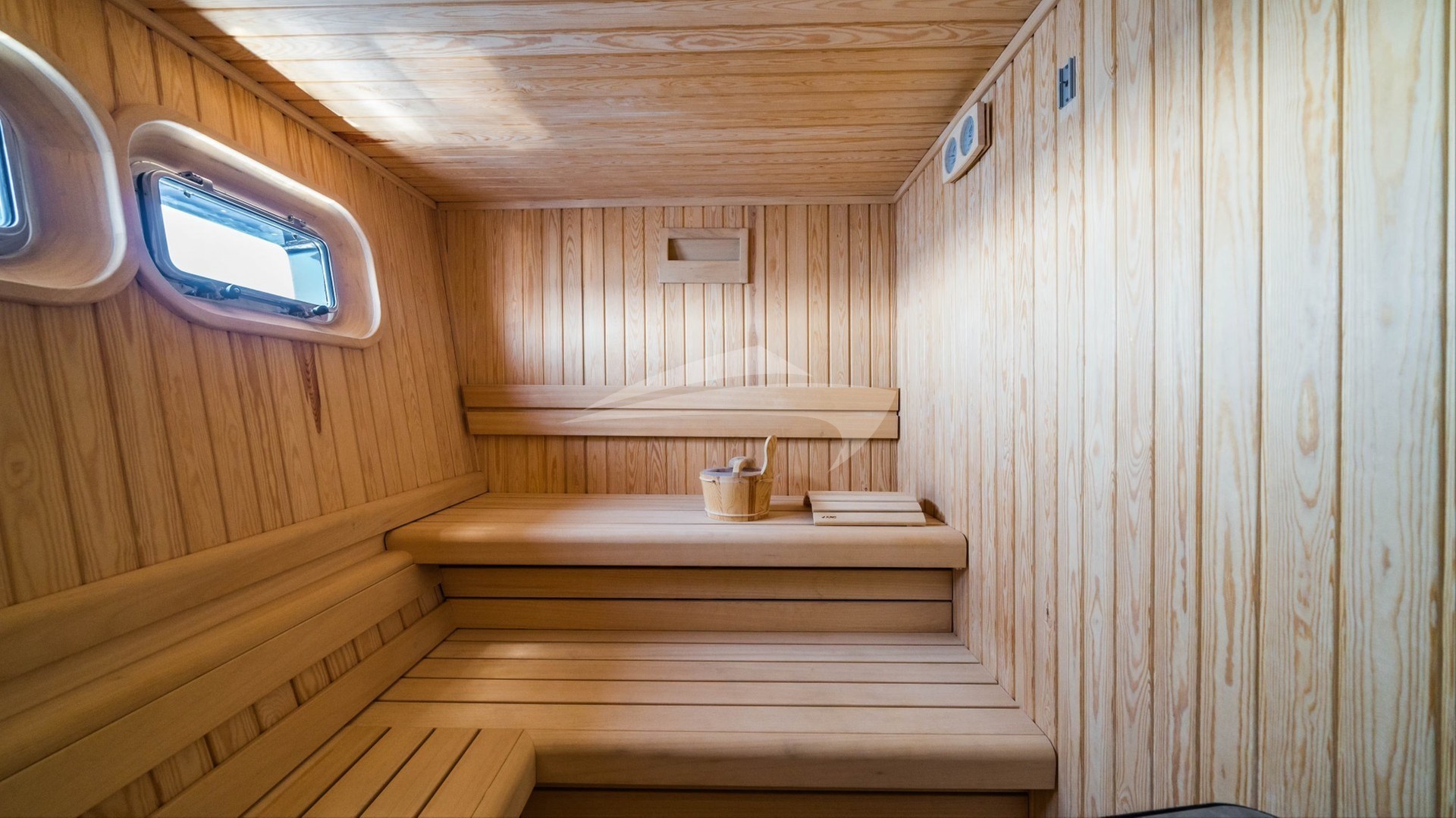 Moving up to the sundeck, guests will find a spacious area that can be used for relaxation or entertainment. It features a large dining table that seats eight guests, a barbecue, fridges, an ice machine, and comfortable sunbeds and sofas for lounging. The foredeck offers additional seating for six guests and a small retractable table, while the swim platform can be lowered into the water for easy access to the sea. Guests can also take advantage of the lower deck sauna, which seats up to six guests and has a shower and changing room with a sofa.
