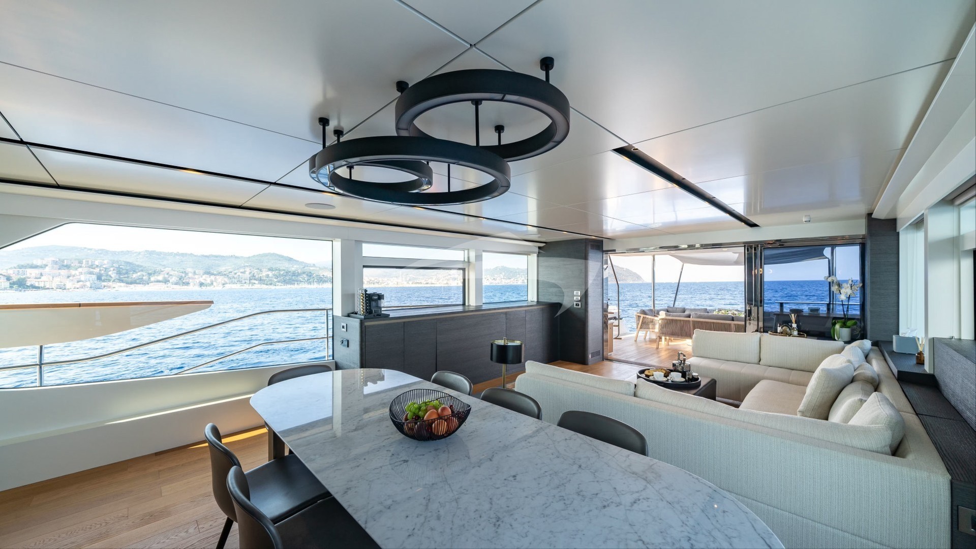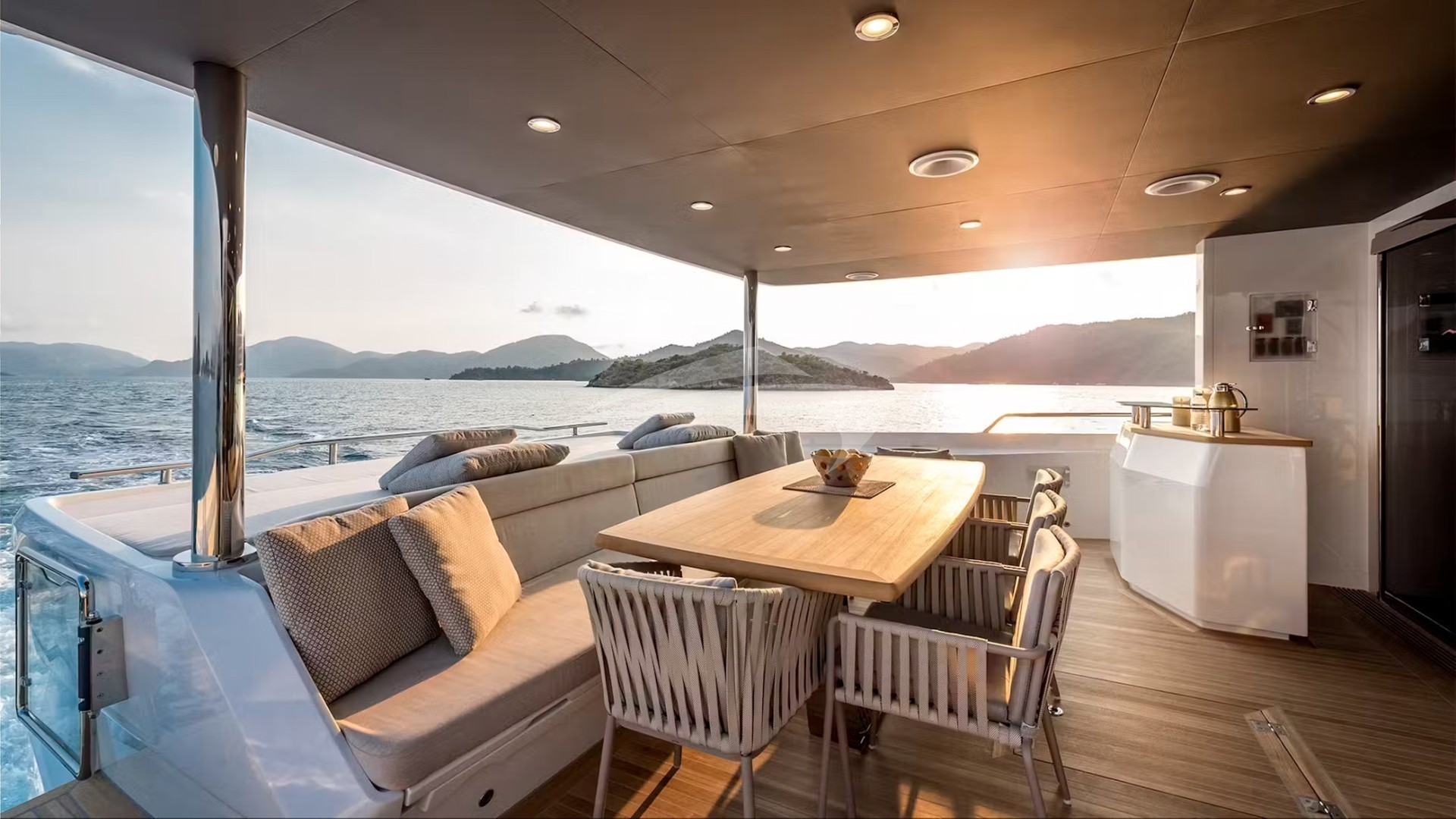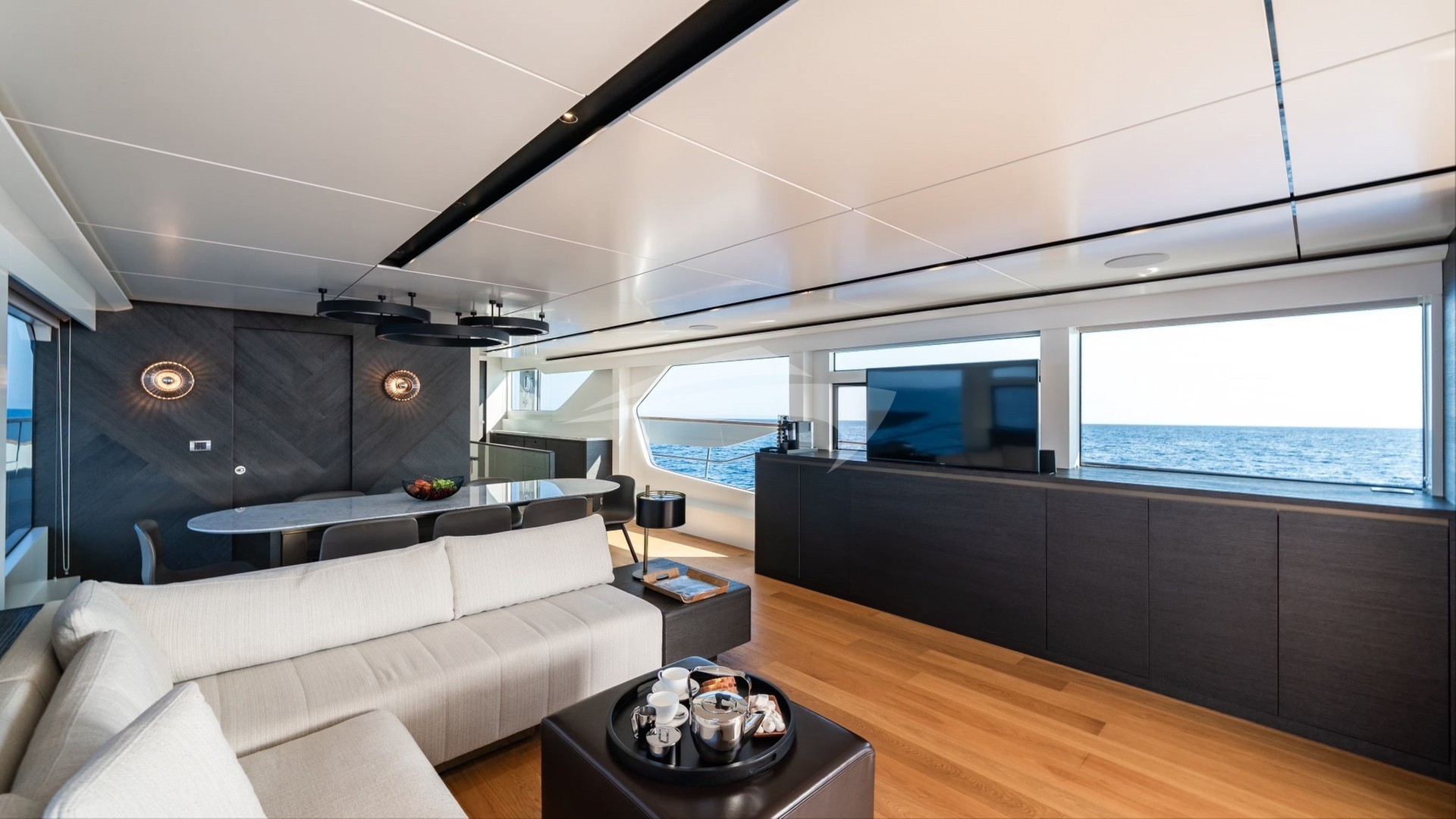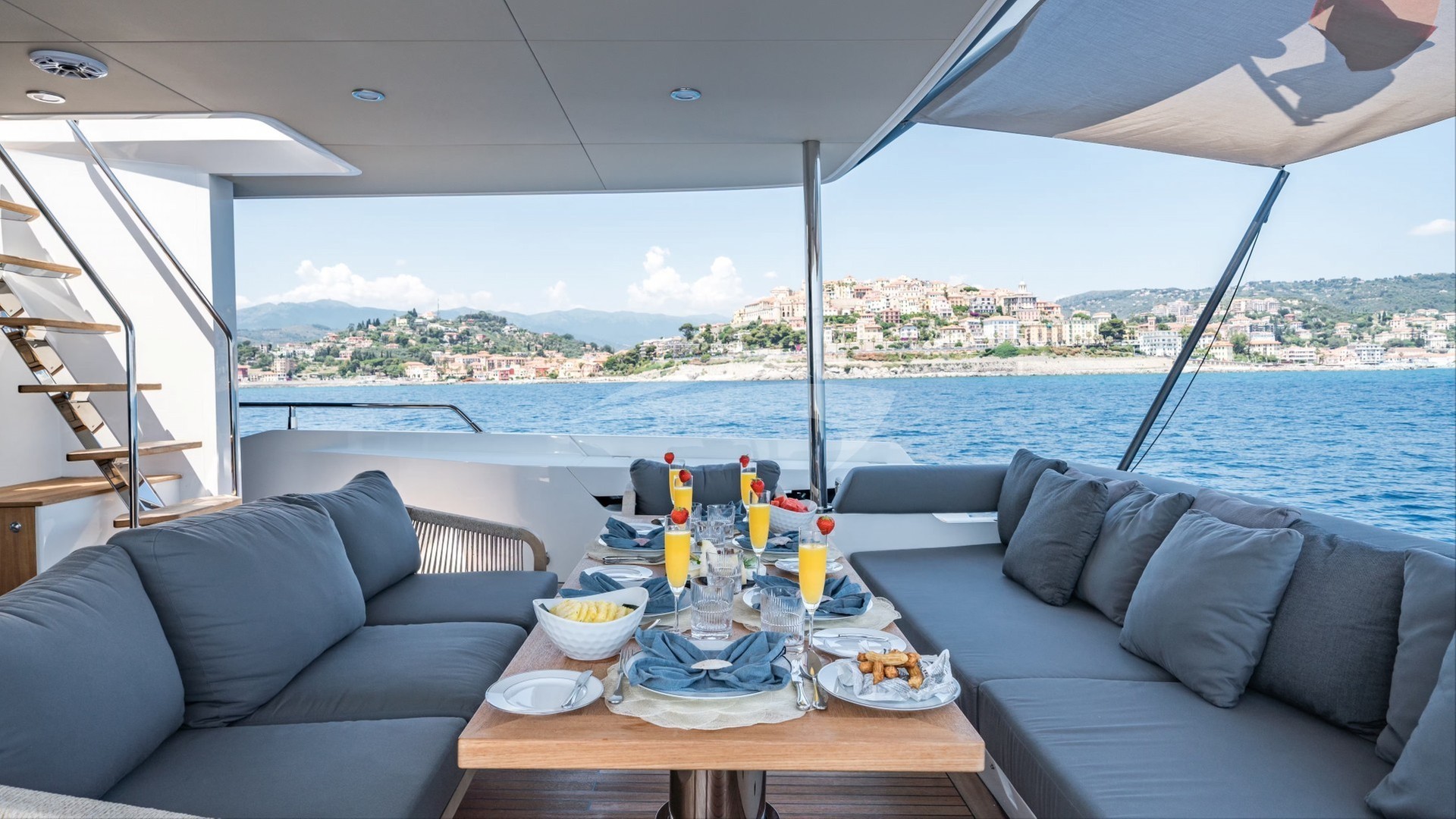 Boarding from the aft deck, guests will find comfortable seating for eight and adjustable tables that can be raised or lowered depending on their needs. The aft deck also boasts a small bar with a fridge, perfect for refreshing drinks on hot summer days. From here, guests can step inside the main salon, which features a large sofa that easily seats six people and a dining table that comfortably accommodates eight guests. The salon is flooded with natural light thanks to floor-to-ceiling windows, providing breathtaking views of the surrounding scenery.