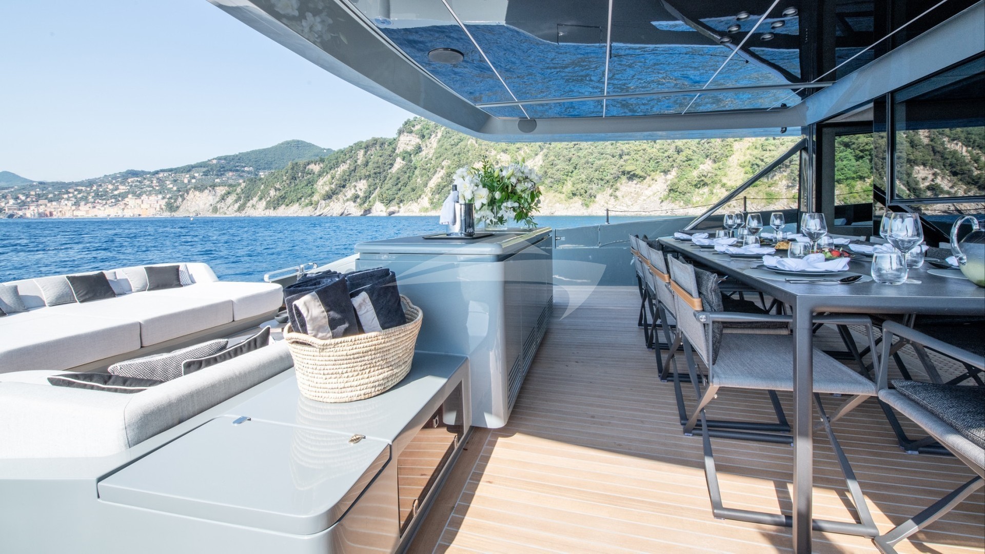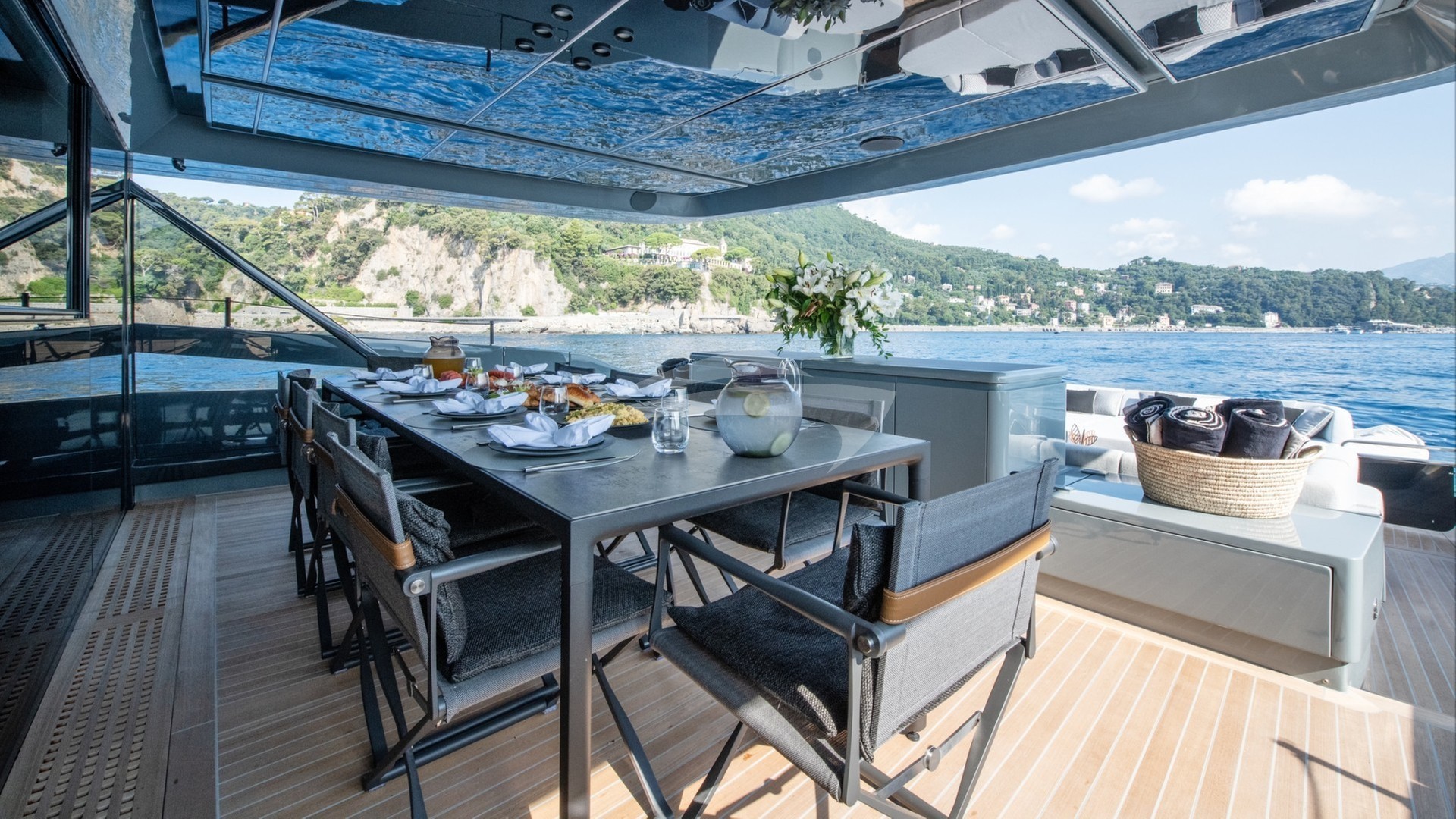 MARTITA yacht’s main deck aft is a wonderful alfresco dining and lounging area that connects to a fabulous extended swim platform to provide direct access to the sea.