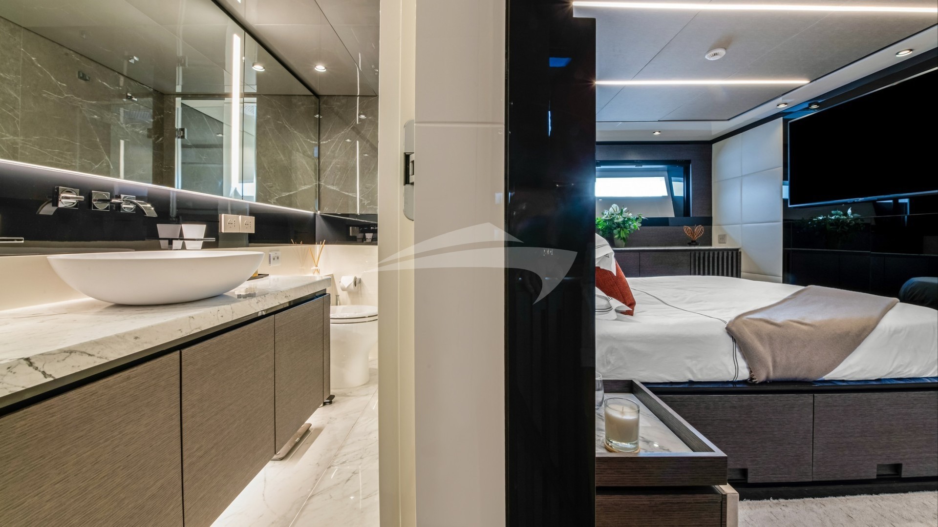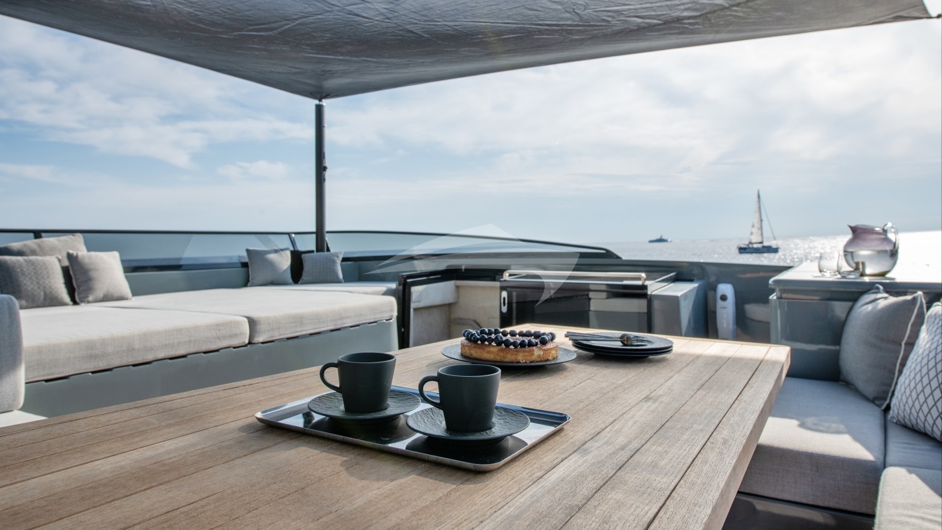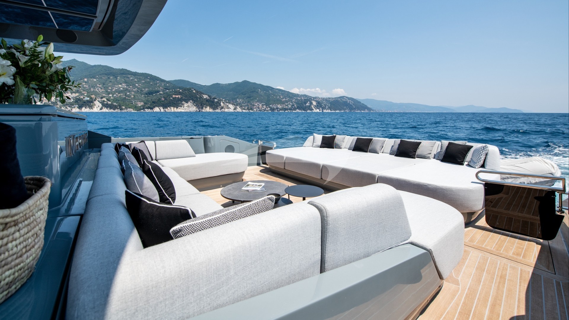 In addition to the main deck outdoor space, guests can also soak up some rays on the many sunpads on the flybridge or lie beneath the shade of the Bimini respite from the sun.