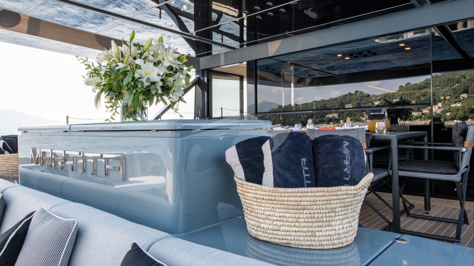 Even when inside, the connection to the sea is strong thanks to the large windows in the salon. MARTITA yacht also comes with a selection of gym gear, including yoga mats, dumbbells, and bands for keeping in shape while away.