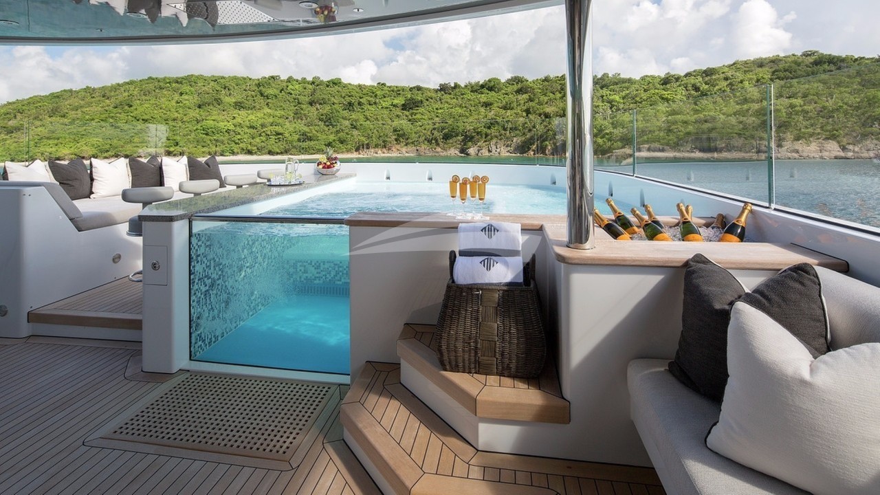 Water enthusiasts will revel in the array of toys available, including a standup jet ski, paddleboards, and a wakeboard. The 21ft Novurania tender with a 260hp engine promises exciting excursions and easy shore access. Back on board, guests can enjoy the beach club, light fishing gear, and the indulgent on-deck Jacuzzi.