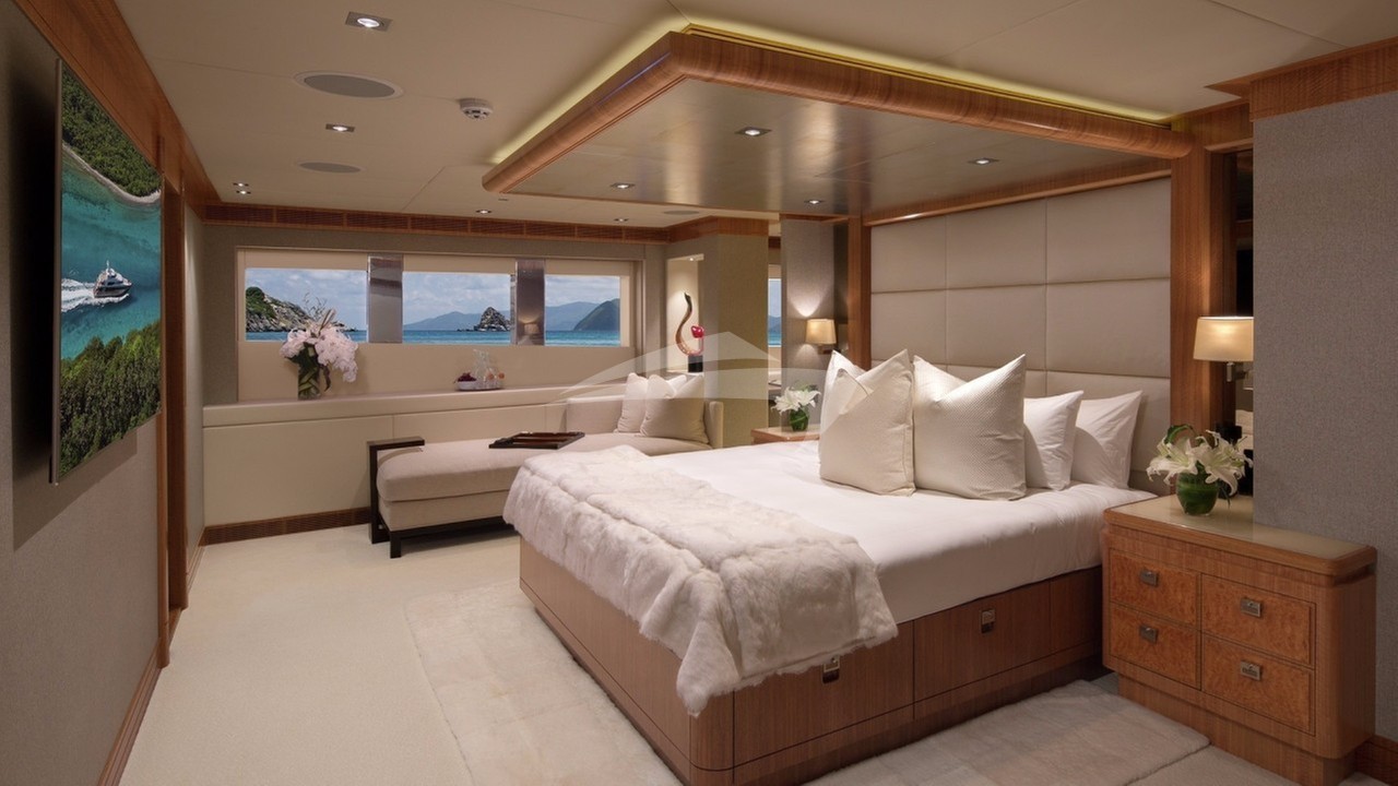 MUCHOS MAS offers unparalleled comfort and style for up to 11 discerning guests across 5 lavishly appointed cabins. The full-beam master suite is a true sanctuary, featuring an owner's office and Smart Glass Privacy Film windows. The en-suite bathroom is a masterpiece in itself, with a central 2-person shower and a state-of-the-art Vichy shower, creating a spa-like experience enhanced by a central skylight connected to the foredeck moon jacuzzi.
