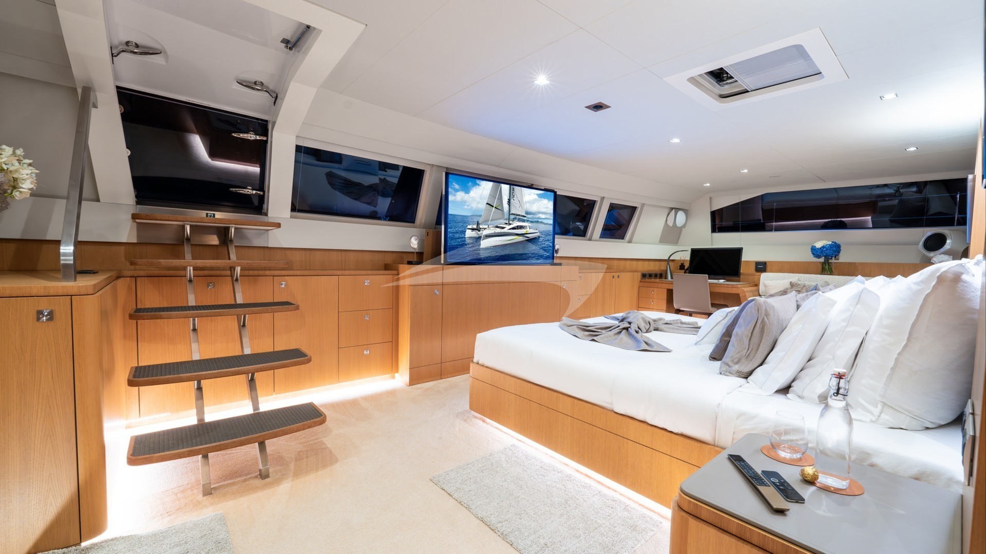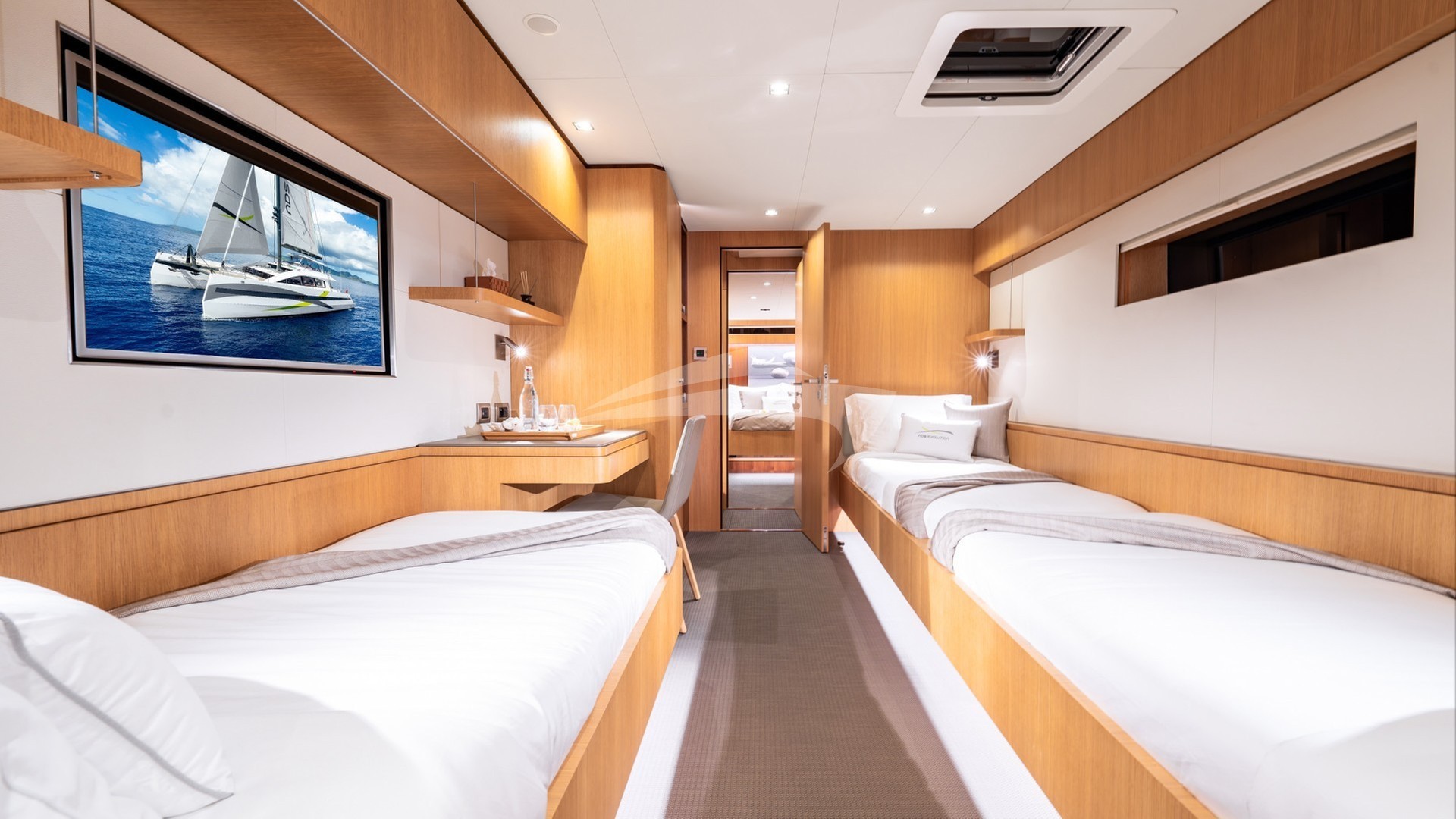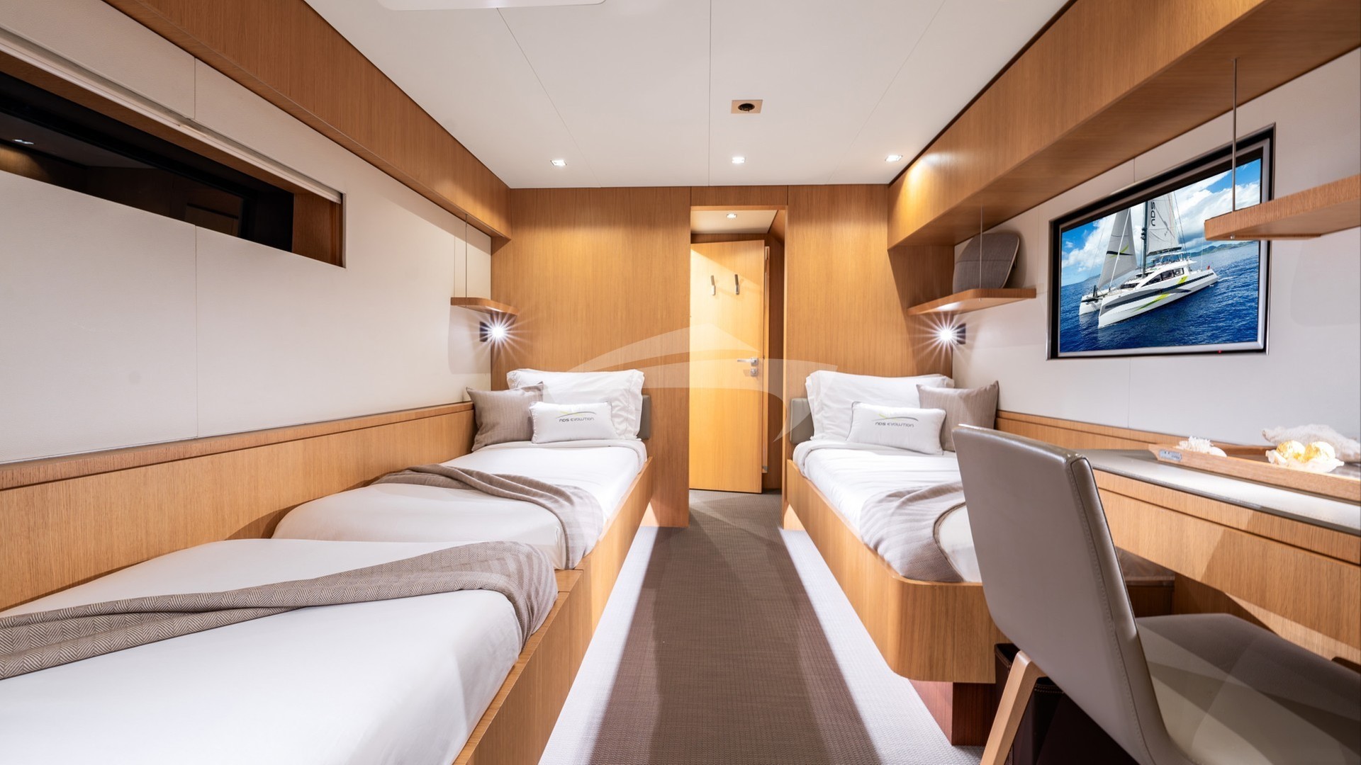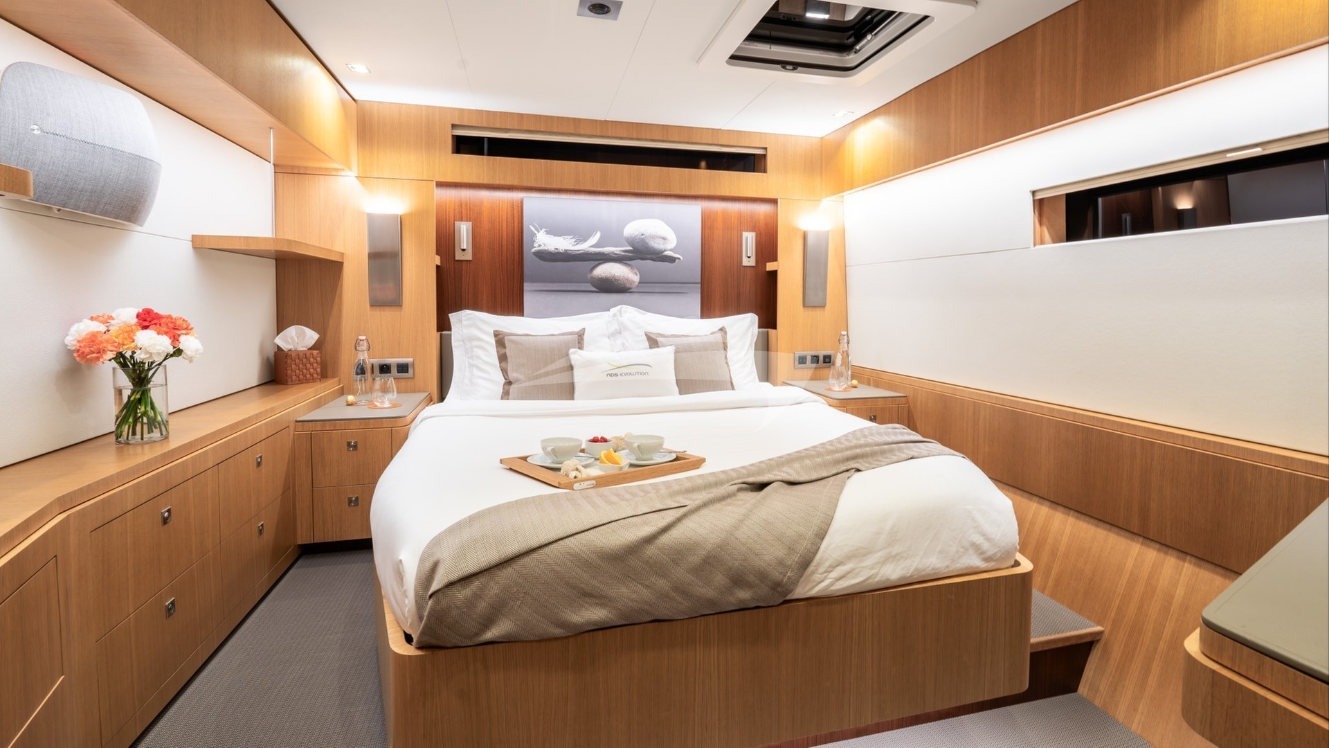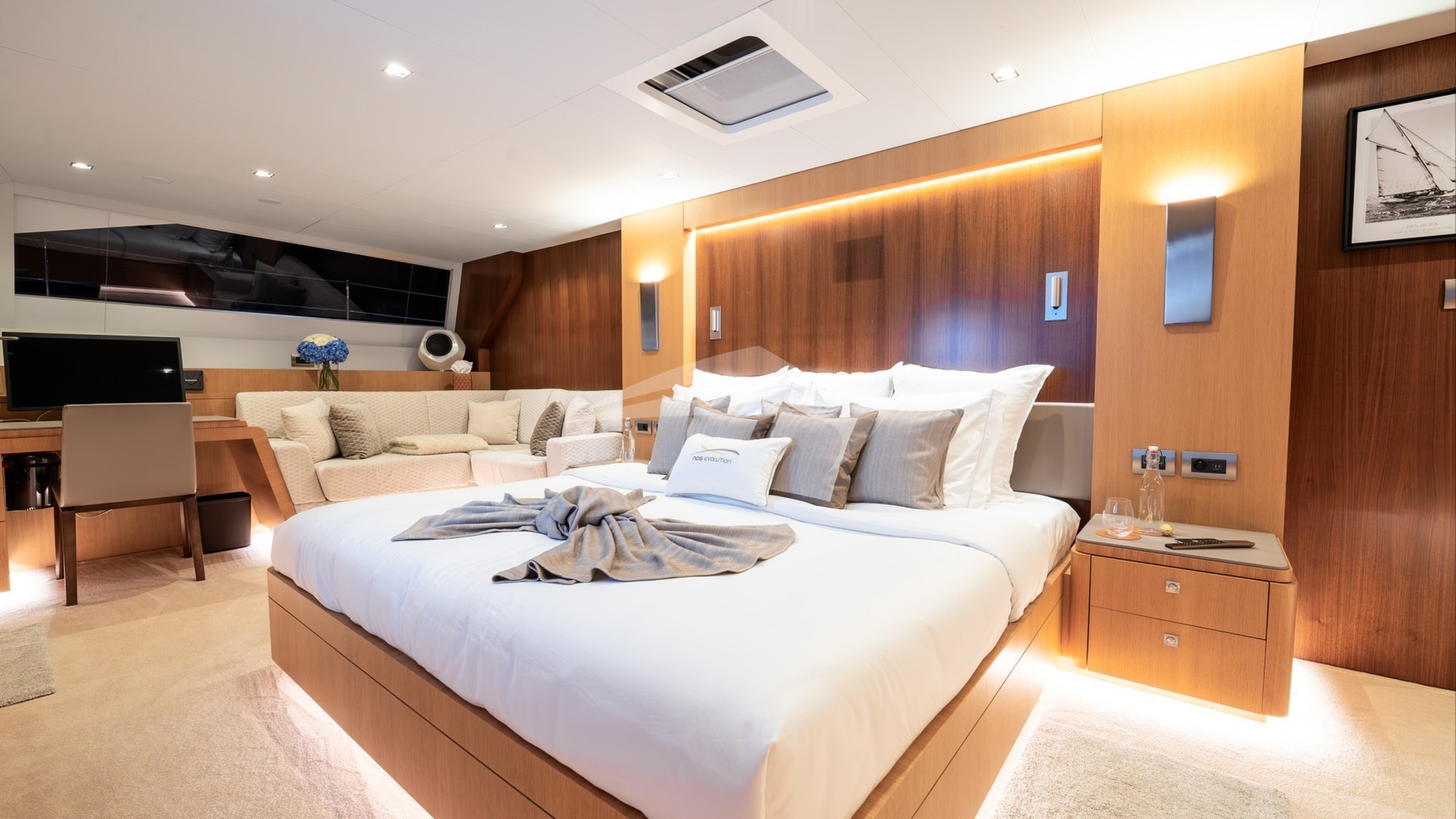 NDS EVOLUTION can accommodate up to 9 guests in four beautifully appointed staterooms below deck. The full beam Master Stateroom with its panoramic view features an office desk and a serene corner lounging area with a private access to the forward deck. The guest staterooms consist of two Double and one Triple stateroom, making NDS EVOLUTION an excellent option for families with kids.