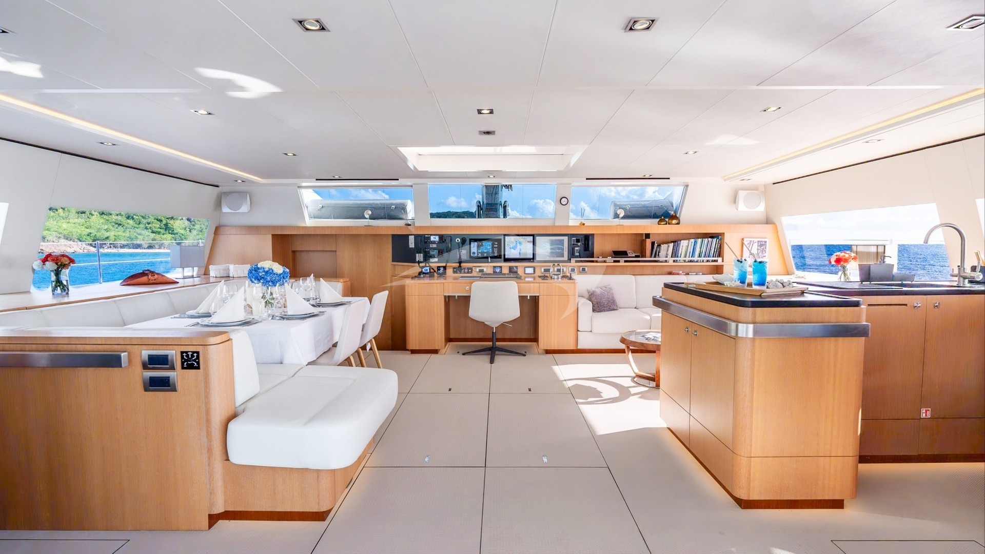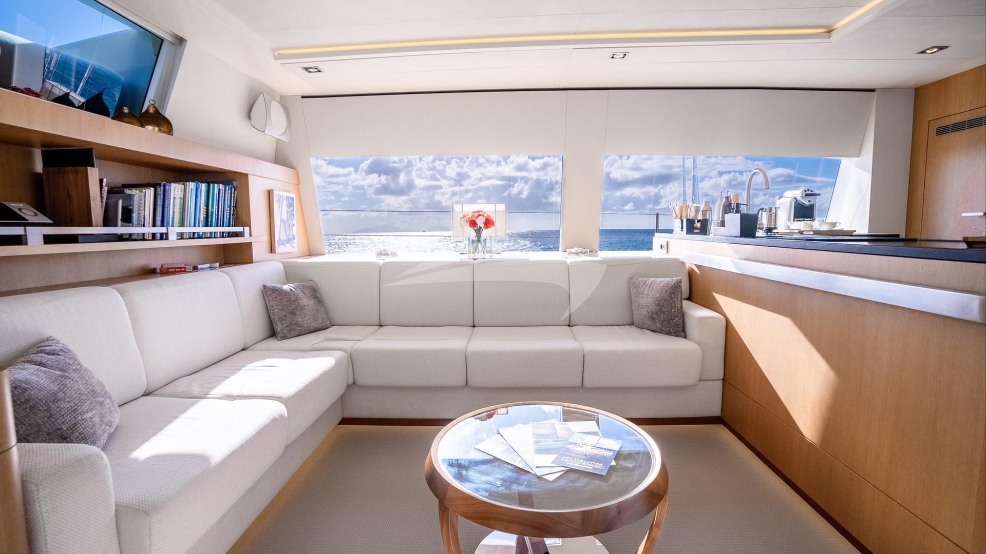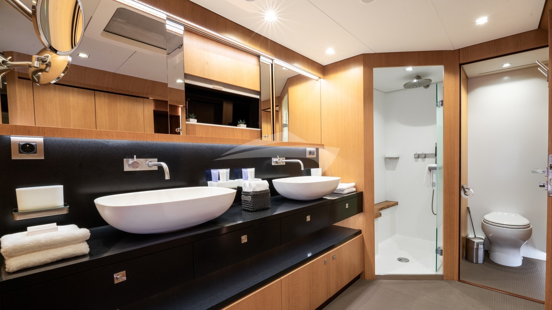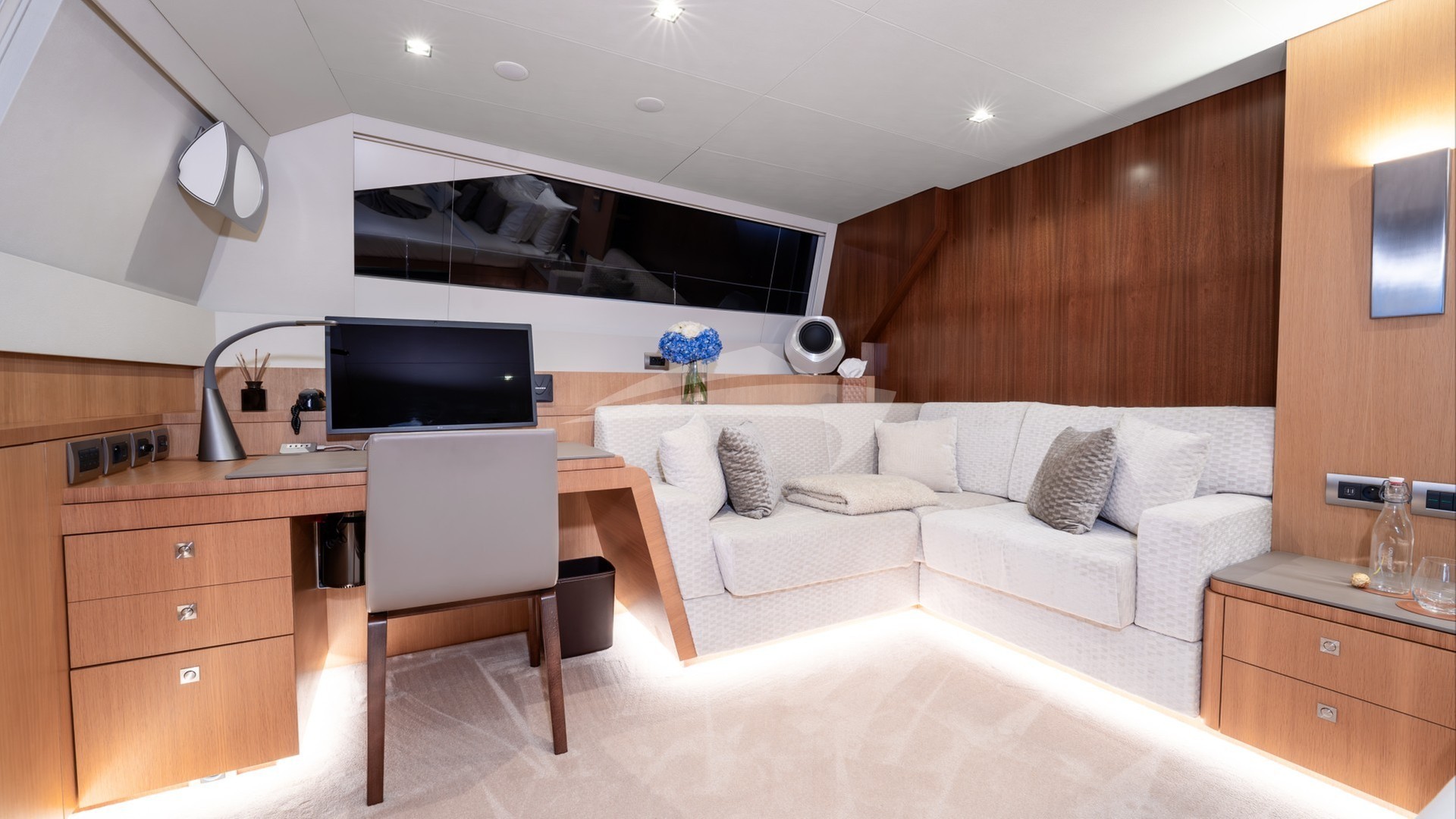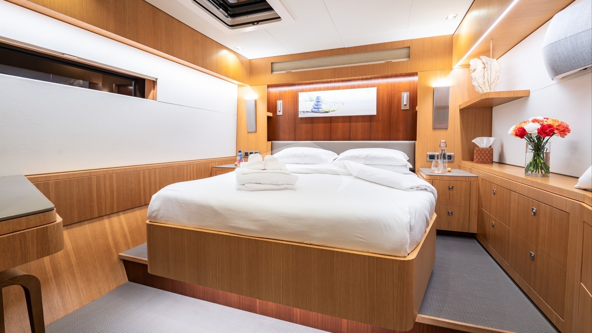 NDS EVOLUTION can accommodate up to 9 guests in four beautifully appointed staterooms below deck. The full beam Master Stateroom with its panoramic view features an office desk and a serene corner lounging area with a private access to the forward deck. The guest staterooms consist of two Double and one Triple stateroom, making NDS EVOLUTION an excellent option for families with kids.