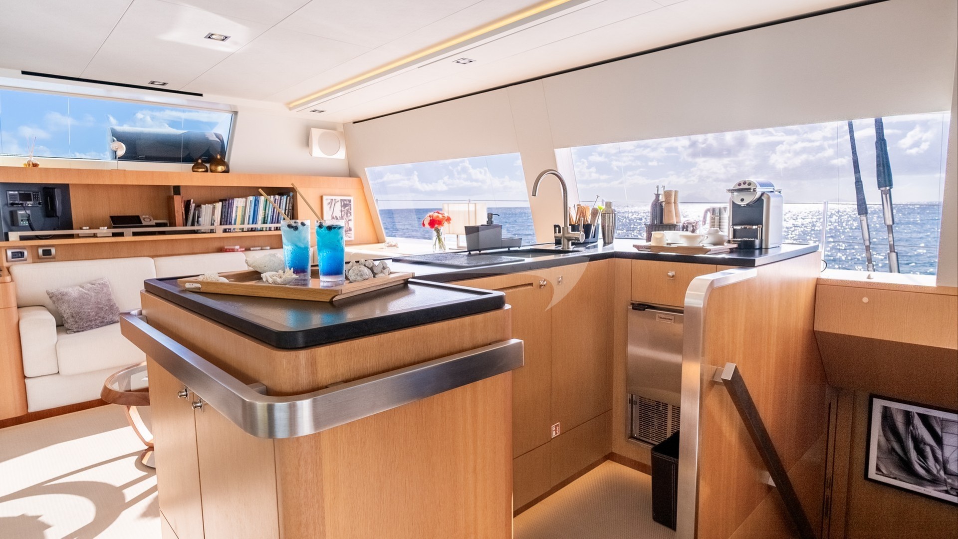 After a day on the water, guests can take advantage of the trampoline beds located on the bow, an ideal spot for soaking up the sun or enjoying a starlit evening. The spacious flybridge offers 360- degree view and is equipped with comfortable lounging, making it a perfect spot for cocktails and conversations.
