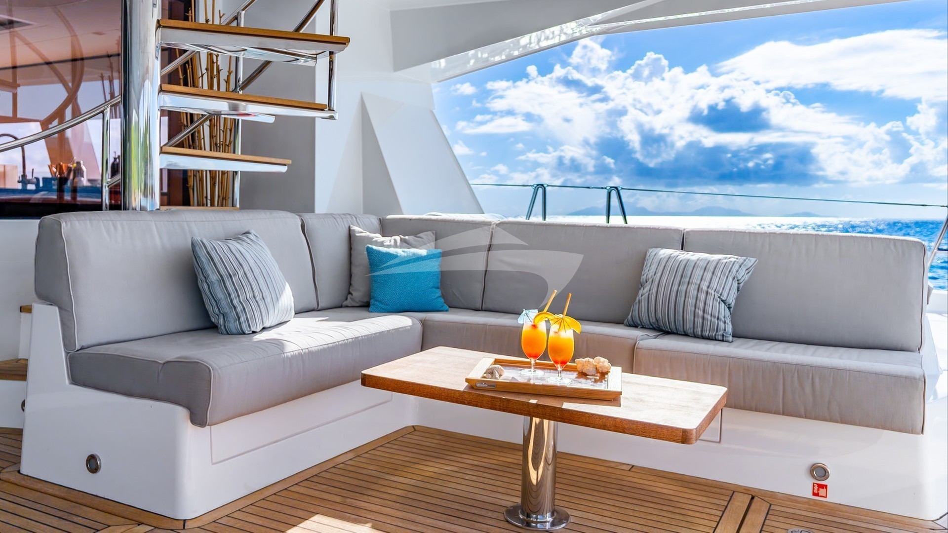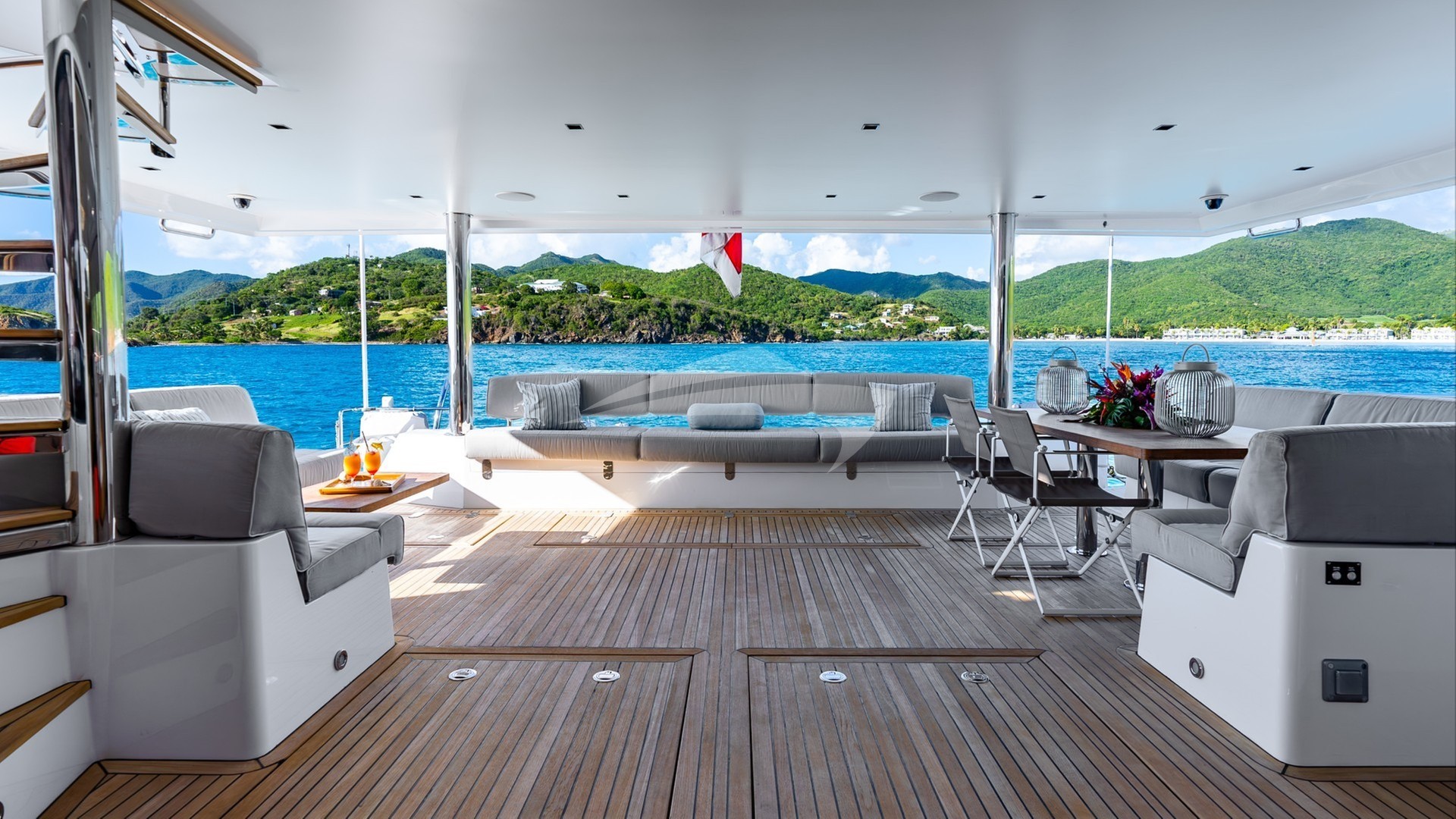 After a day on the water, guests can take advantage of the trampoline beds located on the bow, an ideal spot for soaking up the sun or enjoying a starlit evening. The spacious flybridge offers 360-degree view and is equipped with comfortable lounging, making it a perfect spot for cocktails and conversations.